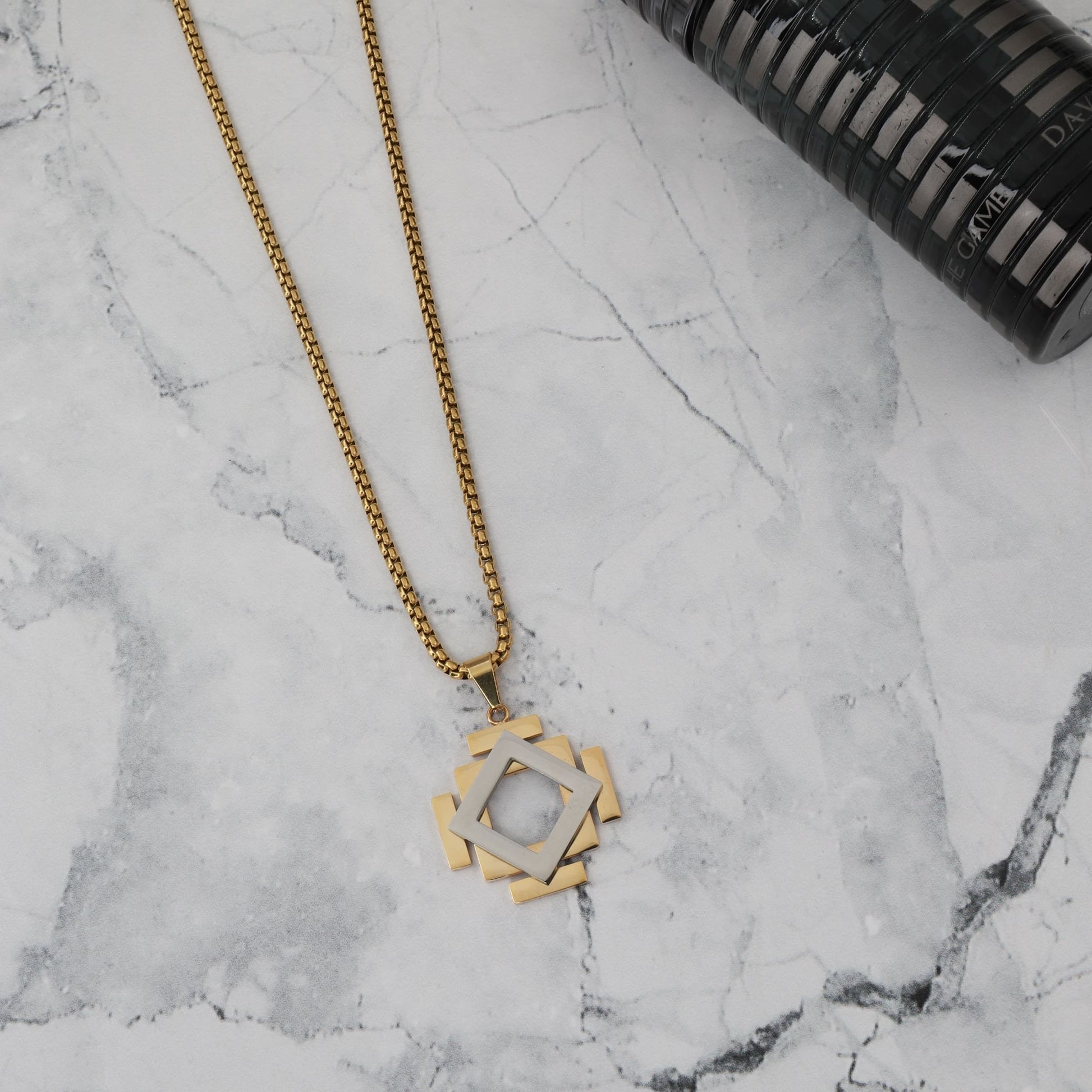 Κολιέ από ανοξείδωτο ατσάλι σε διπλά επιχρυσωμένο 18Κ χρυσό, με ιδιαίτερη αλυσίδα και εντυπωσιακό μενταγιόν σε σχήμα ρόμβου με ασημί λεπτομέρειες, μέγεθος 4,5 cm. Ένα κομψό και μοντέρνο κόσμημα που προσθέτει λάμψη και μοναδικότητα στο ντύσιμό σας, ιδανικό για καθημερινή χρήση αλλά και για ειδικές περιστάσεις. Μια ξεχωριστή επιλογή που ολοκληρώνει με φινέτσα κάθε εμφάνιση.
