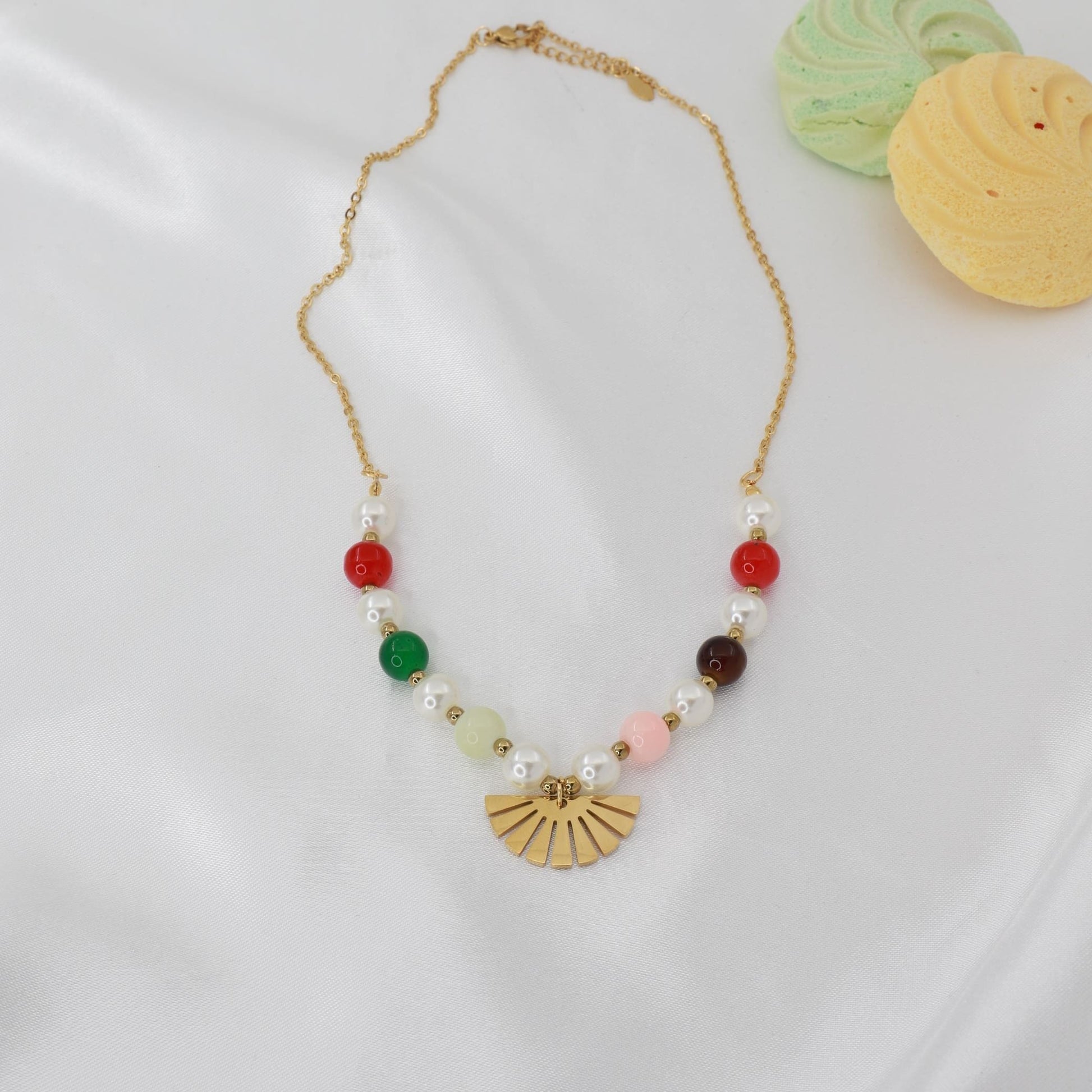 Κολιέ διακοσμημένο με πέρλες και χάντρες σε υπέροχα χρώματα που προσφέρει ένα εντυπωσιακό αποτέλεσμα. Το μενταγιόν προσθέτει μια ακόμα πινελιά κομψότητας. Η ποικιλία των χρωμάτων στις χάντρες προσθέτει έναν δυναμικό και ζωηρό χαρακτήρα στο κολιέ, καθιστώντας το ιδανικό για να φωτίσει και να δώσει έναν αέρα φρεσκάδας σε κάθε εμφάνιση.