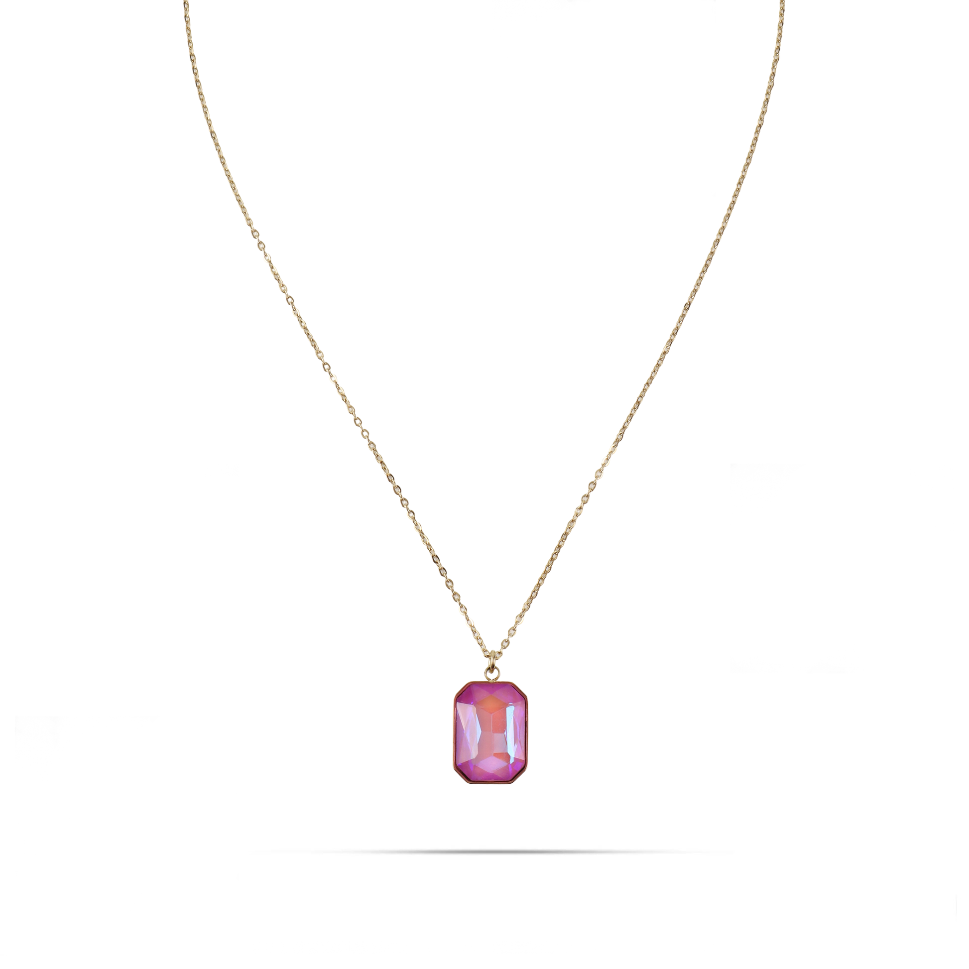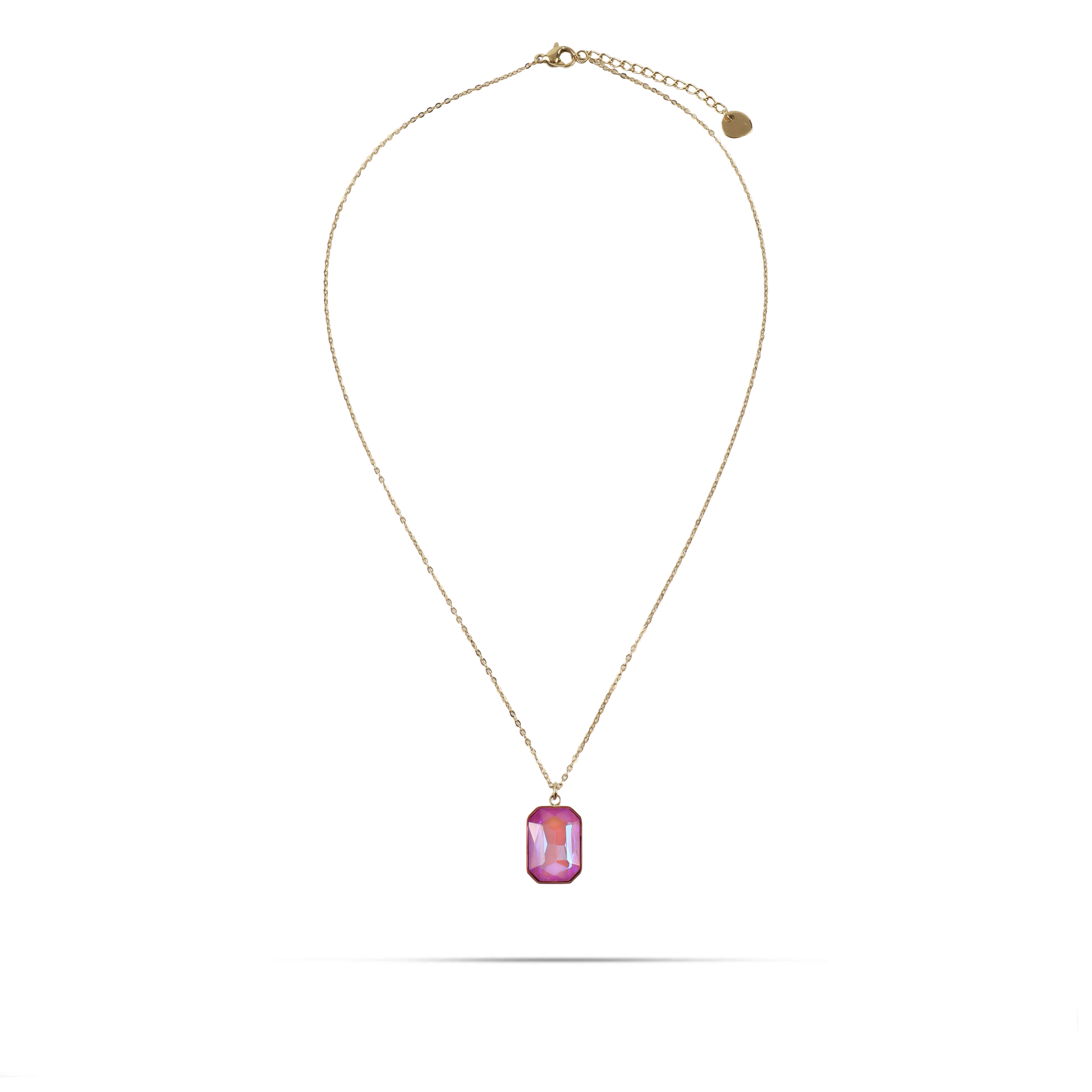 Λαμπερό κολιέ από ανοξείδωτο ατσάλι με ορθογώνιο μενταγιόν, διακοσμημένο με μια εντυπωσιακή ροζ πέτρα Zircon. Η ροζ απόχρωση χαρίζει μια απαλή και ρομαντική διάθεση, ενώ το κομψό γεωμετρικό σχέδιο του μενταγιόν προσθέτει μοντέρνο χαρακτήρα. Ένα ανθεκτικό και διαχρονικό κόσμημα που φωτίζει κάθε σας εμφάνιση, από το πρωί έως το βράδυ.