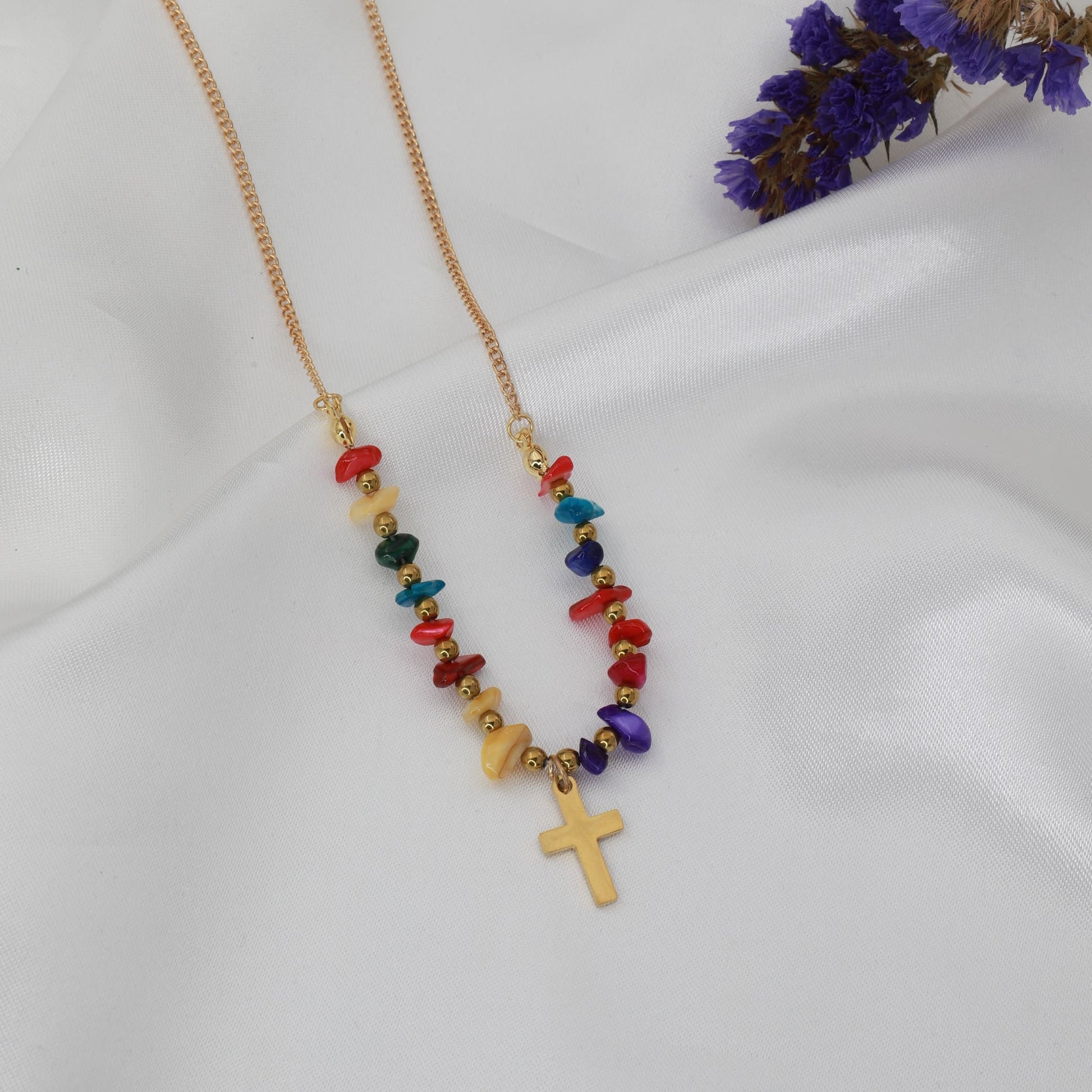 Κολιέ σταυρός από ανοξείδωτο ατσάλι διακοσμημένο με πολύχρωμες χάντρες, που χαρίζουν ζωντάνια και ιδιαίτερο χαρακτήρα στο κόσμημα. Ο σταυρός, ως διαχρονικό σύμβολο πίστης, συνδυάζεται αρμονικά με την παιχνιδιάρικη λάμψη των χαντρών, δημιουργώντας ένα ξεχωριστό και κομψό αισθητικό αποτέλεσμα. Αυτό το εντυπωσιακό κολιέ μπορεί να φορεθεί τόσο στην καθημερινότητα όσο και σε πιο ιδιαίτερες περιστάσεις, αναδεικνύοντας κάθε εμφάνιση με στυλ και φρεσκάδα. Επιπλέον, αποτελεί μια υπέροχη επιλογή δώρου με ιδιαίτερο νόημα και μοναδική γοητεία.