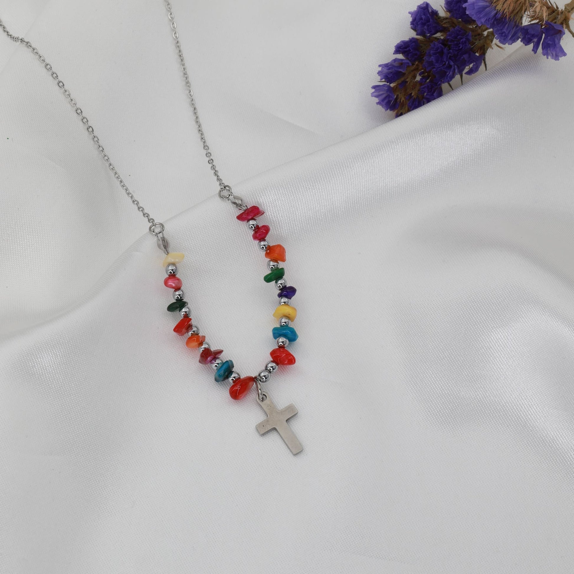 Κολιέ σταυρός από ανοξείδωτο ατσάλι διακοσμημένο με πολύχρωμες χάντρες, που χαρίζουν ζωντάνια και ιδιαίτερο χαρακτήρα στο κόσμημα. Ο σταυρός, ως διαχρονικό σύμβολο πίστης, συνδυάζεται αρμονικά με την παιχνιδιάρικη λάμψη των χαντρών, δημιουργώντας ένα ξεχωριστό και κομψό αισθητικό αποτέλεσμα. Αυτό το εντυπωσιακό κολιέ μπορεί να φορεθεί τόσο στην καθημερινότητα όσο και σε πιο ιδιαίτερες περιστάσεις, αναδεικνύοντας κάθε εμφάνιση με στυλ και φρεσκάδα. Επιπλέον, αποτελεί μια υπέροχη επιλογή δώρου με ιδιαίτερο νόημα και μοναδική γοητεία.