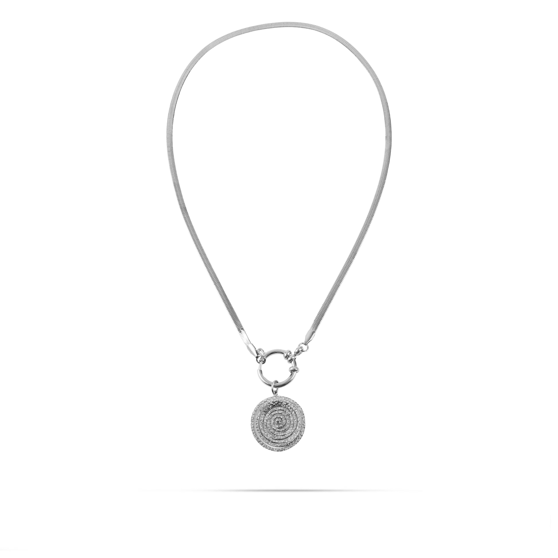 Κολιέ από ανοξείδωτο ατσάλι σε ασημί χρώμα, με φανταστικό σφυρήλατο σχέδιο στο μενταγιόν. Το σφυρήλατο σχέδιο προσδίδει μια μοναδική αίσθηση υψηλής χειροποίητης αισθητικής και προσθέτει ένα εντυπωσιακό στοιχείο στο κολιέ. Κατασκευασμένο από ανοξείδωτο ατσάλι, είναι ανθεκτικό και ιδανικό για κάθε περίσταση, από τις καθημερινές σας εμφανίσεις μέχρι τις ειδικές περιστάσεις.