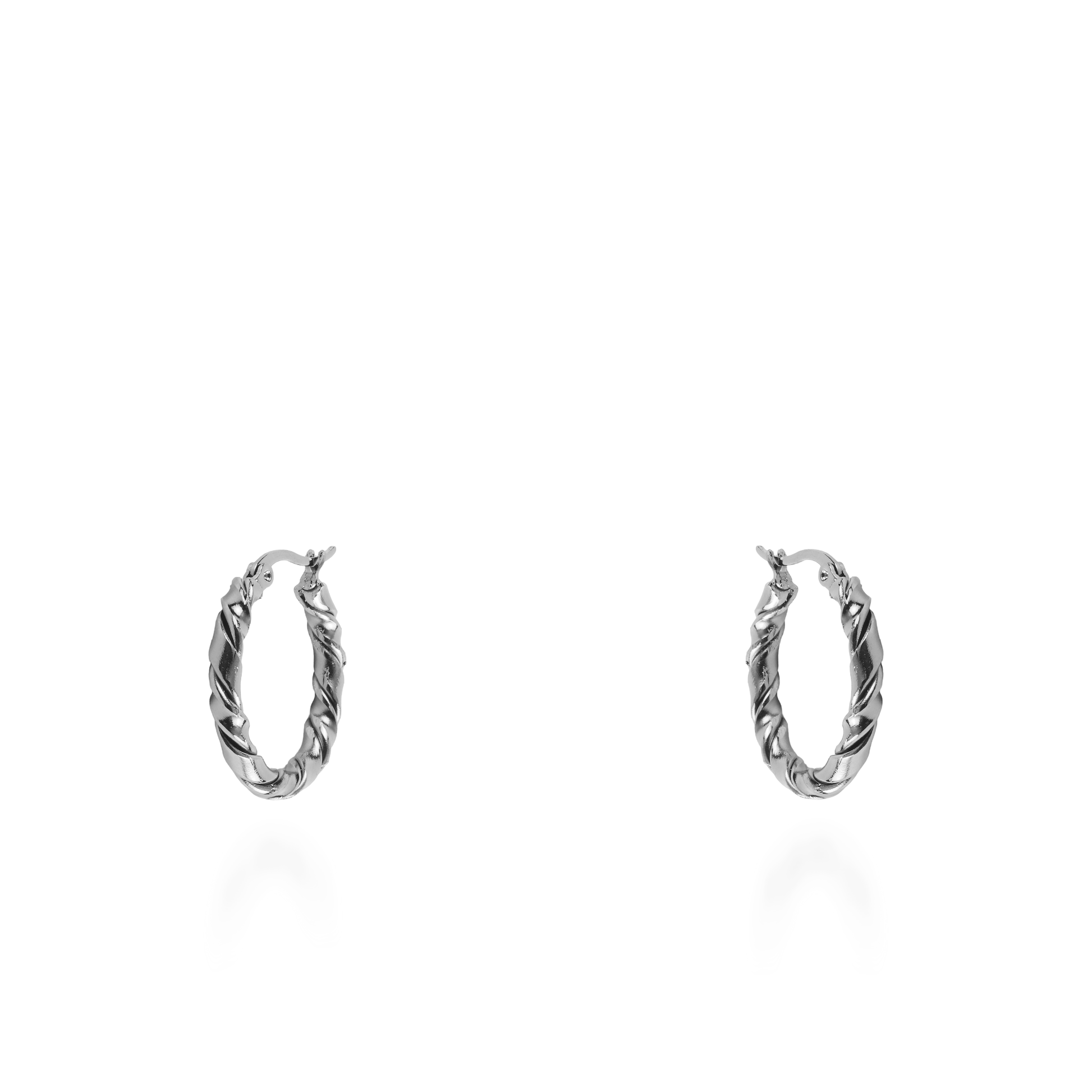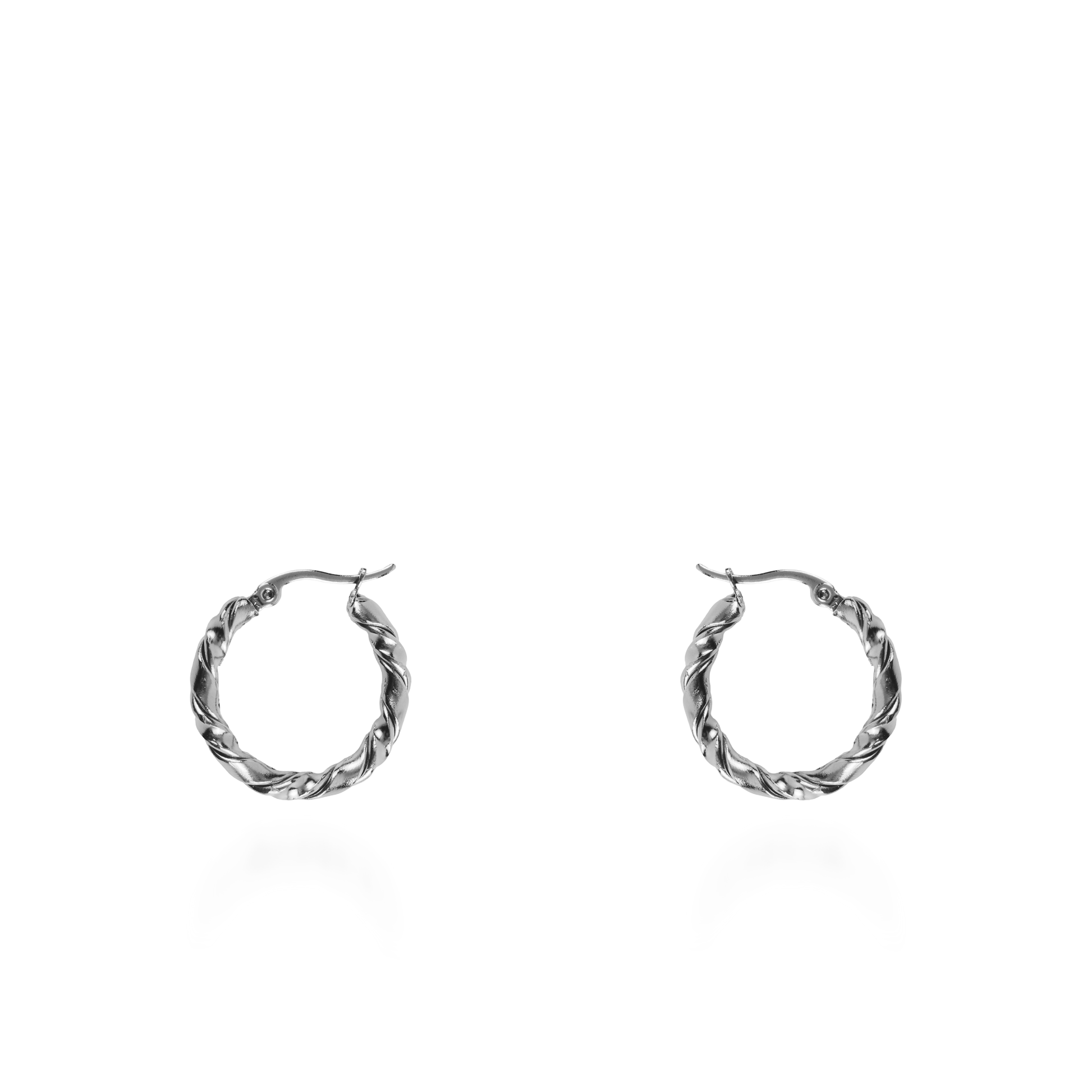 Σκουλαρίκια κρίκοι από ανοξείδωτο ατσάλι σε κομψό ασημί χρώμα, με ιδιαίτερο στριφογυριστό σχέδιο που αποπνέει σύγχρονο στυλ και διακριτική πολυτέλεια. Η λαμπερή ασημί απόχρωση τους τα καθιστά ευέλικτα και εύκολα στον συνδυασμό με κάθε look, από το καθημερινό έως το πιο επίσημο. Ένα εντυπωσιακό κόσμημα που θα αναδείξει τη γοητεία σας σε κάθε περίσταση.
