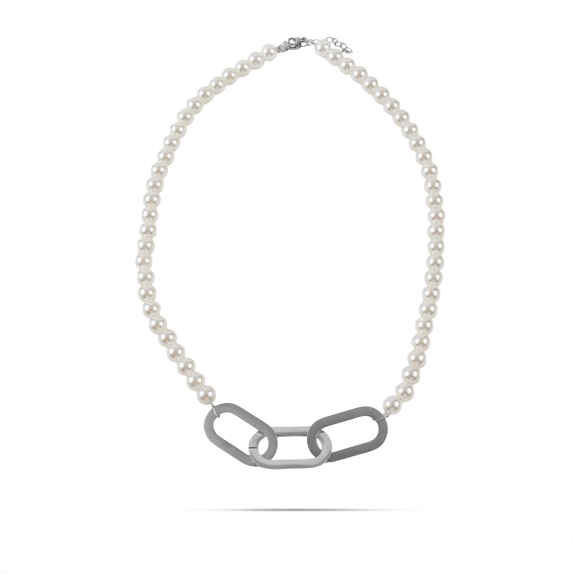 Χειροποίητη αλυσίδα λαιμού σε ασημί χρώμα με πέρλες και τρεις μεγάλους οβάλ κρίκους η οποία προσφέρει έναν εκλεπτυσμένο συνδυασμό κομψότητας και μοναδικού σχεδιασμού. Οι πέρλες προσθέτουν φινέτσα και κομψότητα, ενώ οι μεγάλοι οβάλ κρίκοι δημιουργούν ένα εντυπωσιακό και ενδιαφέρον στοιχείο. Η αλυσίδα αυτή είναι ιδανική για να προσθέσετε φινέτσα και κομψότητα σε ειδικές περιστάσεις ή στην καθημερινότητά σας.