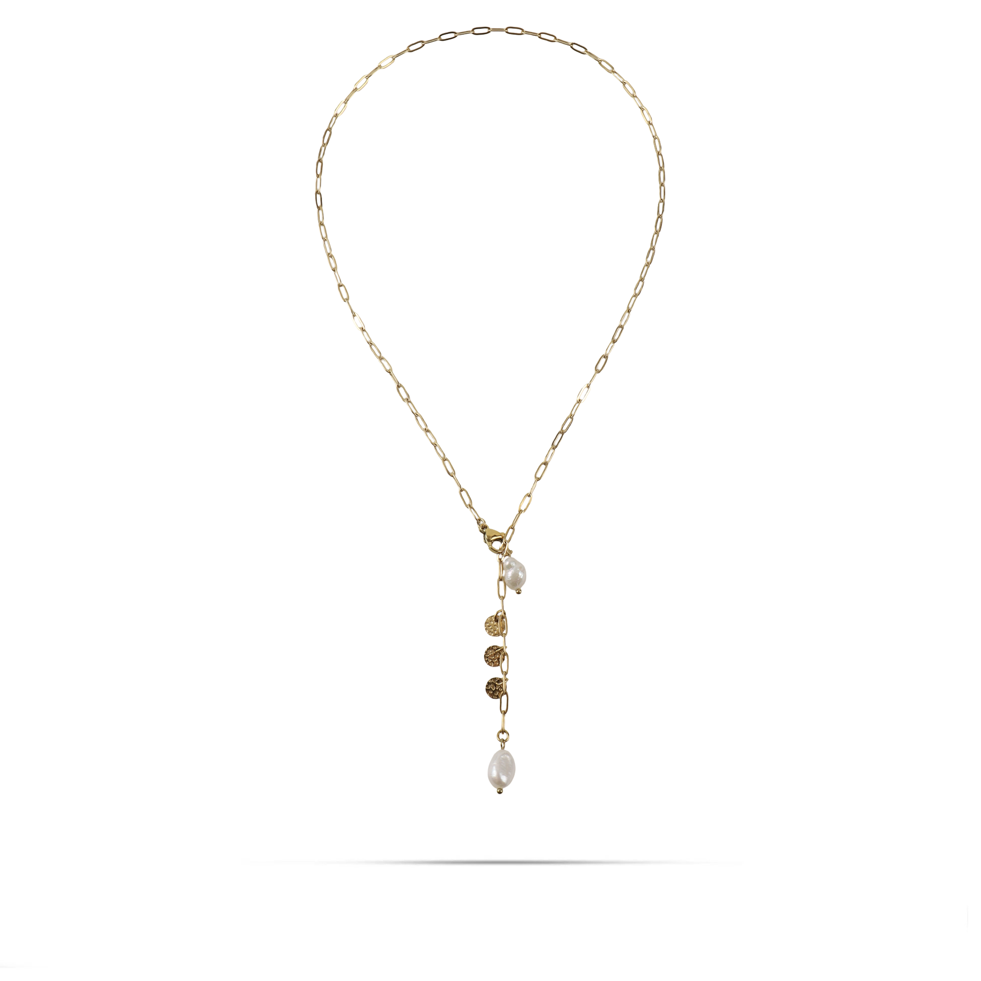 Κολιέ από ανοξείδωτο ατσάλι σε χρυσό χρώμα, διακοσμημένη με δύο λαμπερές λευκές πέρλες, που αντιπροσωπεύει την κομψότητα και την κλασική ομορφιά. Οι λευκές πέρλες προσθέτουν μια διακριτική λάμψη και εκφράζουν κομψότητα. Η ανοξείδωτη κατασκευή της αλυσίδας εξασφαλίζει ανθεκτικότητα και διάρκεια. Αυτό το κόσμημα είναι ιδανικό για καθημερινή χρήση ή για ειδικές περιστάσεις, προσδίδοντας έναν αέρα κομψότητας και φινέτσας σε κάθε εμφάνιση.
