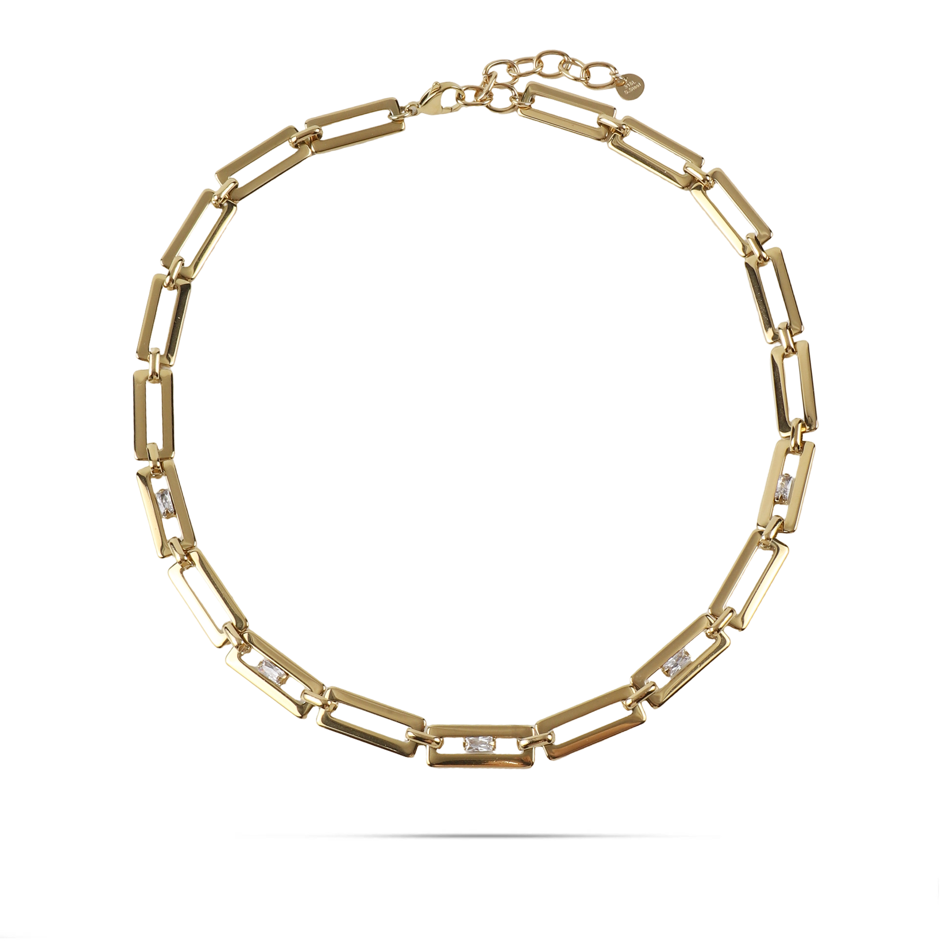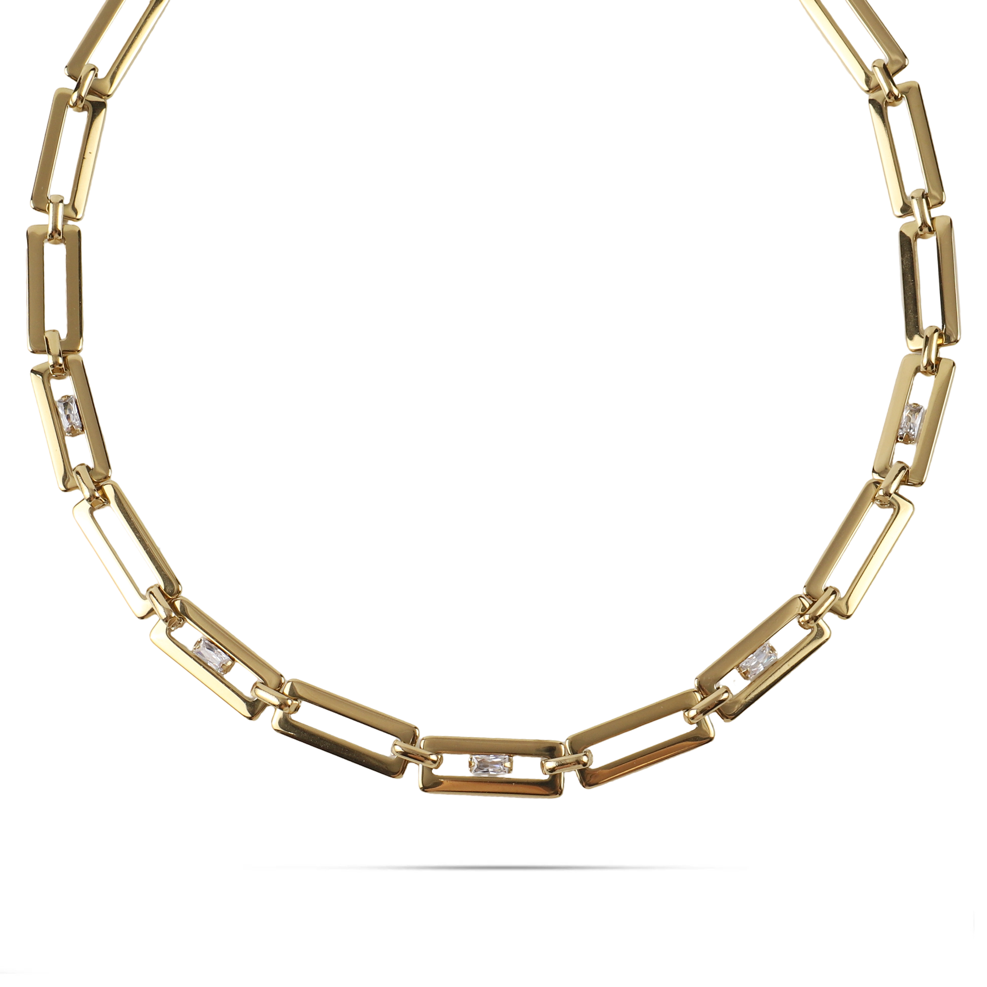 Αλυσίδα λαιμού από ανοξείδωτο ατσάλι σε χρυσό χρώμα με ορθογώνιους κρίκους διακοσμημένη από λαμπερές πέτρες Zircon σε λευκό χρώμα, η οποία δημιουργεί ένα κομψό και λαμπερό κόσμημα. Οι ορθογώνιοι κρίκοι προσθέτουν δομή και στυλ στο κολιέ. Η ανοξείδωτη κατασκευή εξασφαλίζει ανθεκτικότητα του κοσμήματος με τον χρόνο. Αυτή η αλυσίδα είναι κατάλληλη για να φορεθεί σε ειδικές περιστάσεις ή για να προσθέσει λάμψη στην καθημερινή σας εμφάνιση.