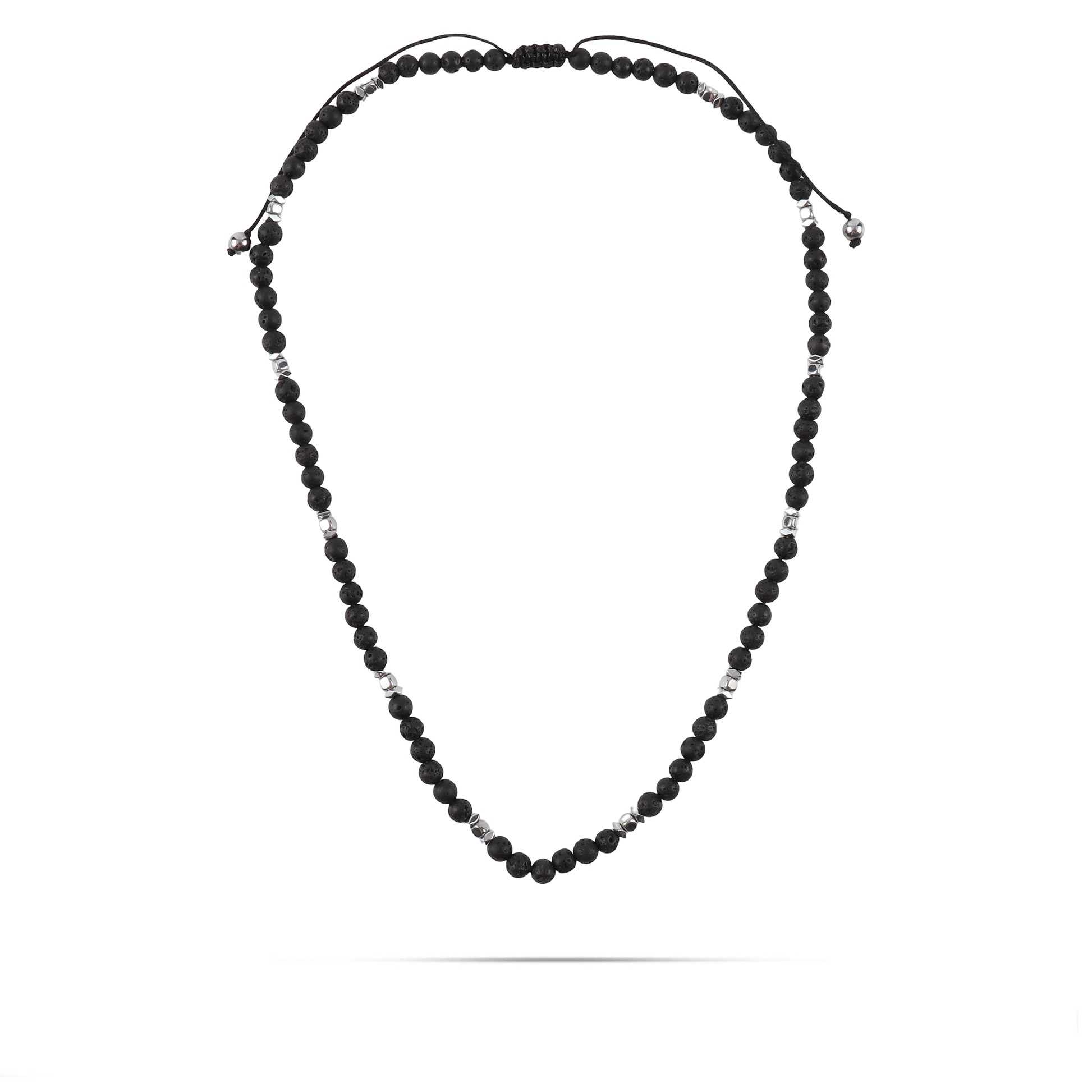 Ανδρικό χειροποίητο κολιέ με φυσικές ορυκτές πέτρες από μαύρη πέτρα λάβας (0,6cm), ασημί κύβο αιματίτη (0,4cm) και ασημί πολυγωνικό αιματίτη (0.4cm).