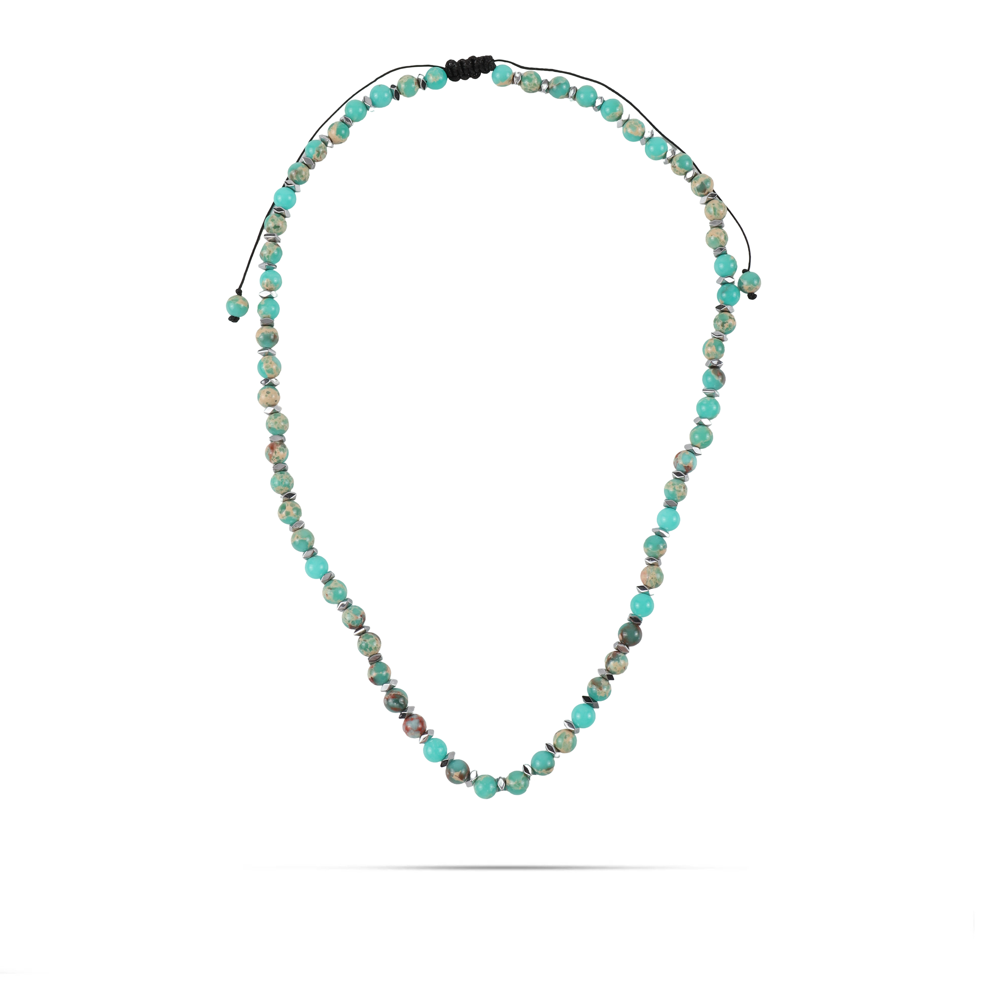 Ανδρικό χειροποίητο κολιέ με φυσικές ορυκτές πέτρες από τιρκουάζ ταγιέ αχάτη (0.6cm) και ασημί πολυγωνικό αιματίτη (0.4cm).