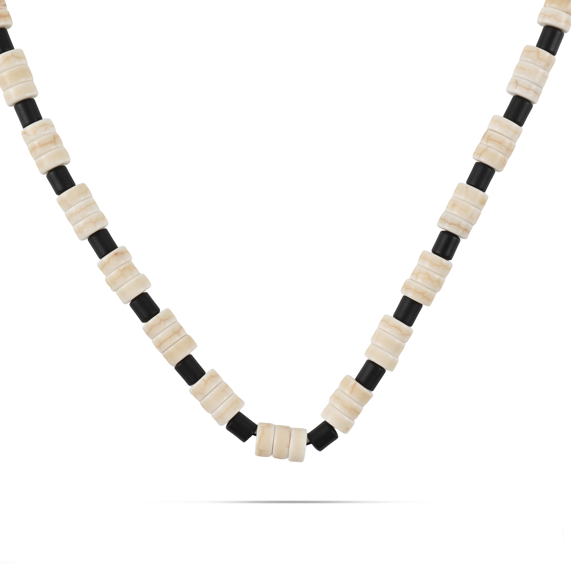Ανδρικό χειροποίητο κολιέ με φυσικές ορυκτές πέτρες από λευκές ροδέλες αχάτη (0,6cm) και μαύρο κύλινδρο αιματίτη (0.4cm).