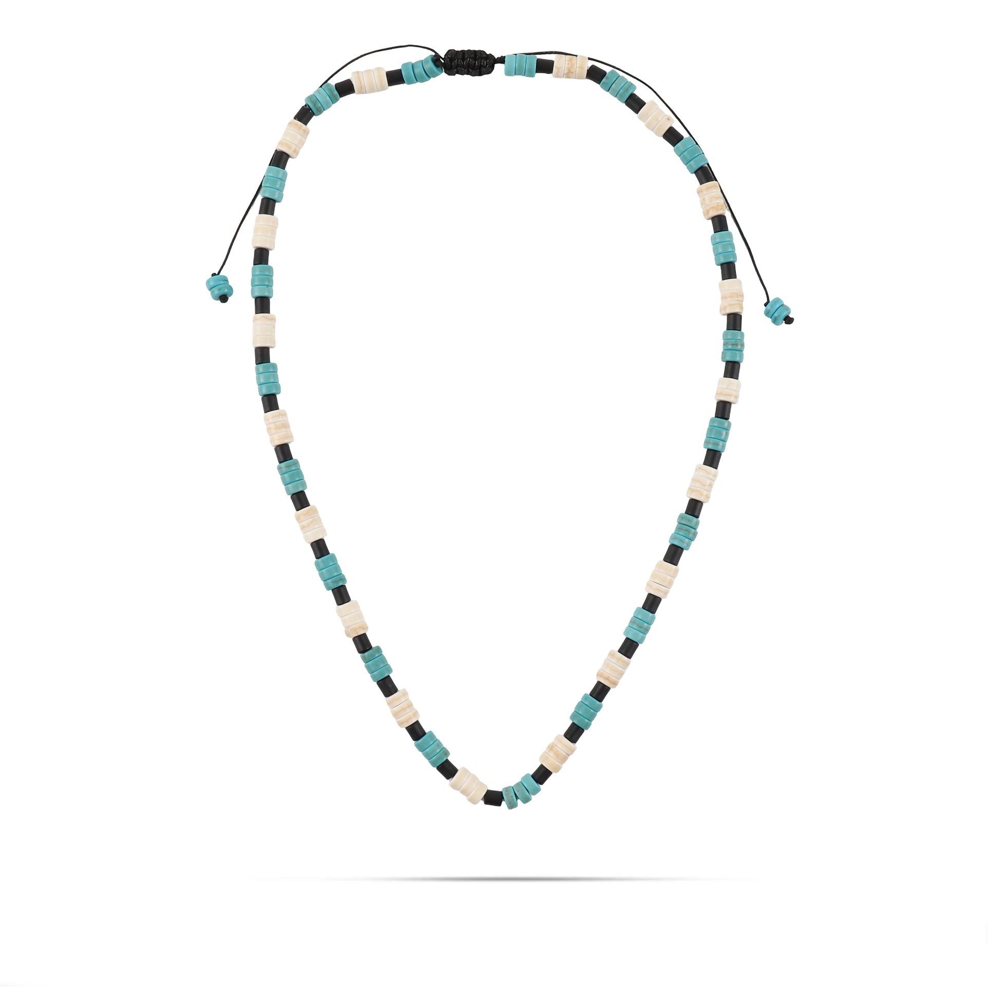 Ανδρικό χειροποίητο κολιέ με φυσικές ορυκτές πέτρες από τιρκουάζ ροδέλες χαολίτη (0,6cm), λευκές ροδέλες χαολίτη (0,6cm) και μαύρο κύλινδρο αιματίτη (0.4cm).