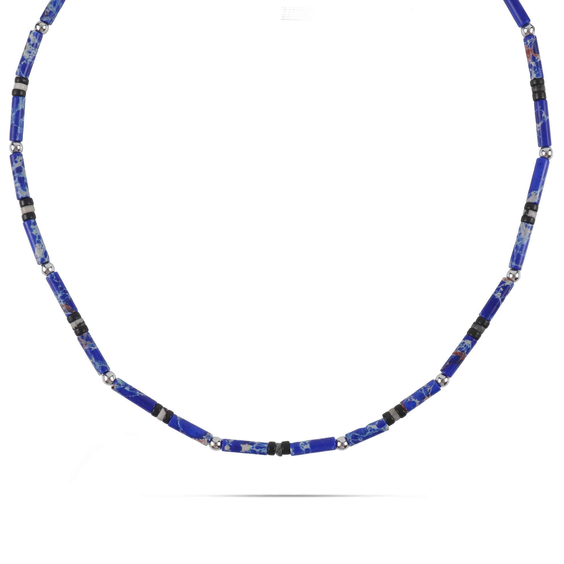 Ανδρικό χειροποίητο κολιέ με φυσικές ορυκτές πέτρες από μπλε κύλινδρο χαολίτη (0,4cm), μαύρη και γκρι ροδέλα χαολίτη (0,4cm) και ασημί μπίλια αιματίτη (0,4cm).