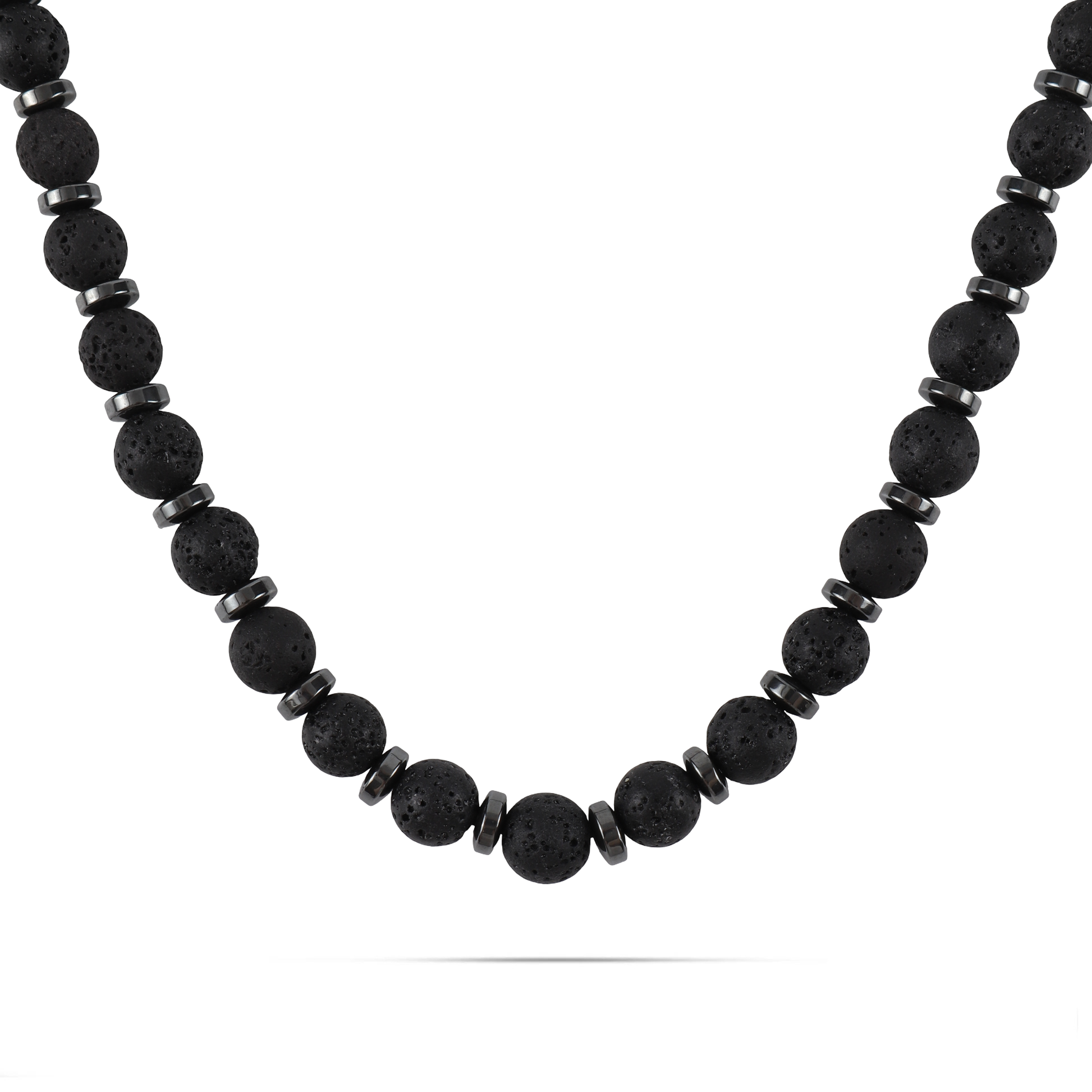 Ανδρικό χειροποίητο κολιέ με φυσικές ορυκτές πέτρες από λάβα (0,8cm) και ασημί πλακέ ροδέλα αιματίτη (0,6cm).