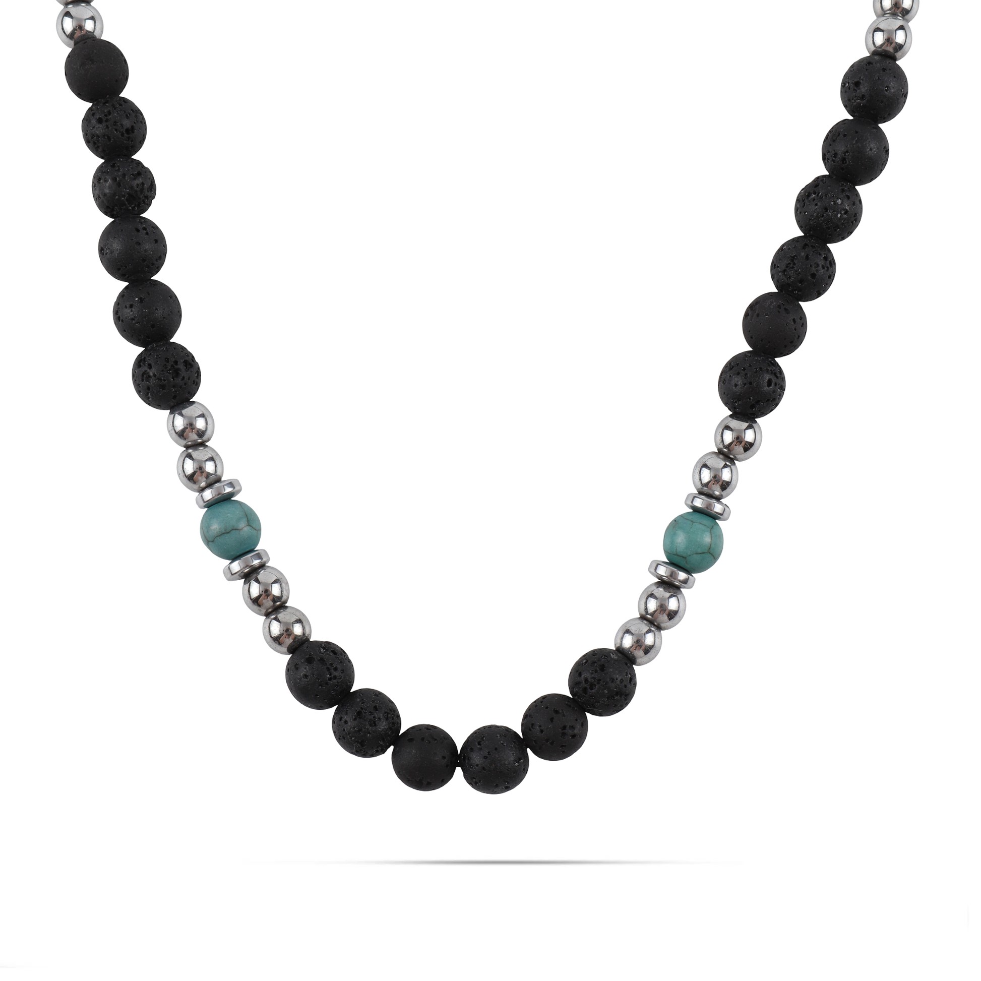 Ανδρικό χειροποίητο κολιέ με φυσικές ορυκτές πέτρες από λάβα (0,8cm), χαολίτη (0,8cm), ασημί πλακέ ροδέλα αιματίτη (0,6cm) και ασημί μπίλια αιματίτη (0,6cm).