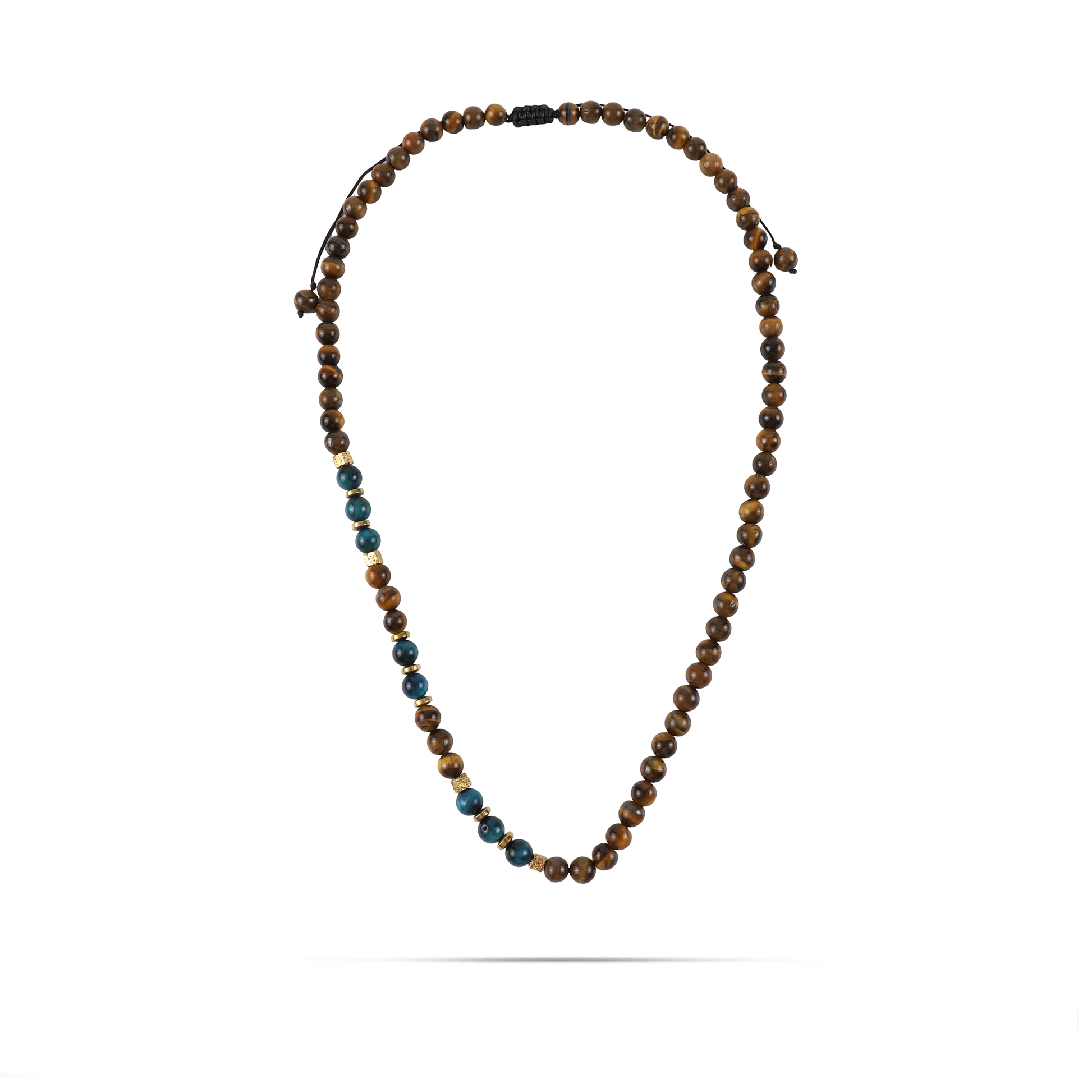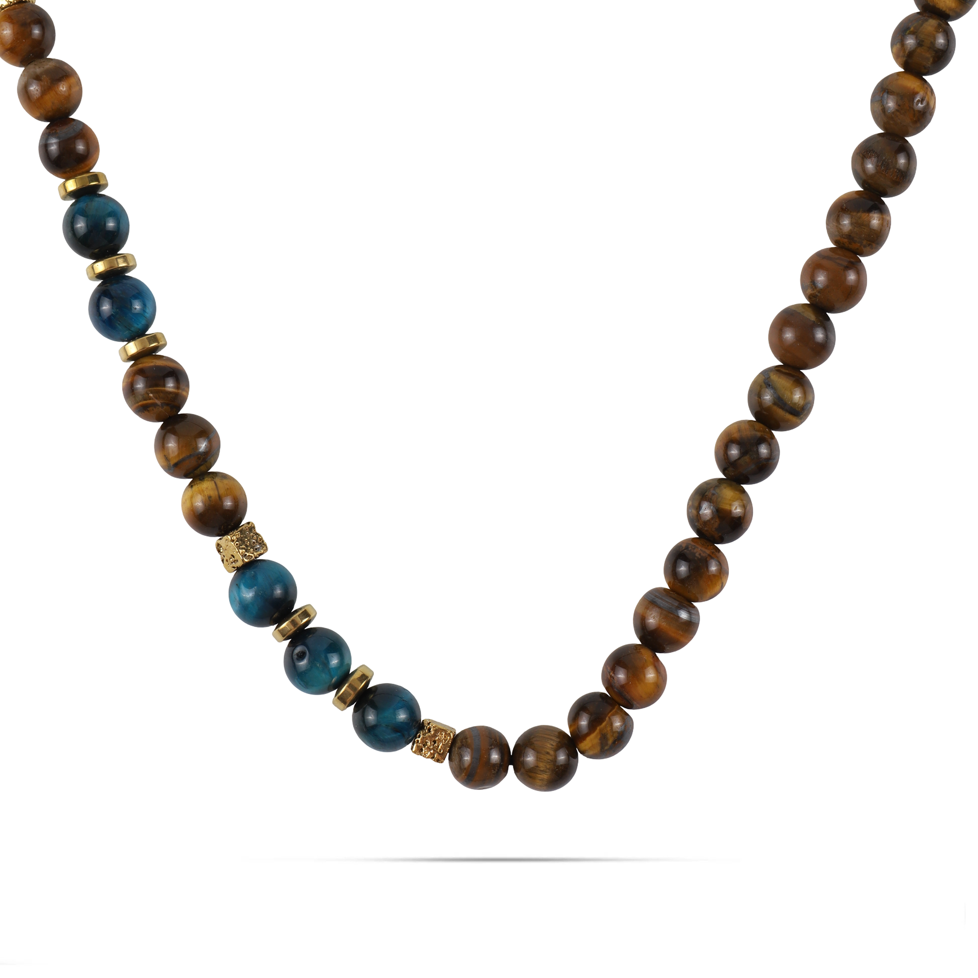Ανδρικό χειροποίητο κολιέ με φυσικές ορυκτές πέτρες από καφέ και μπλε μάτι τίγρης (0,8cm), χρυσή πλακέ ροδέλα αιματίτη (0,6cm) και χρυσό κύβο αιματίτη (0,4cm).