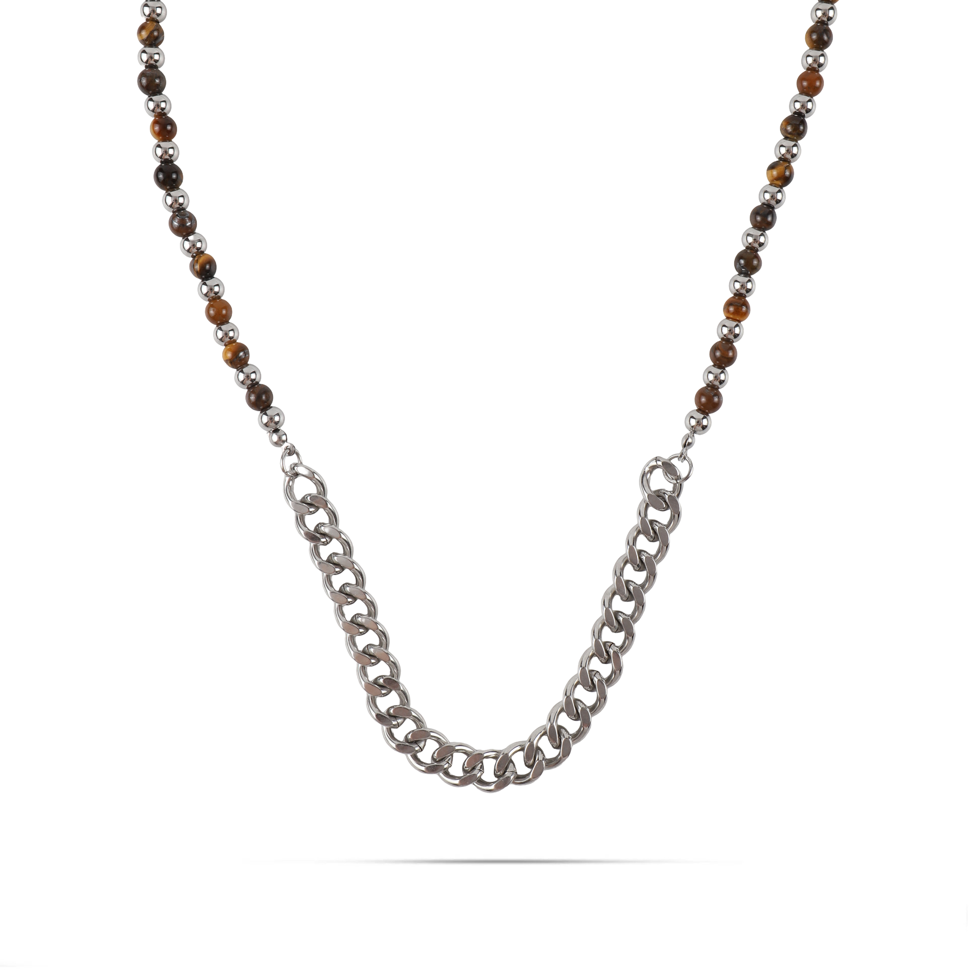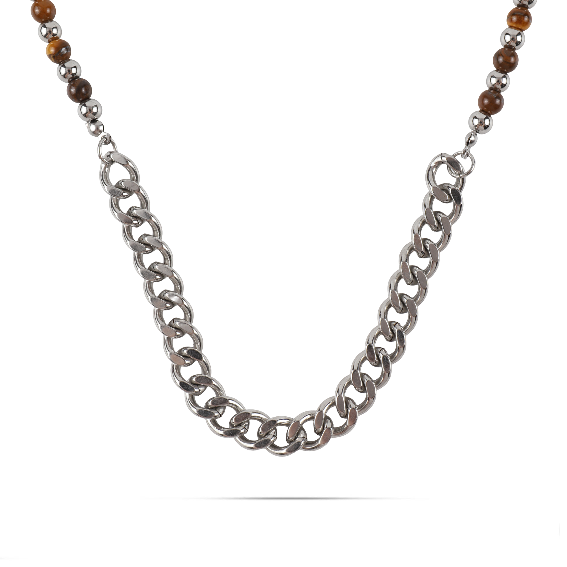 Ανδρικό χειροποίητο κολιέ με αλυσίδα Curb και φυσικές ορυκτές πέτρες από καφέ Μάτι Τίγρη (0.6cm) και ασημί μπίλιες αιματίτη (0.6cm).