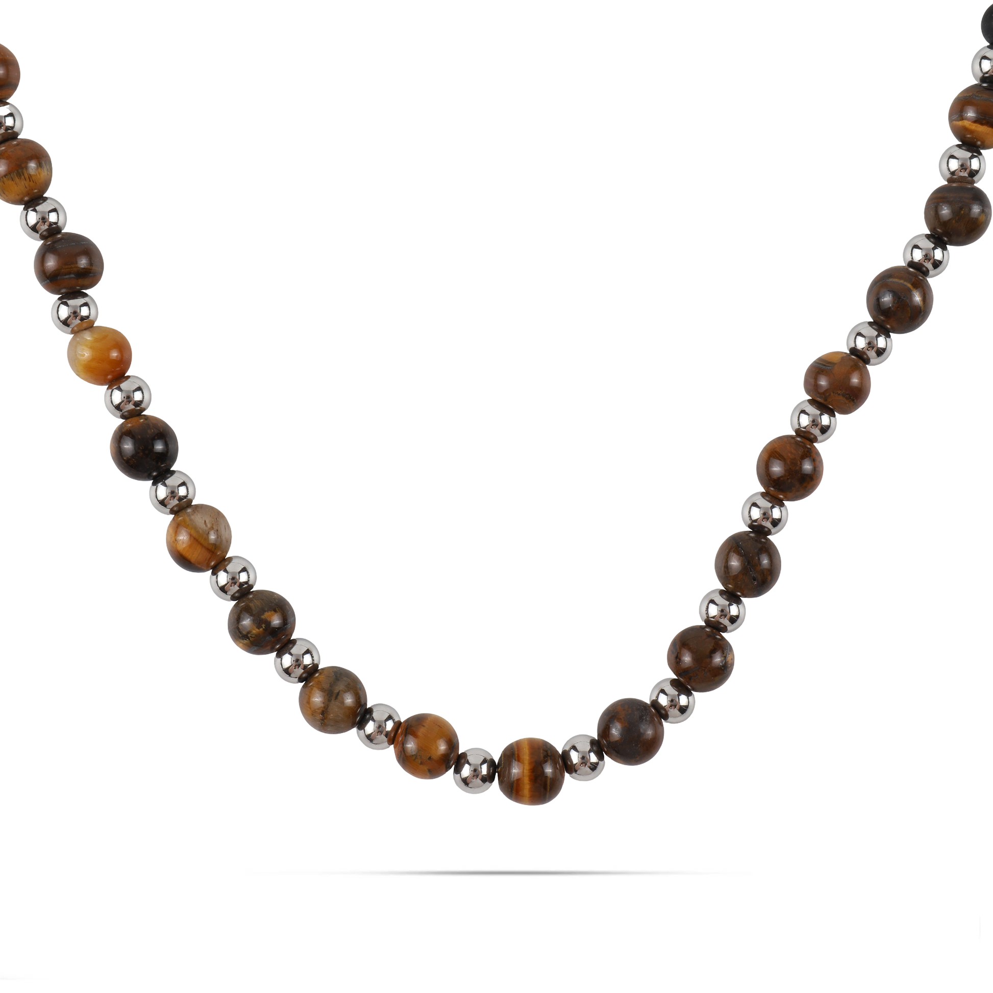 Ανδρικό χειροποίητο κολιέ με φυσικές ορυκτές πέτρες από μάτι τίγρης (0.8cm), όνυχα (0.6cm) και ασημί μπίλιες αιματίτη (0.6cm).