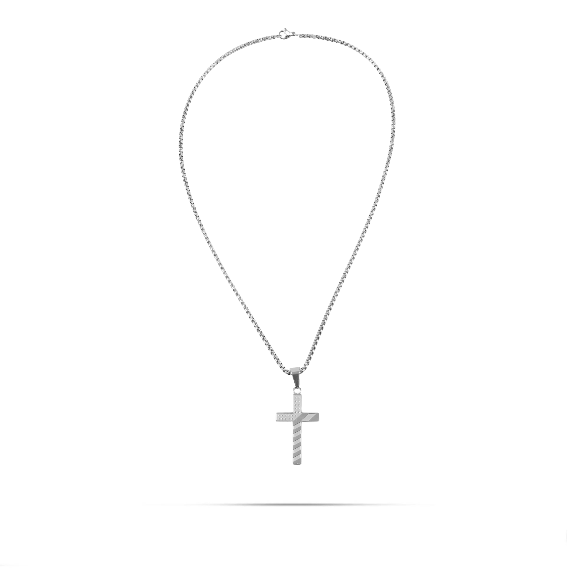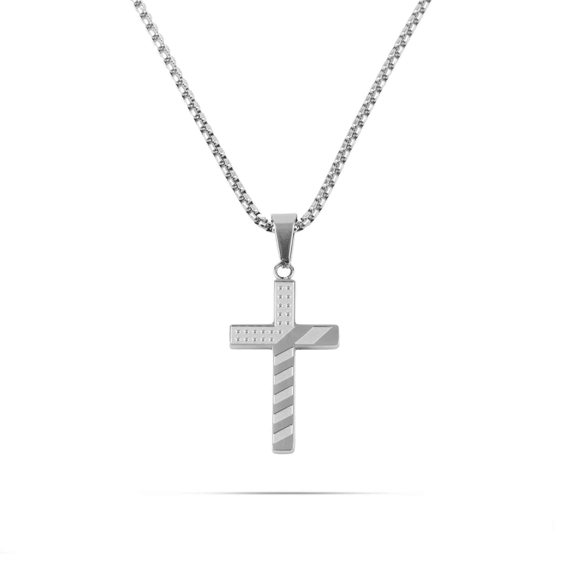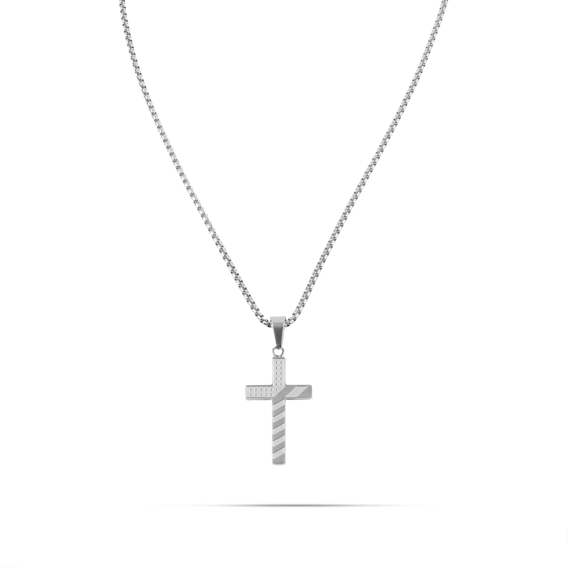 Κολιέ από ανοξείδωτο ατσάλι σε ασημί χρώμα. Ένα εντυπωσιακό κόσμημα για τον λαιμό σας με μενταγιόν σταυρό και σχέδιο την αμερικάνικη σημαία για ξεχωριστές εμφανίσεις!
