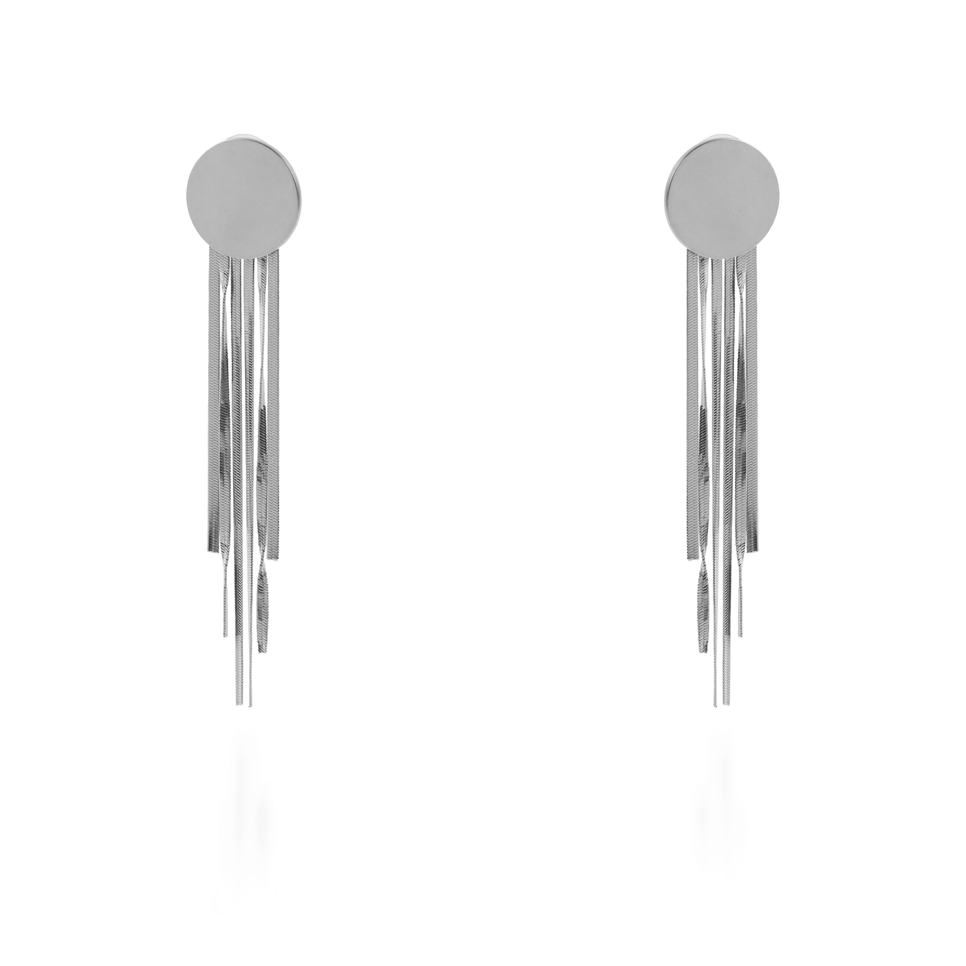 Σκουλαρίκια κρεμαστά από ανοξείδωτο ατσάλι σε ασημί χρώμα με στρόγγυλο σχήμα και κρεμαστά Flat Snake αλυσιδάκια, που συνδυάζουν κλασική κομψότητα με μοντέρνο ύφος. Το ασημί φινίρισμα αναδεικνύει τη λάμψη τους, ενώ το παιχνιδιάρικο κρέμασμα των αλυσίδων χαρίζει κίνηση και στυλ. Ιδανικά για καθημερινές εμφανίσεις αλλά και για πιο ιδιαίτερες περιστάσεις, αποτελούν μια διαχρονική προσθήκη στη συλλογή σας.