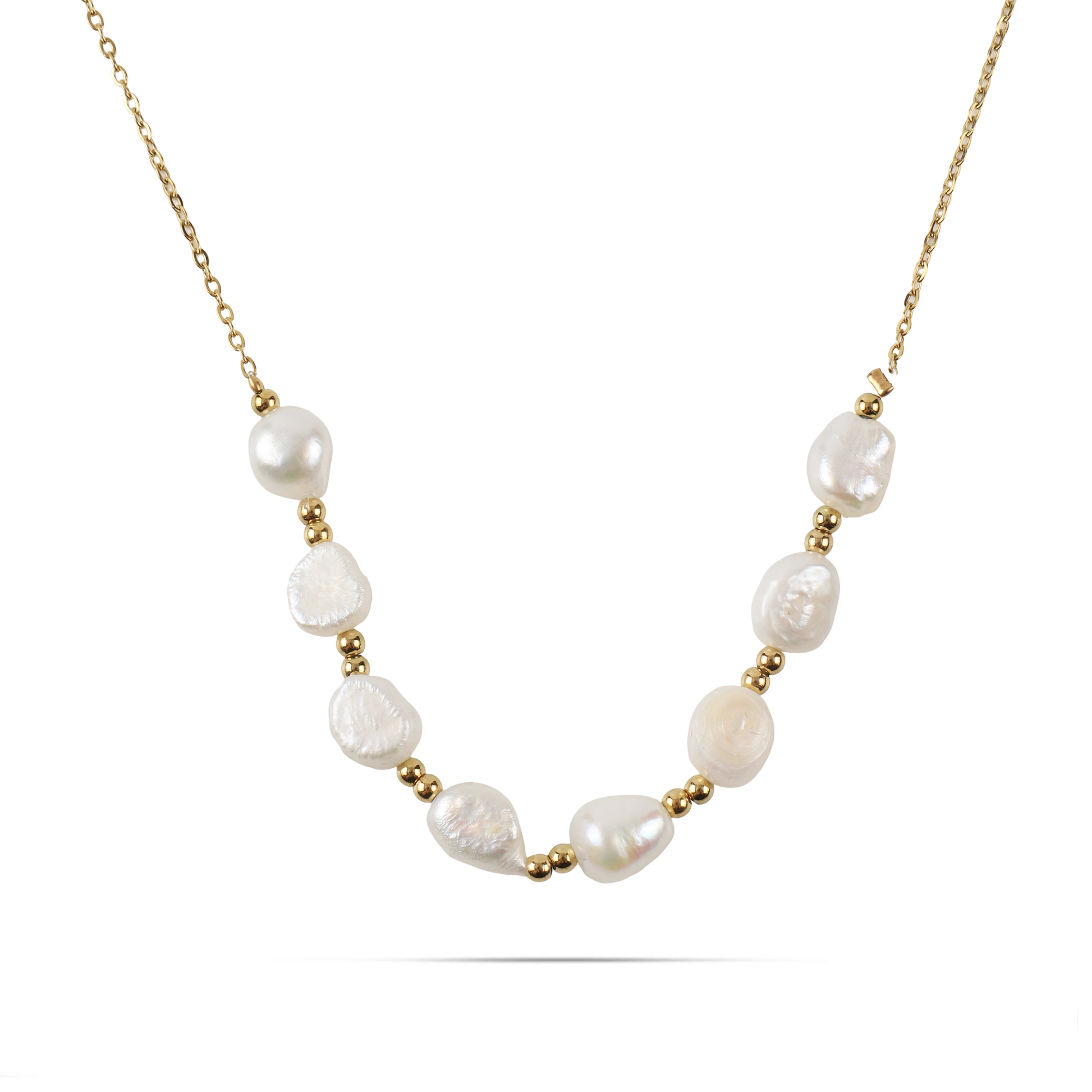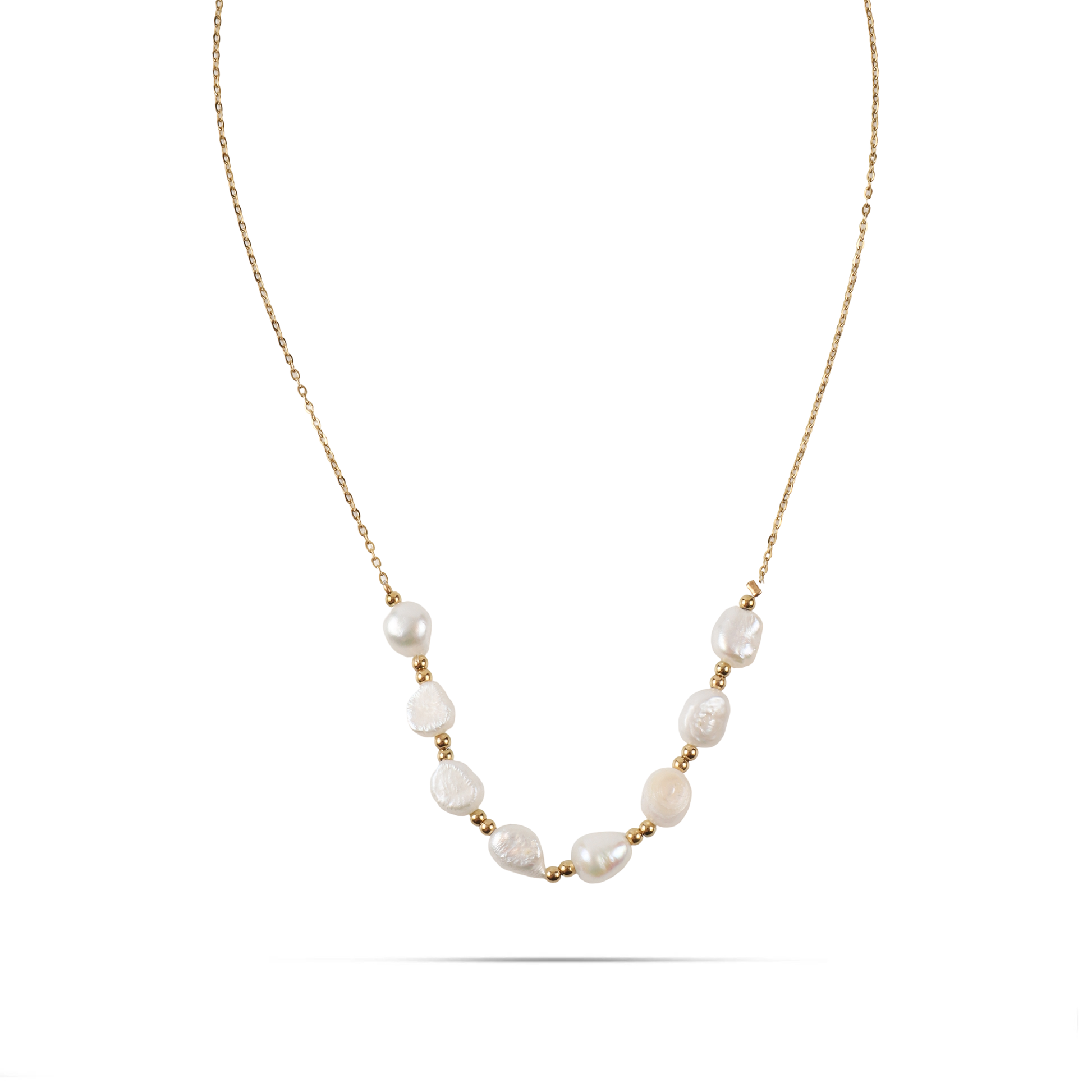 Κολιέ από ανοξείδωτο ατσάλι με λεπτή αλυσίδα διακοσμημένη με λαμπερές πέρλες. Η λεπτή αλυσίδα προσδίδει διακριτικότητα στο κολιέ, ενώ οι λαμπερές πέρλες προσθέτουν μια δόση κομψότητας. Το αποτέλεσμα είναι ένα κολιέ που μπορεί να φορεθεί με ευκολία και να προσθέσει λάμψη σε κάθε εμφάνιση.