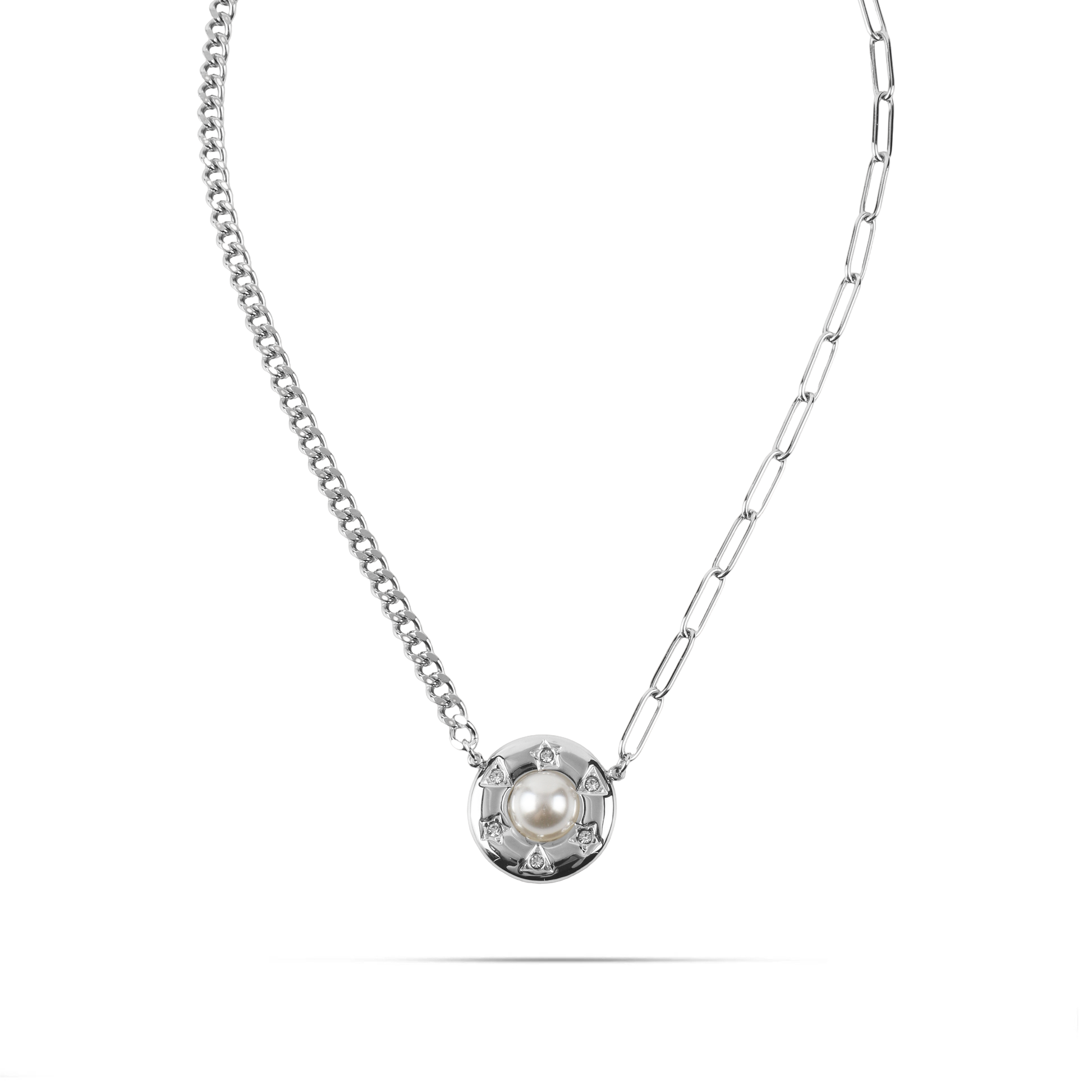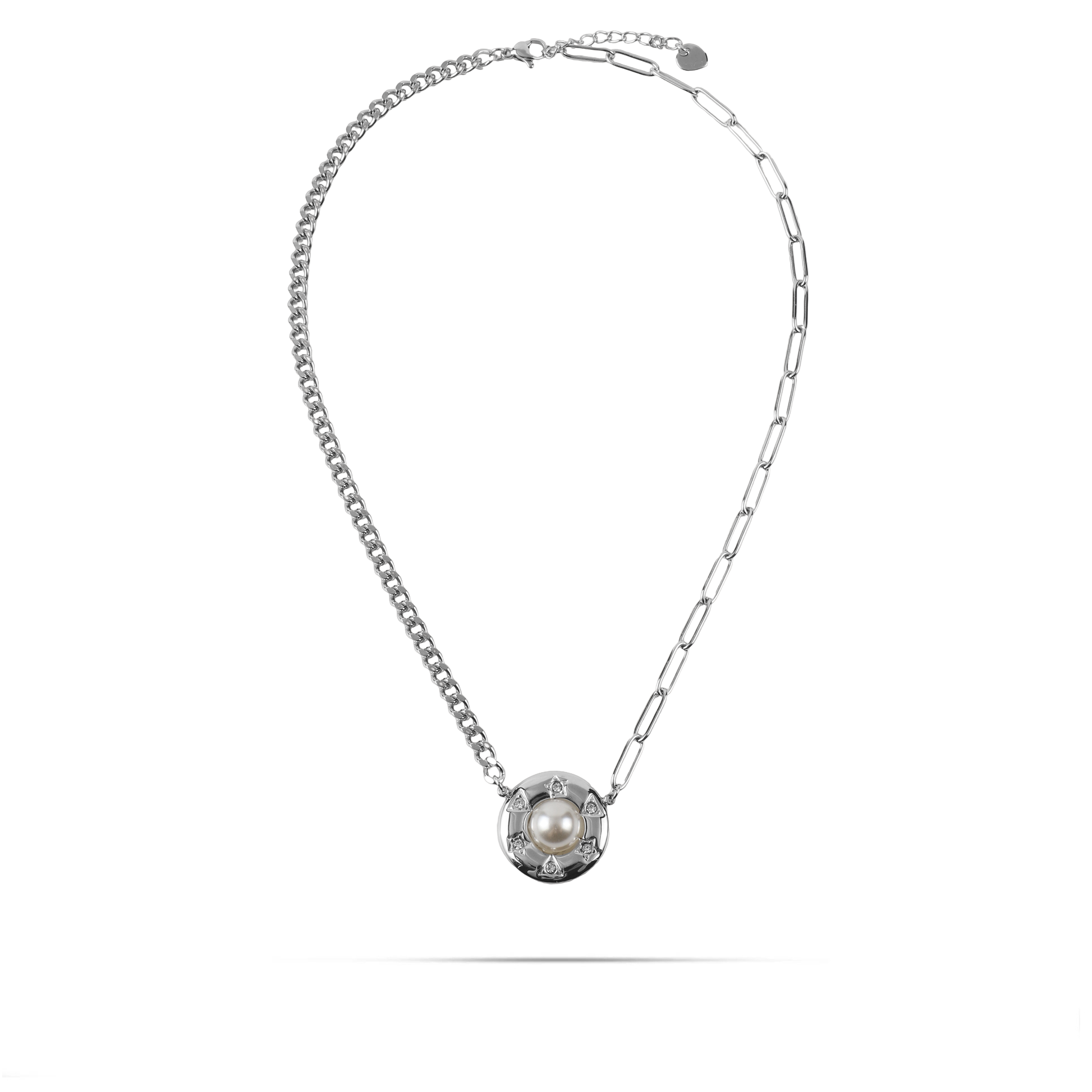 Κολιέ από ανοξείδωτο ατσάλι με όμορφο μενταγιόν που διακοσμείται με μια λαμπερή λευκή πέρλα και πέτρες Ζircon. Η αλυσίδα από ανοξείδωτο ατσάλι προσθέτει μια μοντέρνα αίσθηση, ενώ η πέρλα δίνει μια κομψή πινελιά. Αυτό το κολιέ είναι κατάλληλο για κάθε περίσταση, από τις καθημερινές εμφανίσεις έως τις ειδικές περιστάσεις, προσφέροντας έναν λαμπερό τρόπο να ολοκληρώσετε το ντύσιμό σας. Επίσης αποτελεί μια εξαιρετική επιλογή για δώρο.