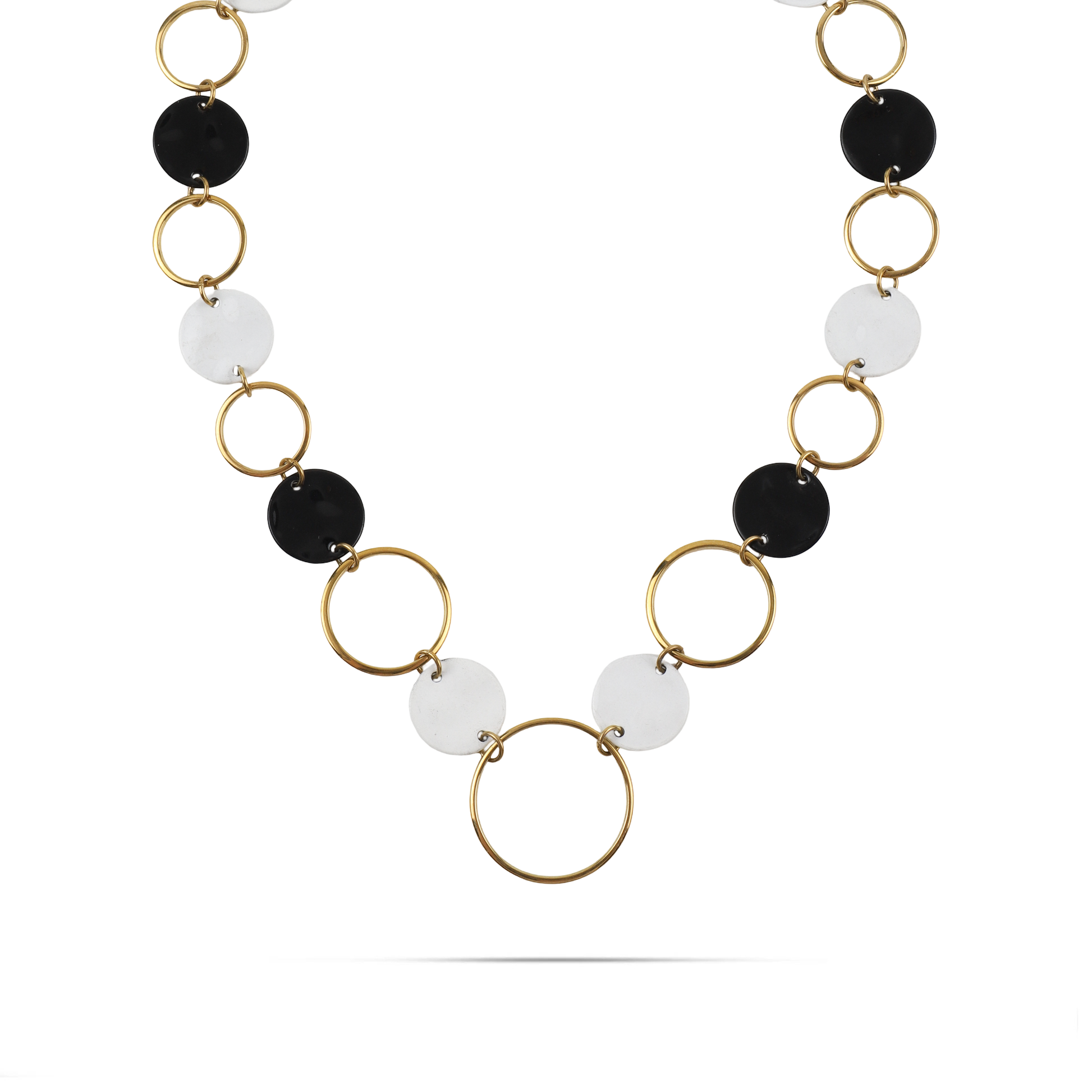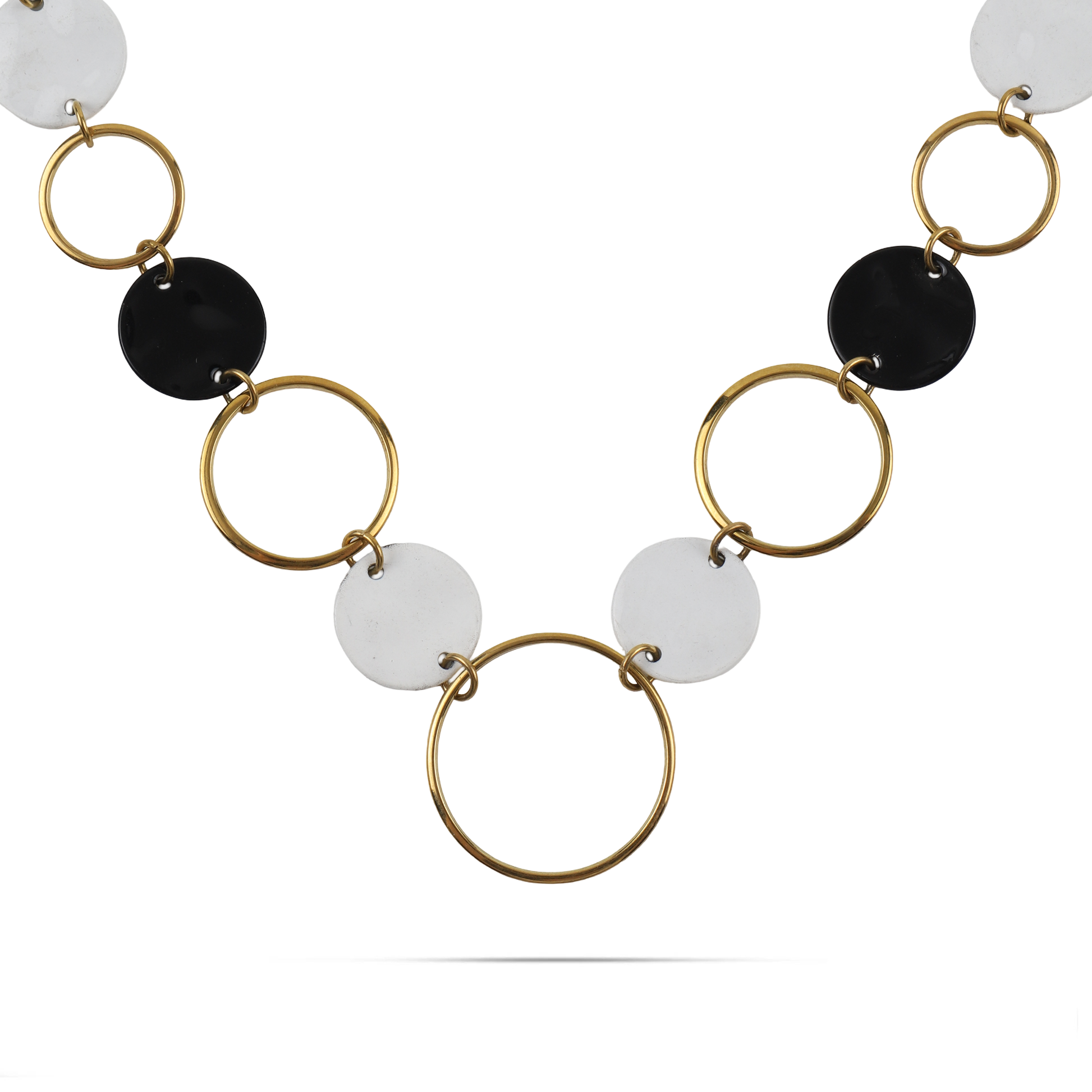 Το κολιέ Mar and Mar Demine αποτελεί ένα statement κόσμημα με έντονο "geometric-chic" χαρακτήρα, που παίζει με τις αντιθέσεις και τις καθαρές φόρμες. Η σύνθεσή του από μεγάλους χρυσούς κρίκους, που εναλλάσσονται ρυθμικά με δίσκους σε κλασικό μαύρο και ημιδιάφανο λευκό, δημιουργεί ένα δυναμικό οπτικό αποτέλεσμα εμπνευσμένο από τη μοντέρνα τέχνη. Κατασκευασμένο από υψηλής ποιότητας ορείχαλκο για αναλλοίωτη λάμψη, είναι η ιδανική επιλογή για τη γυναίκα που θέλει να προσθέσει έναν αέρα αρχιτεκτονικής φινέτσας και "bold" αισθητικής σε κάθε της εμφάνιση. ✨