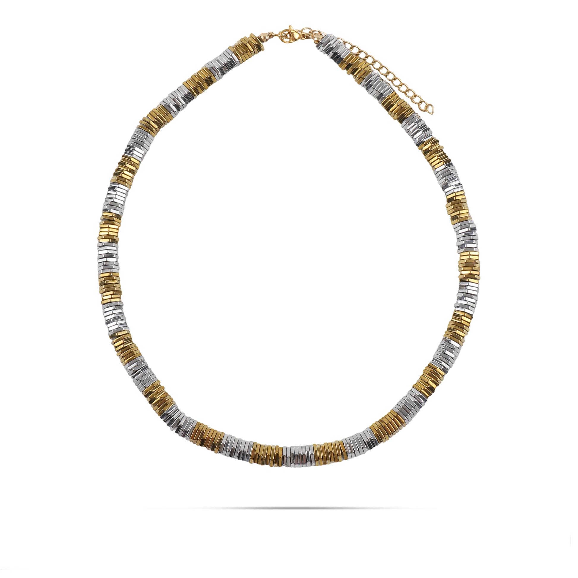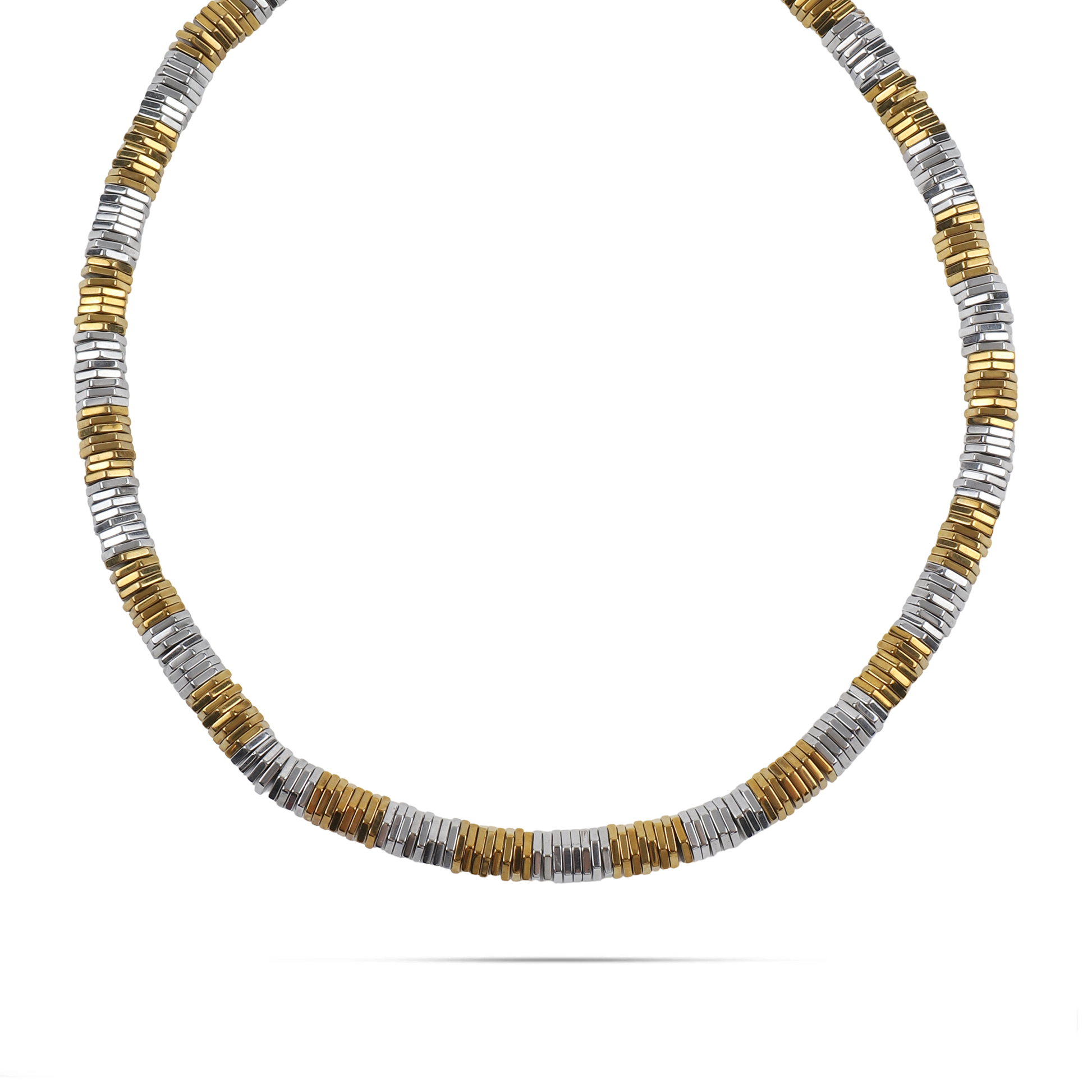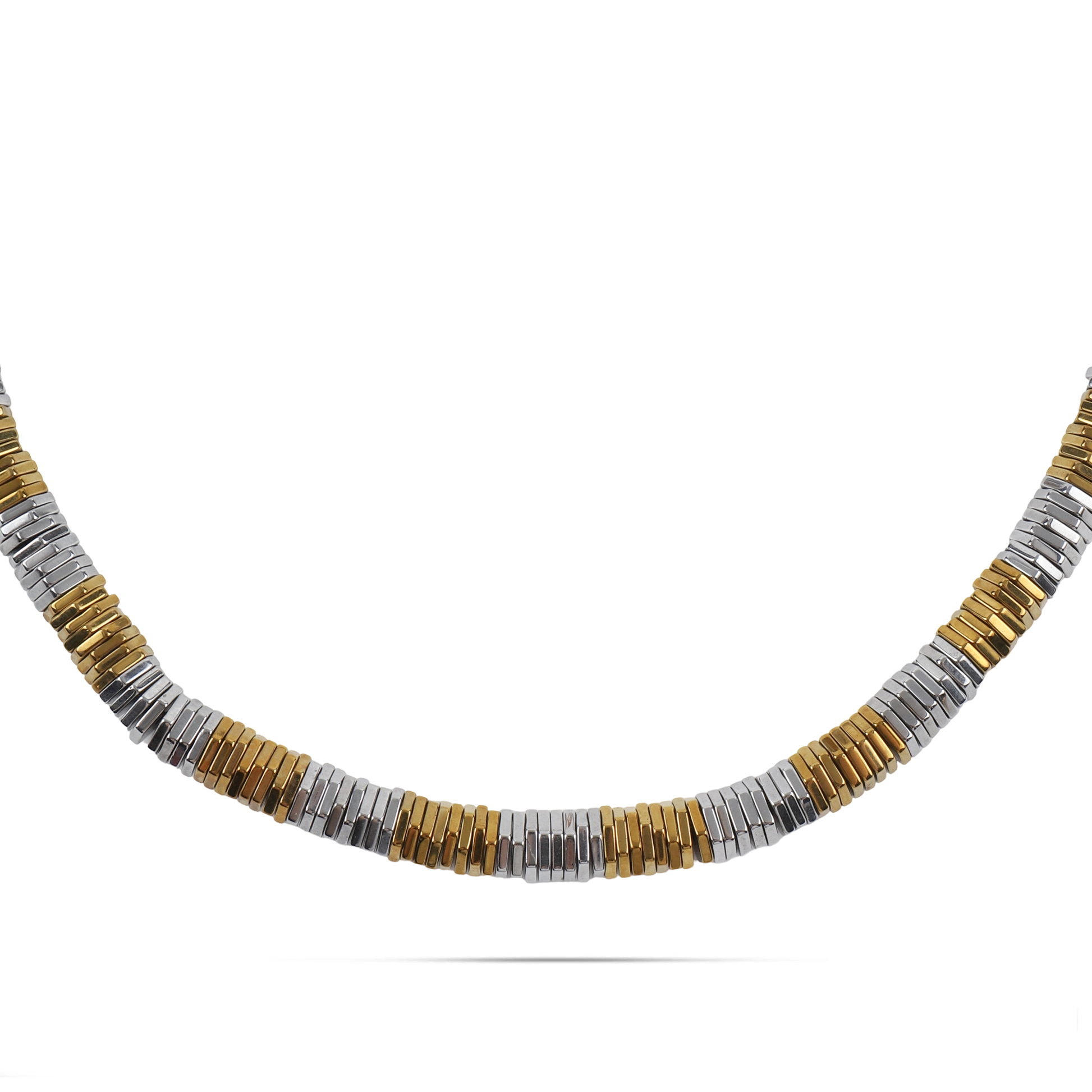 Το κολιέ Mar and Mar Mosaic αποτελεί μια ωδή στον σύγχρονο μινιμαλισμό, με τον ιδιαίτερο σχεδιασμό του να θυμίζει πολύτιμο ψηφιδωτό από μέταλλο. Η εναλλαγή ανάμεσα στα χρυσά και ασημί στοιχεία σε σχήμα μικρών ράβδων δημιουργεί μια μοναδική δίχρωμη αισθητική και ένα ρυθμικό παιχνίδισμα με το φως που μαγνητίζει το βλέμμα. Κατασκευασμένο από υψηλής ποιότητας ανοξείδωτο ατσάλι για μέγιστη ανθεκτικότητα και αναλλοίωτη λάμψη, αυτό το «heishi-style» κολιέ συνδυάζει την "industrial" αυστηρότητα με την πολυτέλεια, αποτελώντας το ιδανικό statement αξεσουάρ για να προσθέσετε έναν αέρα σύγχρονης φινέτσας σε κάθε σας εμφάνιση. ✨