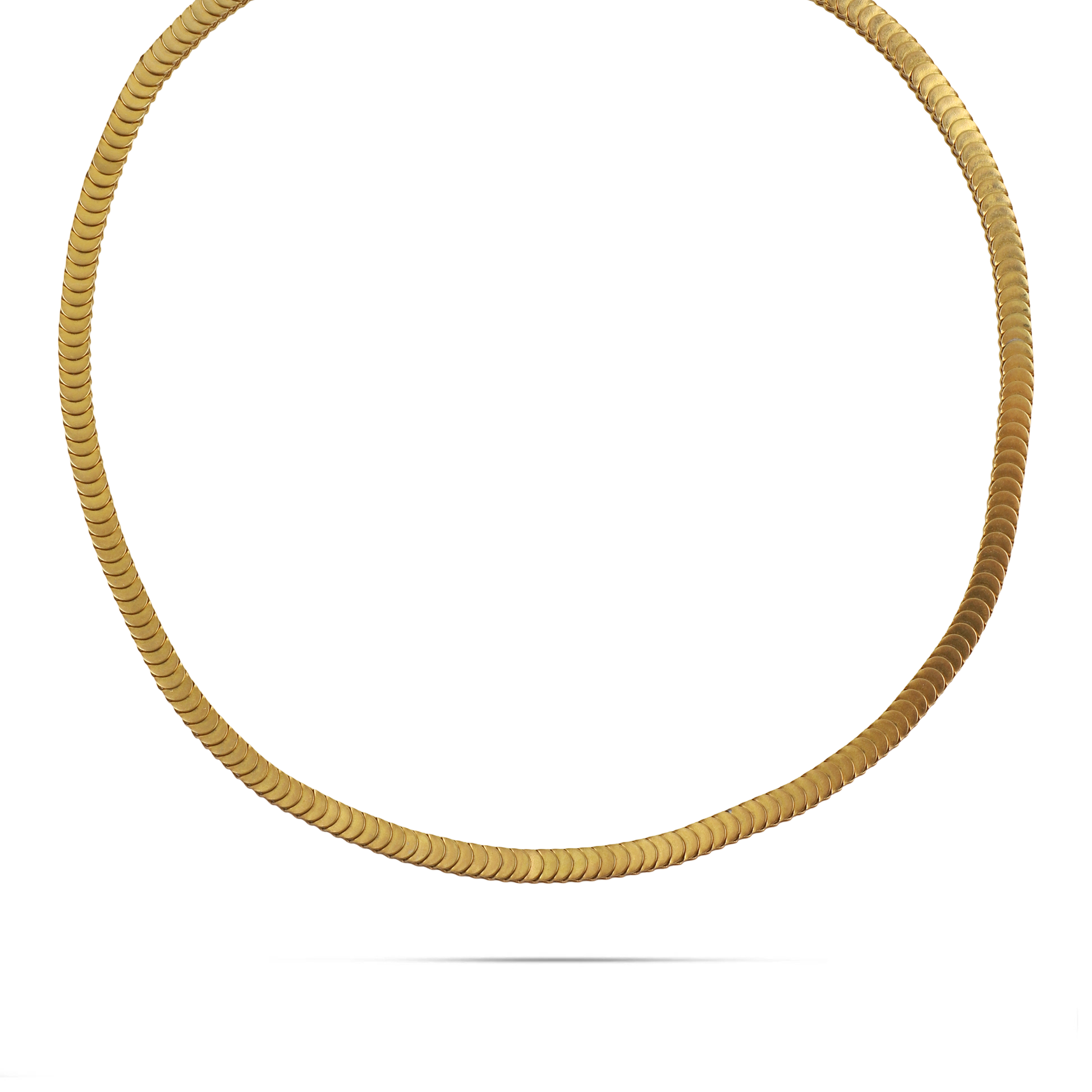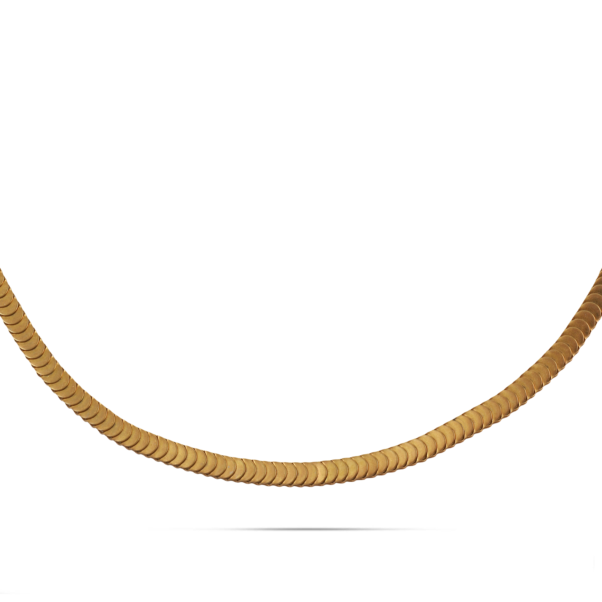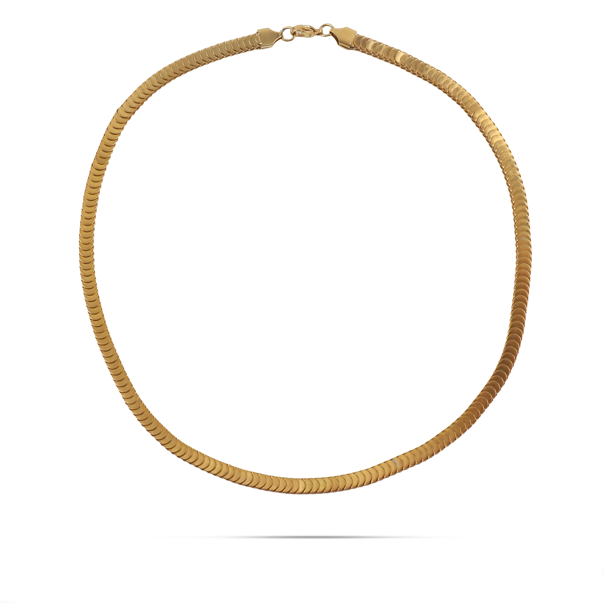 Το κολιέ Mar and Mar Seraphine σε χρυσό χρώμα αποτελεί την επιτομή της «liquid gold» αισθητικής, με τον εντυπωσιακό σχεδιασμό τύπου «herringbone» να αγκαλιάζει τον λαιμό σαν ένα ρευστό, μεταλλικό ύφασμα. Οι πυκνά πλεγμένοι, επίπεδοι κρίκοι του δημιουργούν μια συνεχή, καθρεπτίζουσα επιφάνεια που μαγνητίζει το φως με κάθε σας κίνηση, προσφέροντας μια αίσθηση αβίαστης πολυτέλειας.