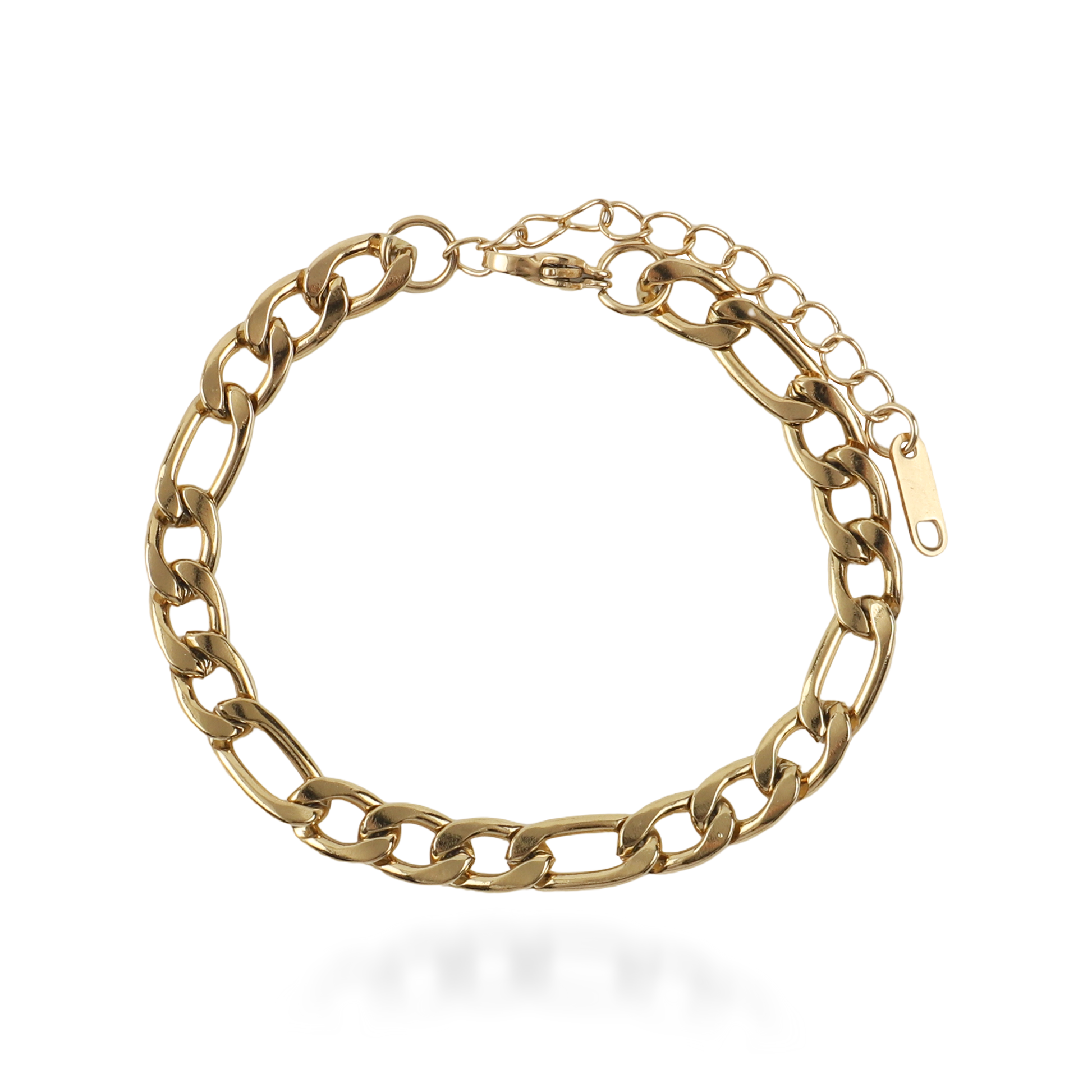 Η αλυσίδα χεριού Figaro σε χρυσό χρώμα από ανοξείδωτο ατσάλι αποτελεί ένα κομψό και διαχρονικό κόσμημα. Ο χαρακτηριστικός σχεδιασμός Figaro, με την εναλλαγή μεγάλων και μικρών κρίκων, προσδίδει έναν ιδιαίτερο ρυθμό και κομψότητα στο βραχιόλι. Η ανοξείδωτη κατασκευή εξασφαλίζει αντοχή και μακροχρόνια χρήση, ενώ το χρυσό φινίρισμα διατηρεί τη λάμψη του χωρίς να αλλοιώνεται με τον χρόνο. Ιδανικό για καθημερινή εμφάνιση, φοριέται άνετα μόνο του ή σε συνδυασμό με άλλα βραχιόλια.