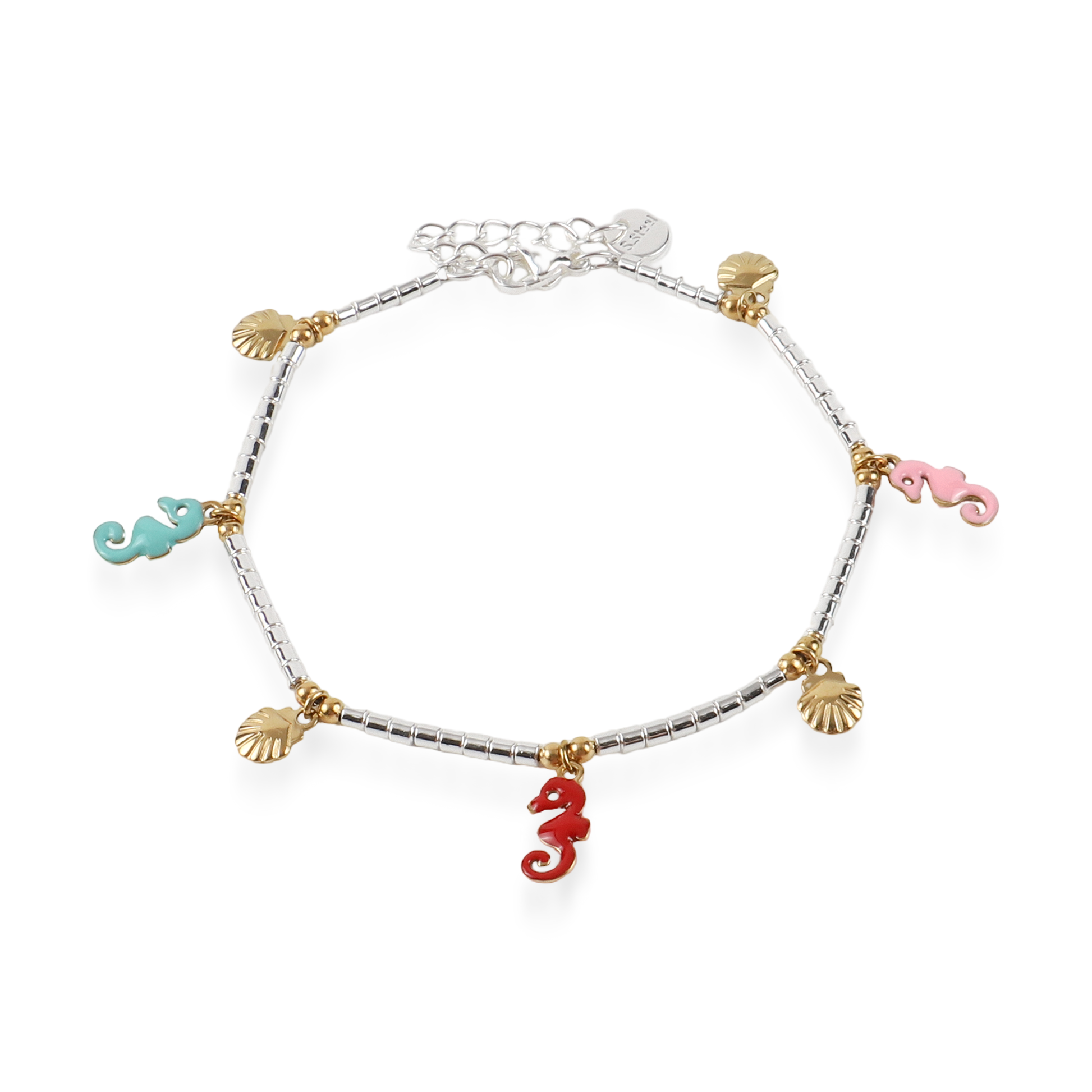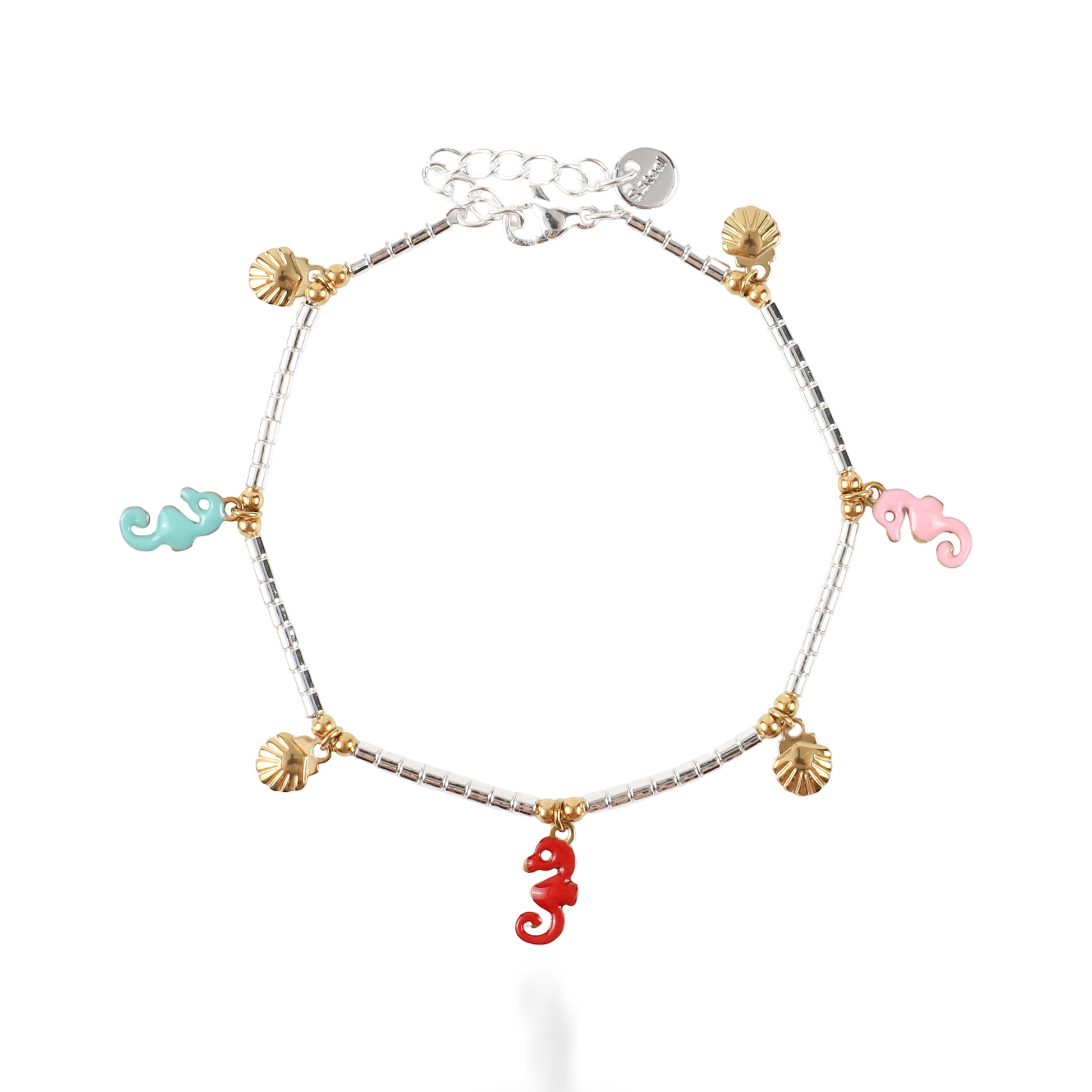 Φέρτε την κομψότητα του βυθού στον καρπό σας με το βραχιόλι Mar and Mar Alba Seahorse. Ασημένιες χάντρες σε ισορροπία με ζωηρά πολύχρωμα στοιχεία και το γοητευτικό σχήμα του ιππόκαμπου δημιουργούν ένα φίνο αποτέλεσμα. Ένα κόσμημα εμπνευσμένο από τη φύση, για γυναίκες που αγαπούν τις λεπτομέρειες και τη διακριτική πολυτέλεια.