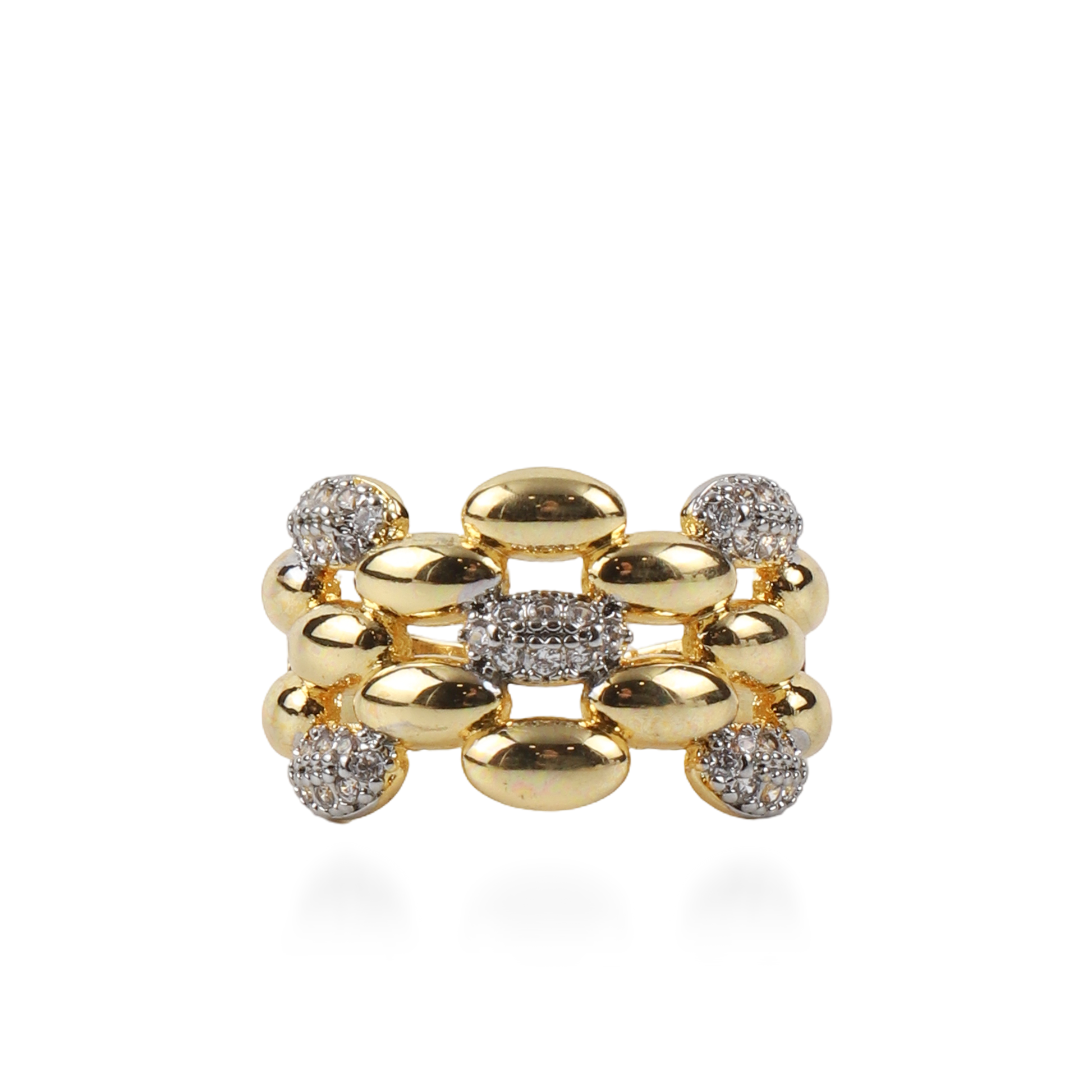 Το γυναικείο δαχτυλίδι Mar and Mar Selisare από ορείχαλκο σε χρυσό χρώμα διαθέτει πλατύ σχέδιο σε στυλ αλυσίδας, διακοσμημένο με λαμπερές λευκές πέτρες ζιργκόν, προσδίδοντας ένα μοντέρνο και εντυπωσιακό στυλ. Ιδανικό για να αναδείξετε την κομψότητα και τη λάμψη σας σε κάθε εμφάνιση. ✨💍