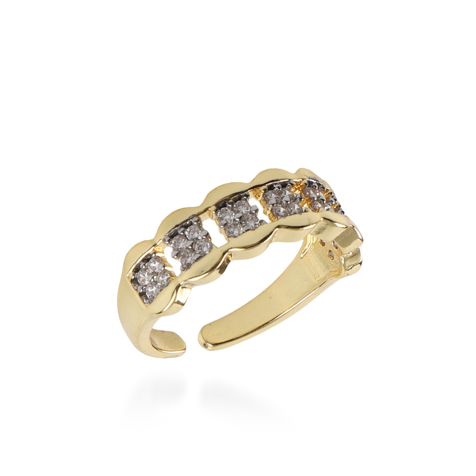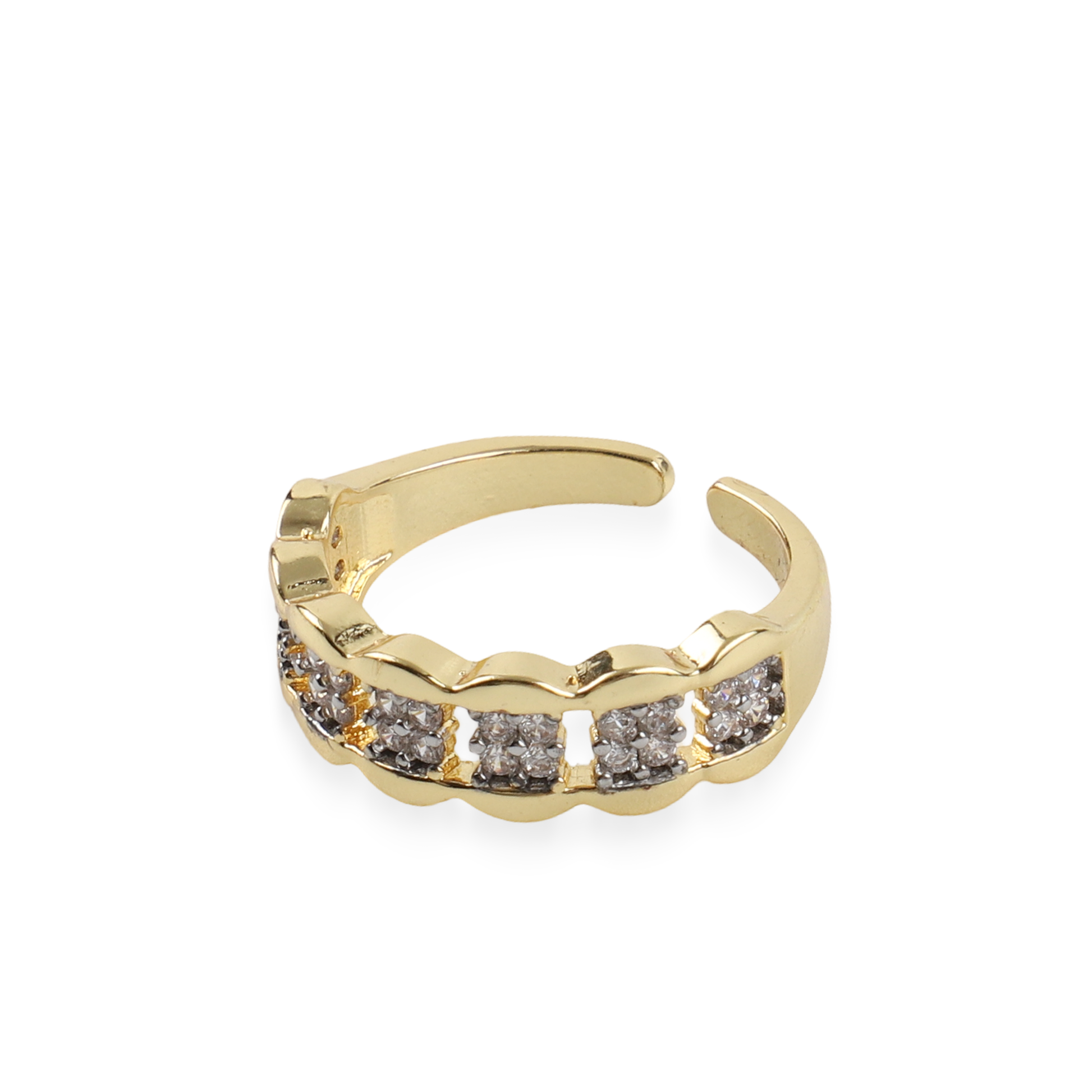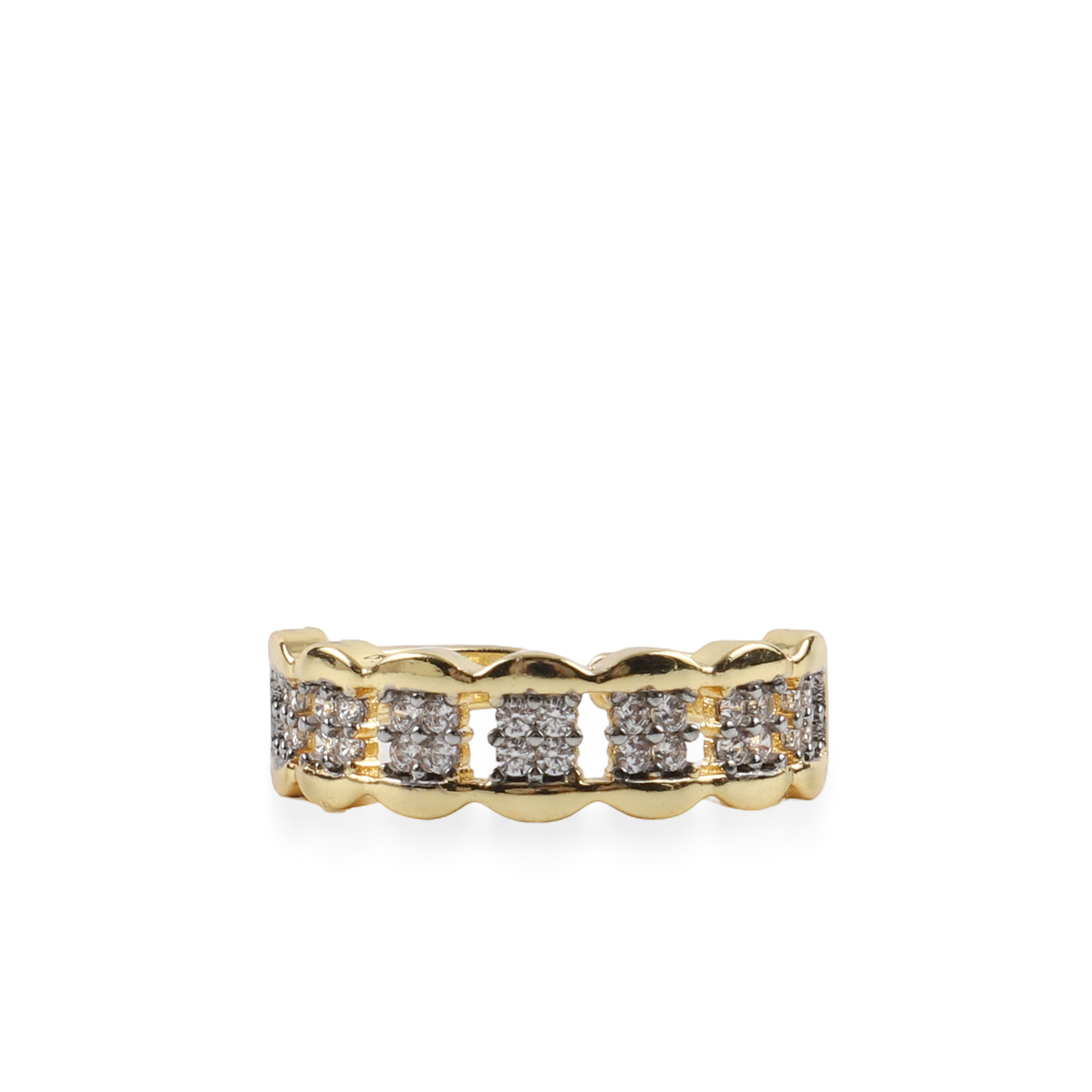 Το δαχτυλίδι Mar and Mar Bally σε χρυσή απόχρωση είναι ένας ύμνος στη χαρούμενη πολυτέλεια και τον "playful" σχεδιασμό. Κατασκευασμένο από υψηλής ποιότητας ορείχαλκο με λαμπερό χρυσό φινίρισμα, ξεχωρίζει για την κυματιστή του δομή που θυμίζει μικρές φυσαλίδες, καθεμία από τις οποίες φιλοξενεί ένα "micro-pave" από αστραφτερά κρύσταλλα ζιργκόν.