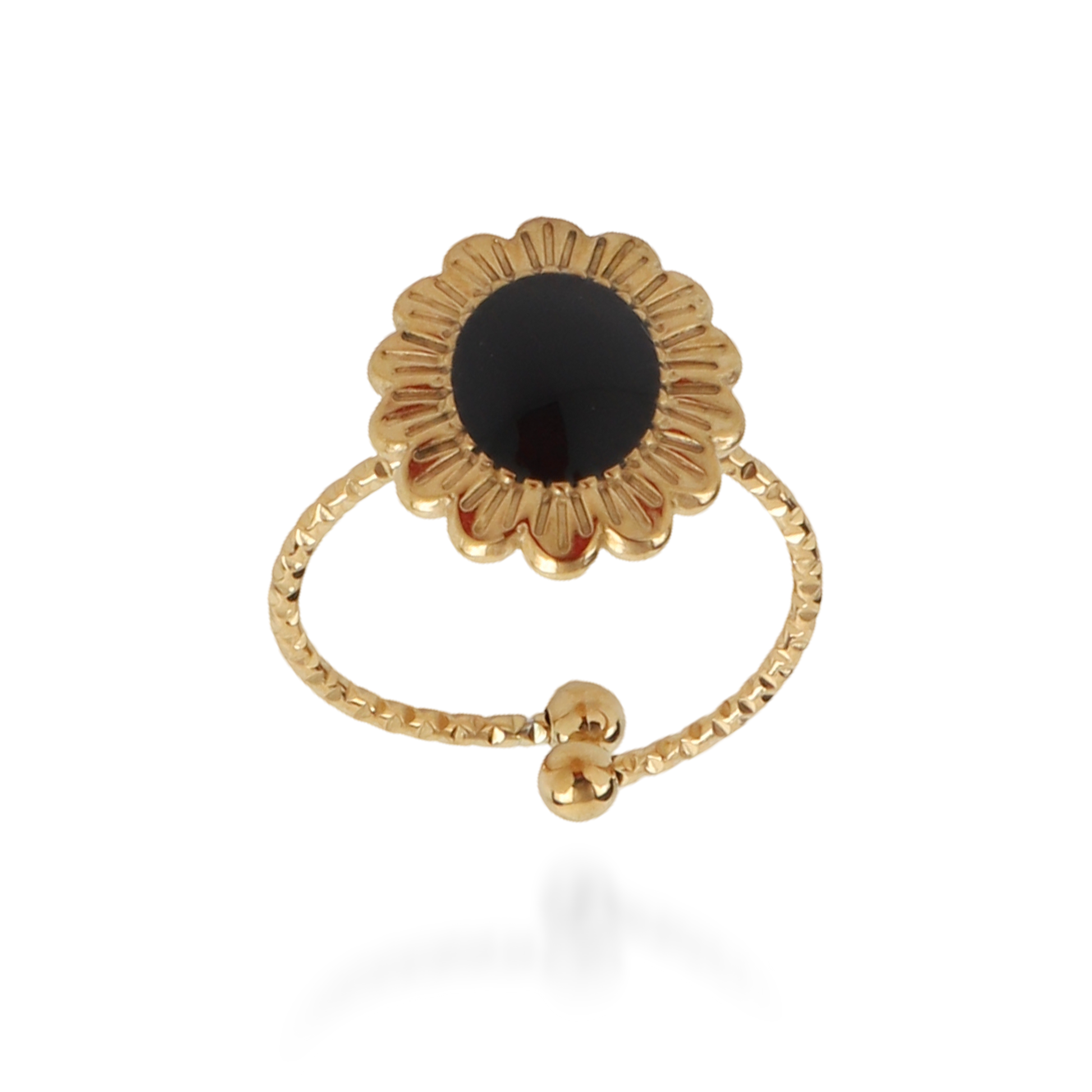 Αναδείξτε τη θηλυκότητα και την κομψότητά σας με αυτό το λεπτό και εκλεπτυσμένο γυναικείο δαχτυλίδι από ανοξείδωτο ατσάλι της συλλογής Mar and Mar, σε λαμπερή χρυσή απόχρωση, με μαύρη πέτρα στο κέντρο περιβαλλόμενη από λουλουδένιο σχέδιο, που προσφέρει μια ρομαντική και κομψή λάμψη. Ο μοντέρνος και διακριτικά πολυτελής σχεδιασμός του ολοκληρώνει κάθε εμφάνιση, ενώ η ανθεκτική κατασκευή εξασφαλίζει σταθερότητα και μακροχρόνια λάμψη. Ένα ιδιαίτερο και εντυπωσιακό κόσμημα που προσθέτει φινέτσα και στυλ σε κάθε σας look.