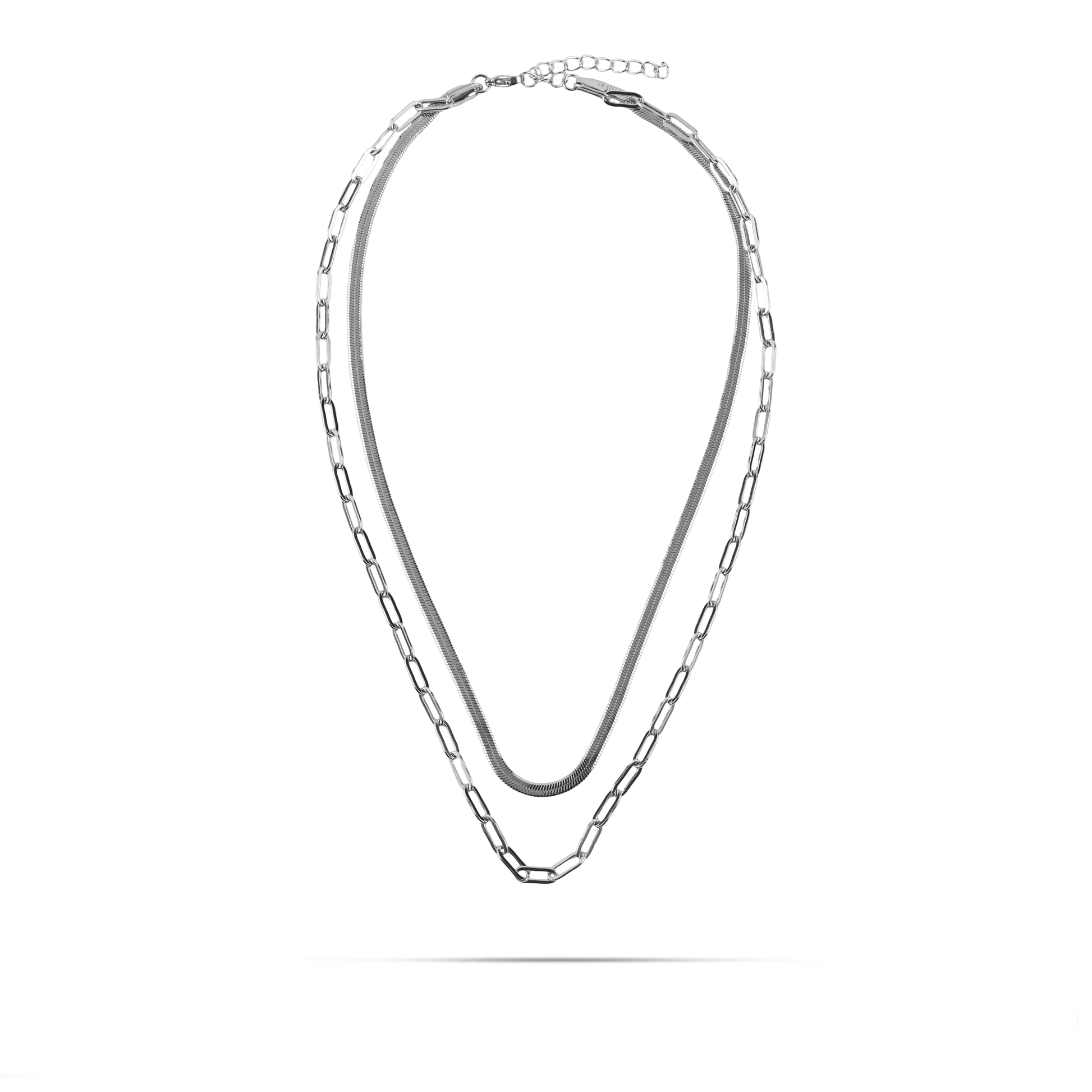 Το κολιέ Mar and Mar Maelis από ανοξείδωτο ατσάλι σε ασημί χρώμα διαθέτει διπλή αλυσίδα λαιμού, συνδυάζοντας μια flat snake αλυσίδα με μια κλασική αλυσίδα. Ο συνδυασμός αυτός προσφέρει μοντέρνο και κομψό αποτέλεσμα, ιδανικό για layering ή για να φορεθεί μόνο του. Η ασημένια απόχρωση εξασφαλίζει διαχρονικότητα και λάμψη, ενώ η λεπτή αλλά εντυπωσιακή κατασκευή το καθιστά κατάλληλο για καθημερινές εμφανίσεις αλλά και πιο επίσημες περιστάσεις. ✨