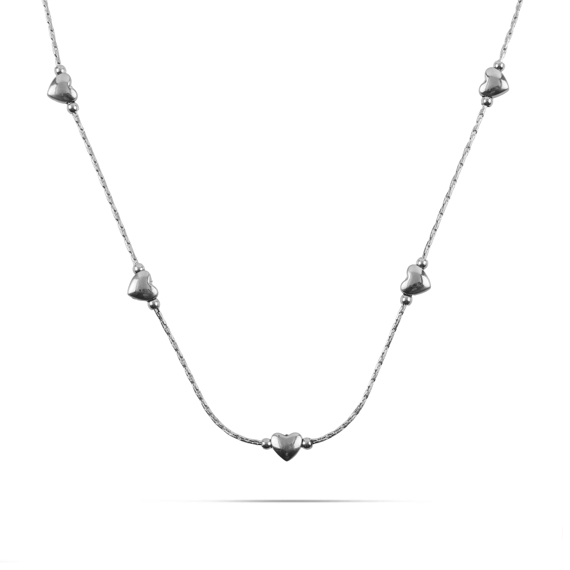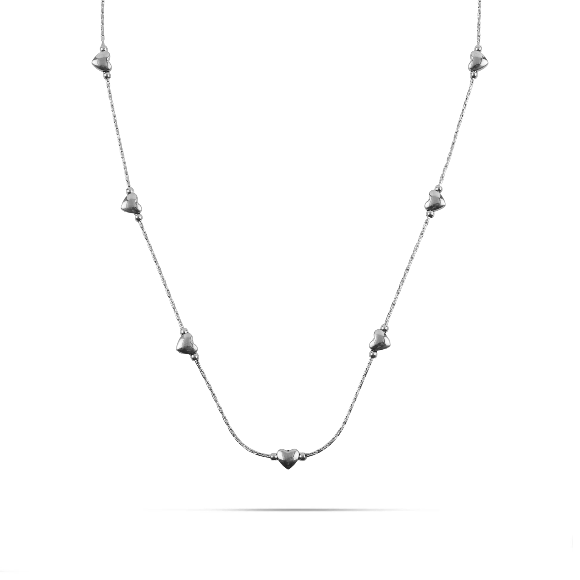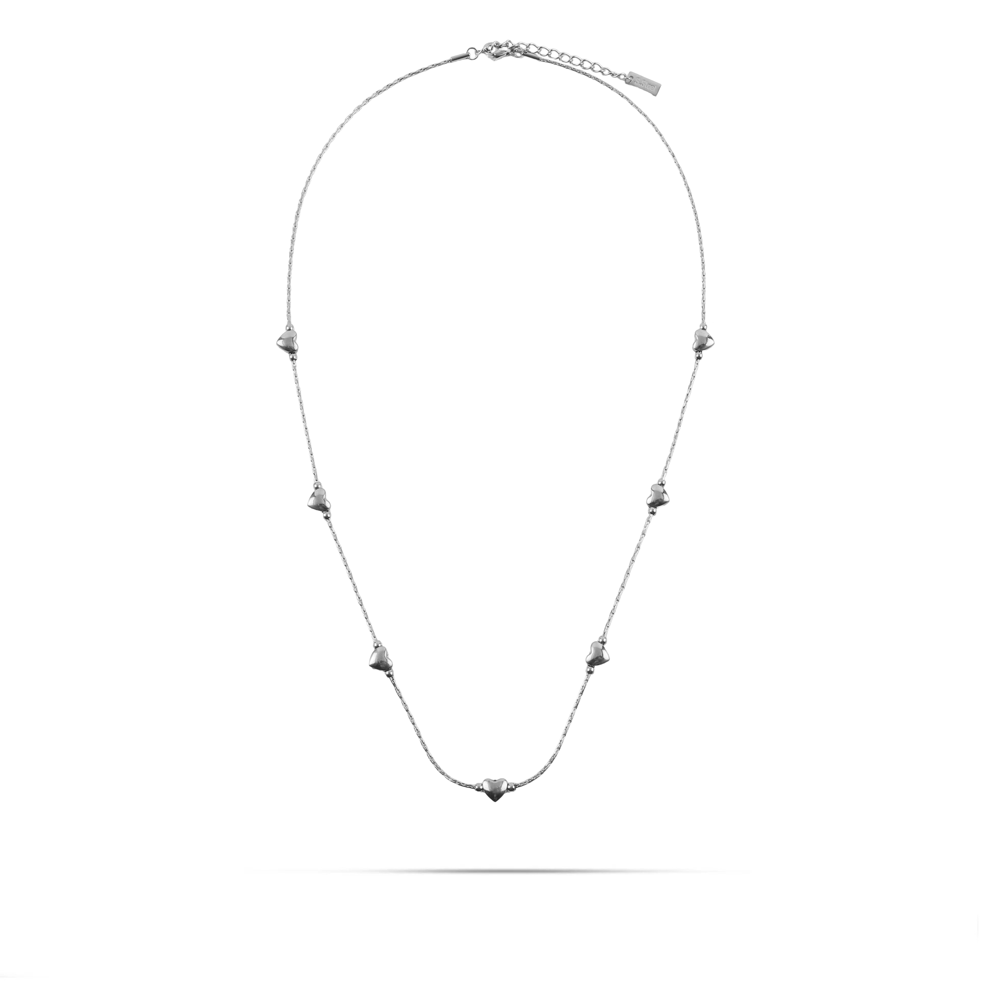 Το κολιέ Mar and Mar Amircy σε ασημί χρώμα αποτελεί έναν ύμνο στη διακριτική κομψότητα, με τον "minimal" σχεδιασμό του να αναδεικνύει τη ρομαντική πλευρά κάθε γυναίκας. Η λεπτή, αστραφτερή αλυσίδα διακοσμείται ρυθμικά από επτά μικροσκοπικές, τρισδιάστατες καρδιές που μοιάζουν να "επιπλέουν" στον λαιμό, δημιουργώντας μια συνεχή ροή ψυχρής και καθαρής λάμψης.