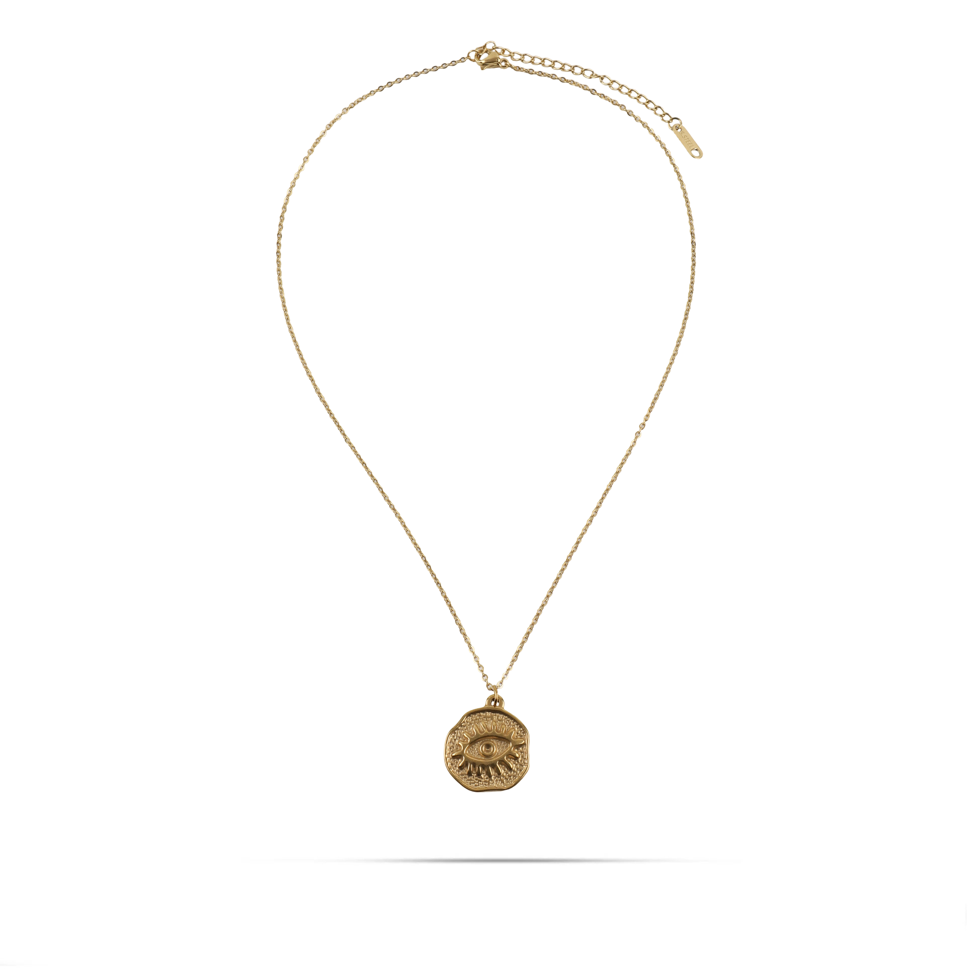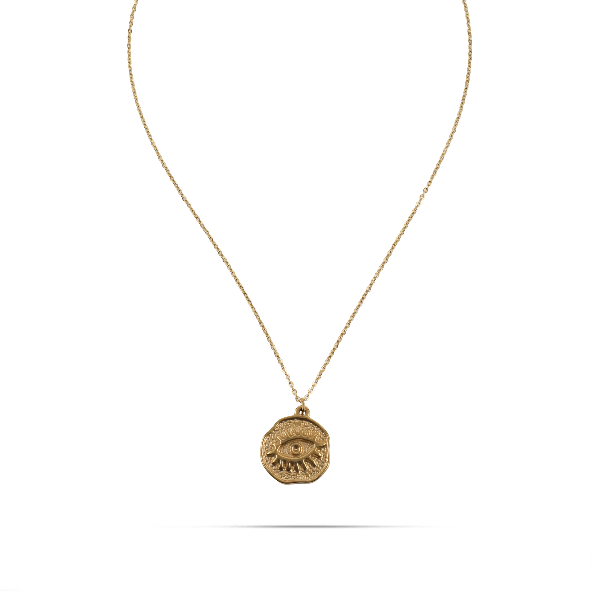 Το κολιέ Mar and Mar Solis σε χρυσό χρώμα αποτελεί ένα μοναδικό κόσμημα με vintage αισθητική, με το μενταγιόν σε σχήμα αρχαίου νομίσματος να φιλοξενεί ένα ανάγλυφο, ακτινοβόλο «μάτι» που συμβολίζει την ενέργεια και την προστασία. Η σφυρήλατη υφή στην επιφάνεια του μενταγιόν προσδίδει μια αίσθηση ακατέργαστης πολυτέλειας και "organic" στυλ, καθιστώντας το ένα διαχρονικό talisman για κάθε συλλογή. Κατασκευασμένο από υψηλής ποιότητας ανοξείδωτο ατσάλι για μέγιστη ανθεκτικότητα και αναλλοίωτη λάμψη, είναι η ιδανική επιλογή για να προσθέσετε έναν αέρα μυστηρίου και εκλεπτυσμένης φινέτσας σε κάθε σας εμφάνιση, από το πρωί ως το βράδυ. ✨