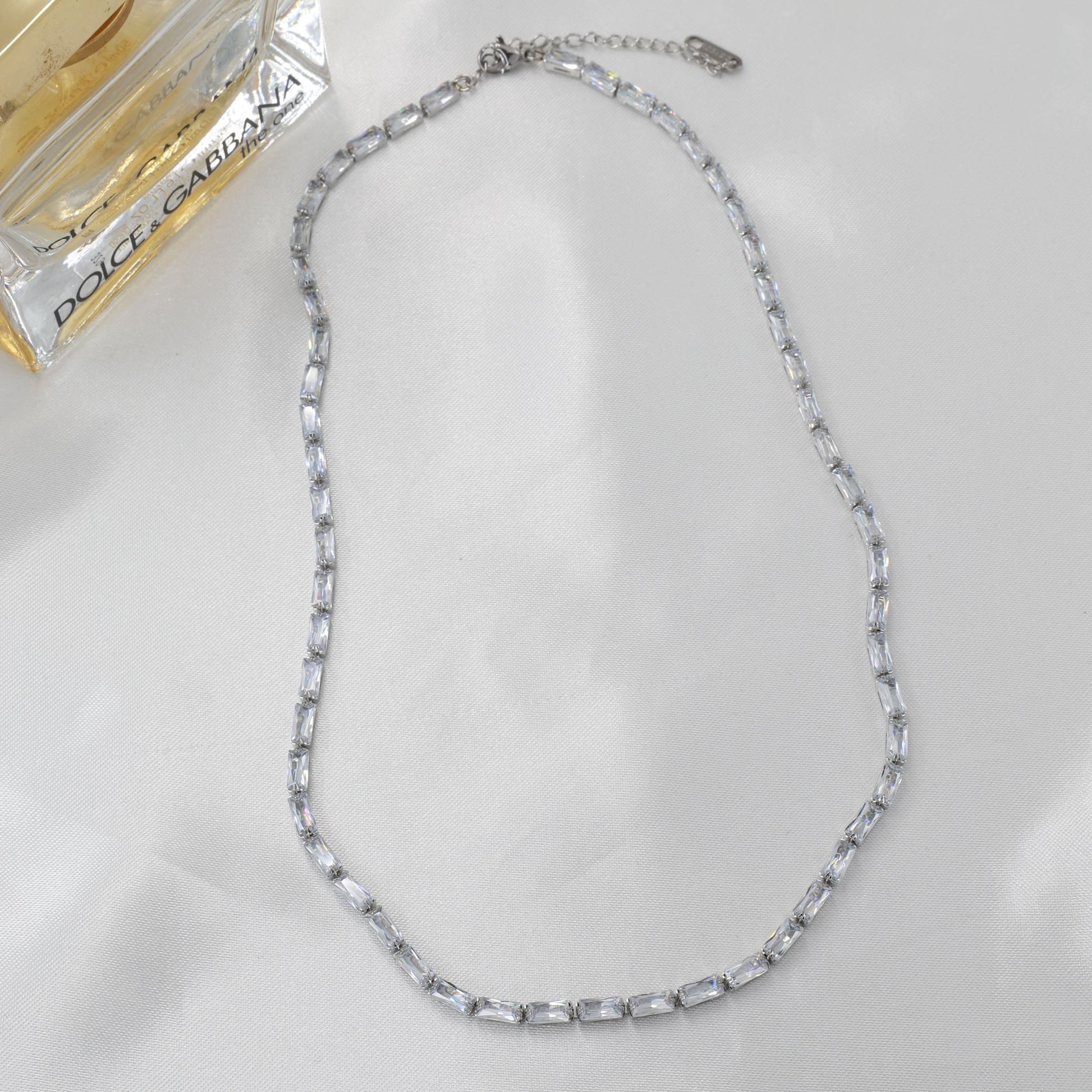 Κολιέ αλυσίδα λαιμού από ανοξείδωτο ατσάλι σε ασημί χρώμα, διακοσμημένο με λαμπερές λευκές πέτρες Baguette Zircon που χαρίζουν εκθαμβωτική λάμψη και κομψότητα στο κόσμημα. Η λεπτή αλυσίδα λαιμού προσφέρει διακριτική φινέτσα, ενώ η ανθεκτική κατασκευή από ανοξείδωτο ατσάλι εξασφαλίζει διαχρονική λάμψη και καθημερινή χρήση. Ένα εκλεπτυσμένο κόσμημα που μπορεί να φορεθεί μόνο του ή να συνδυαστεί με άλλα αξεσουάρ, ολοκληρώνοντας κάθε εμφάνιση με στυλ και διακριτική πολυτέλεια.
