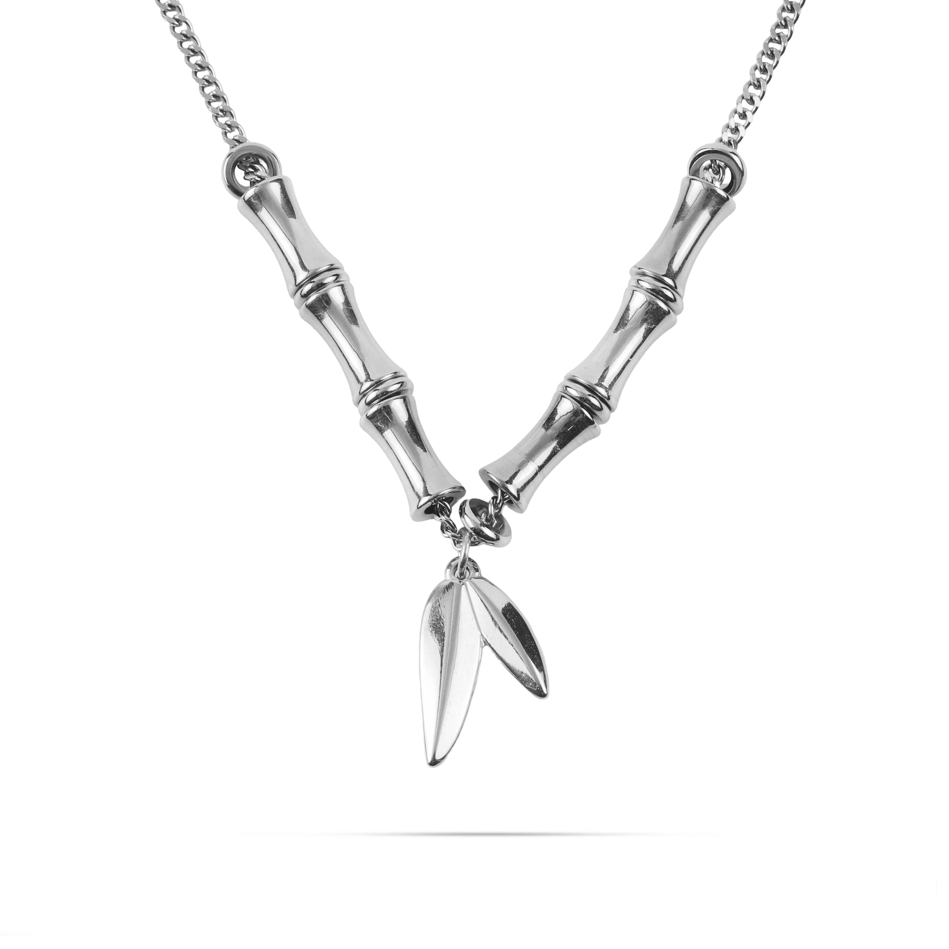 Κολιέ από ανοξείδωτο ατσάλι σε ασημί χρώμα, με περίτεχνο μενταγιόν σε σχέδιο φύλλων. Το μενταγιόν έχει λεπτομερή σχεδιασμό που προσθέτει μια μοναδική και εκλεπτυσμένη πινελιά κομψότητας στο ντύσιμό σας. Κατασκευασμένο από ανοξείδωτο ατσάλι, είναι ανθεκτικό και ιδανικό για καθημερινή χρήση αλλά και για πιο ιδιαίτερες περιστάσεις. Ένα κομψό και διαχρονικό κόσμημα που αποτελεί επίσης μια εξαιρετική επιλογή για δώρο.