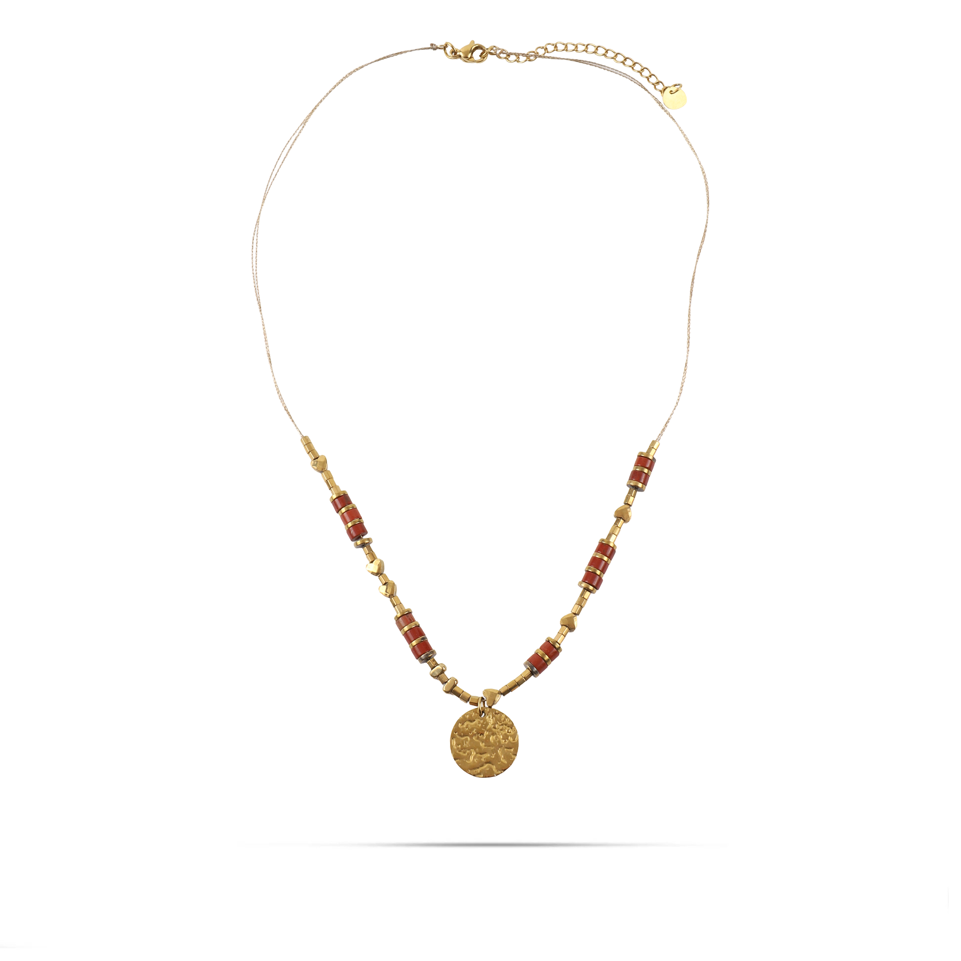 Το κολιέ Mar and Mar Cytherea συνδυάζει τη γοητεία του vintage στυλ με μοντέρνες λεπτομέρειες. Διαθέτει μπορντό χάντρες και μενταγιόν σε σχήμα σφυρηλάτου φλουριού, δημιουργώντας ένα κόσμημα με έντονη προσωπικότητα και ρομαντική αισθητική.