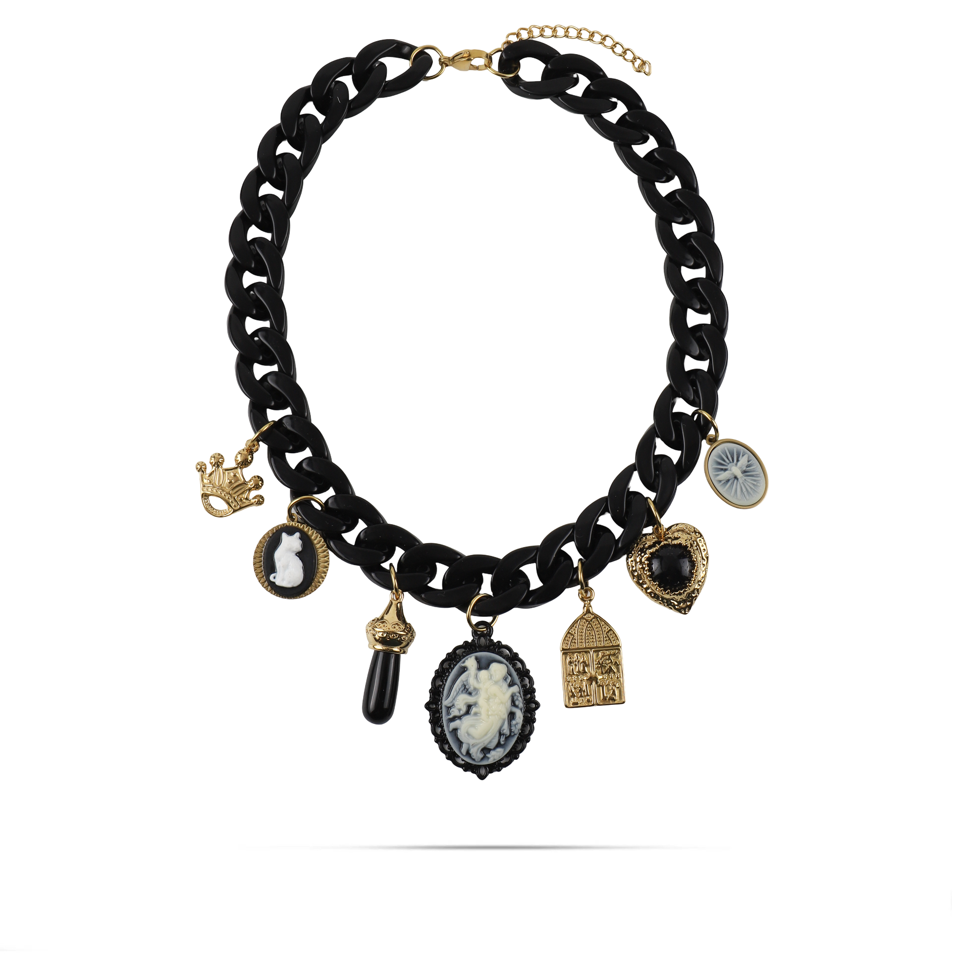 Το κολιέ Mar and Mar Belinda από διπλά επιχρυσωμένο 18Κ ορείχαλκο είναι ένα εντυπωσιακό statement κόσμημα με μαύρη κοκκάλινη αλυσίδα και κρεμαστά charms που αποπνέουν bohemian–βικτωριανή αισθητική. Ο συνδυασμός των υλικών και των λεπτομερειών δημιουργεί ένα κομψό αλλά και εκφραστικό αποτέλεσμα, ιδανικό για γυναίκες που αγαπούν τα ιδιαίτερα, μοναδικά αξεσουάρ. Ένα κόσμημα που ξεχωρίζει και ολοκληρώνει κάθε εμφάνιση με στυλ.
