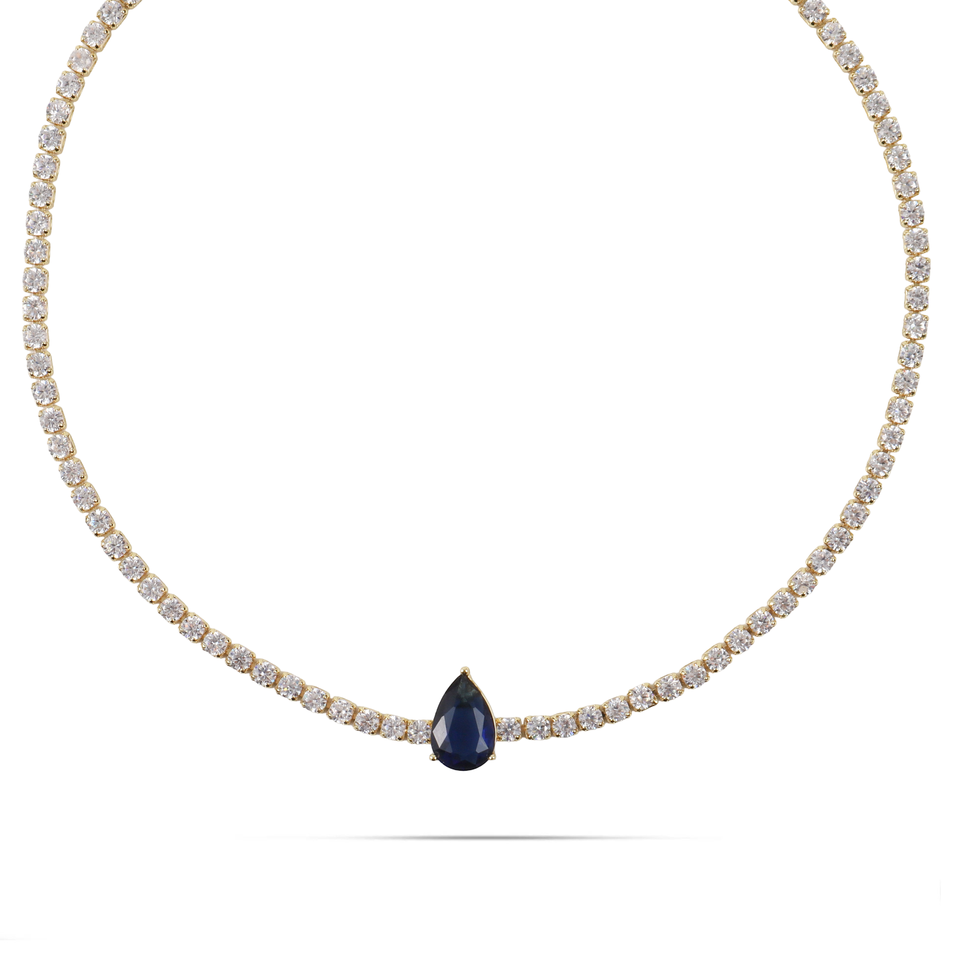 Κολιέ Choker Tennis Riviera σε χρυσό χρώμα, διακοσμημένο με μικρές λαμπερές λευκές πέτρες Zircon που προσδίδουν κομψή λάμψη και αναδεικνύουν τη μεγάλη μπλε Zircon σε σχήμα δάκρυ στο κέντρο. Ο συνδυασμός του ζεστού χρυσού με τη φωτεινότητα των λευκών πετρών και τη βαθιά μπλε απόχρωση δημιουργεί ένα εκθαμβωτικό και πολυτελές κόσμημα. Ιδανικό για επίσημες εκδηλώσεις, βραδινές εμφανίσεις ή ιδιαίτερες περιστάσεις, αυτό το choker χαρίζει μοναδική λάμψη και στυλ, ολοκληρώνοντας κάθε εμφάνιση με φινέτσα.