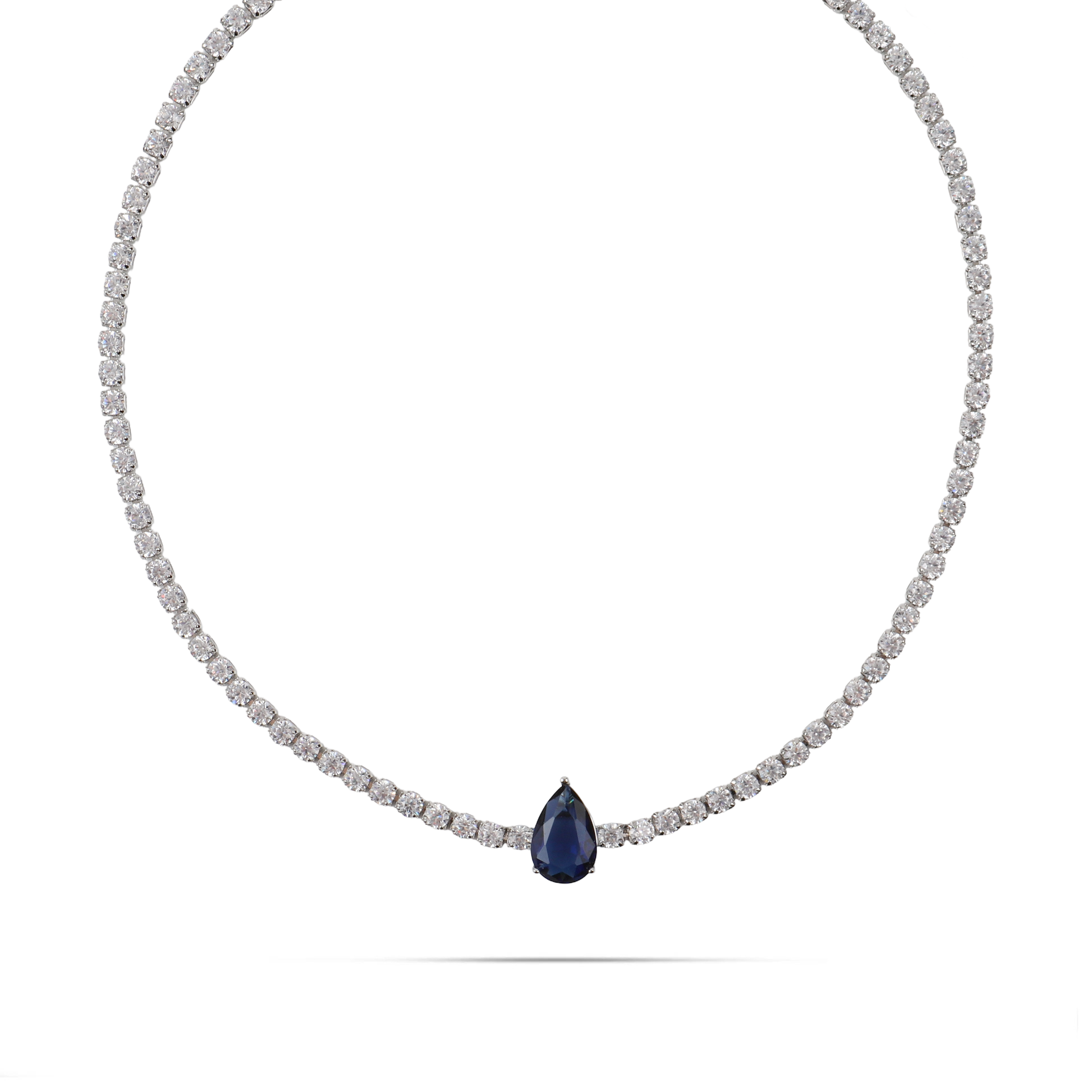 Κολιέ Choker Tennis Riviera σε ασημί χρώμα, διακοσμημένο με μικρές λαμπερές λευκές πέτρες Zircon που προσθέτουν κομψή λάμψη και αναδεικνύουν τη μεγάλη μπλε Zircon σε σχήμα δάκρυ στο κέντρο. Ο συνδυασμός του ασημί μετάλλου με τη φωτεινότητα των λευκών πετρών και τη βαθιά μπλε απόχρωση δημιουργεί ένα εκθαμβωτικό κόσμημα με διαχρονικό χαρακτήρα. Ιδανικό για βραδινές εμφανίσεις, επίσημες εκδηλώσεις ή ειδικές περιστάσεις, το choker αυτό προσφέρει λάμψη, φινέτσα και μοναδικό στυλ σε κάθε εμφάνιση.