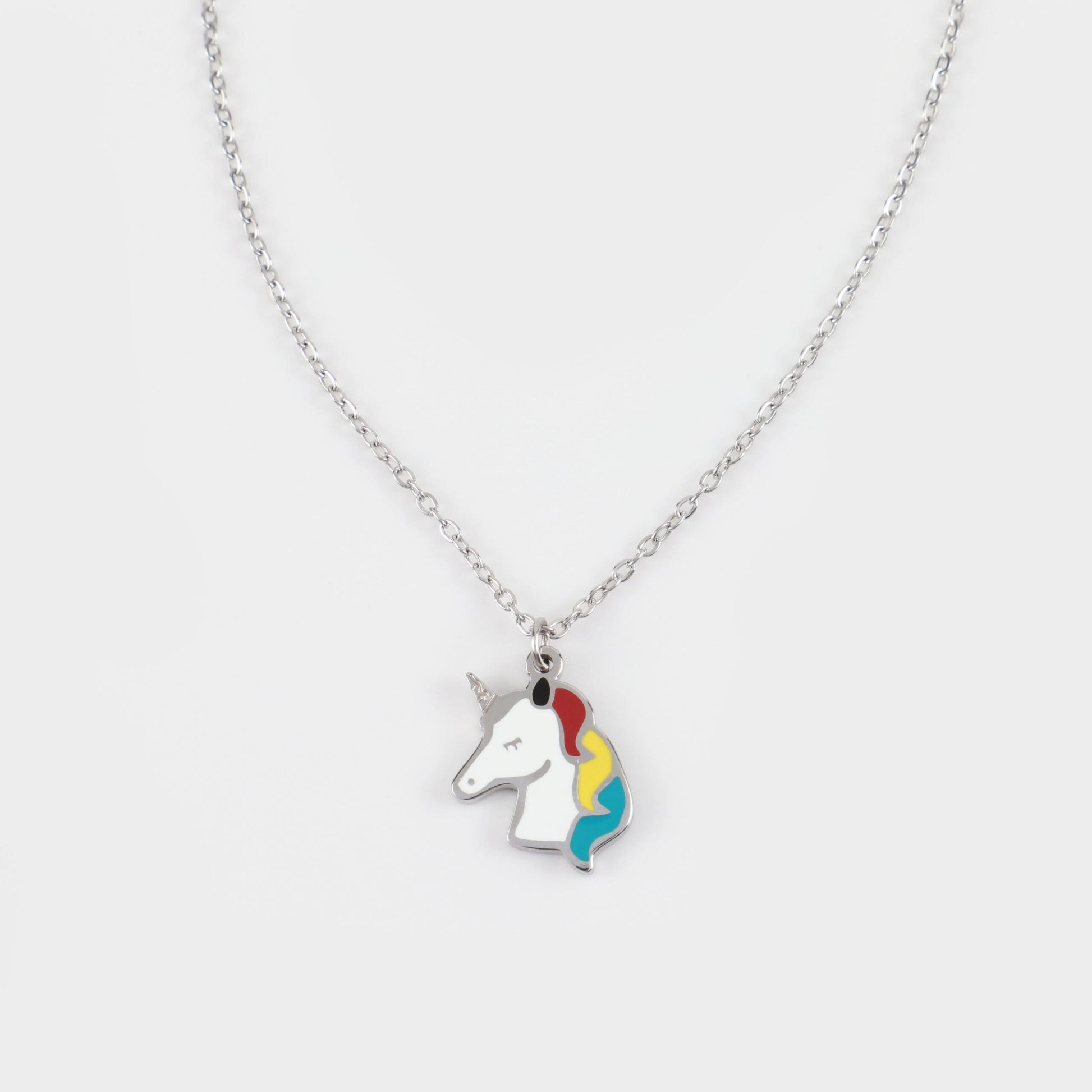 Παιδικό κολιέ από ανοξείδωτο ατσάλι σε λαμπερό ασημί χρώμα, με χαριτωμένο πολύχρωμο μενταγιόν μονόκερο που προσθέτει φαντασία, χαρά και παιχνιδιάρικη διάθεση. Το εντυπωσιακό σχέδιο θα ξετρελάνει κάθε παιδί, ενώ η ανθεκτική κατασκευή εξασφαλίζει καθημερινή χρήση. Ένα ξεχωριστό κόσμημα που συνδυάζει στυλ, χρώμα και μαγεία σε κάθε εμφάνιση!
