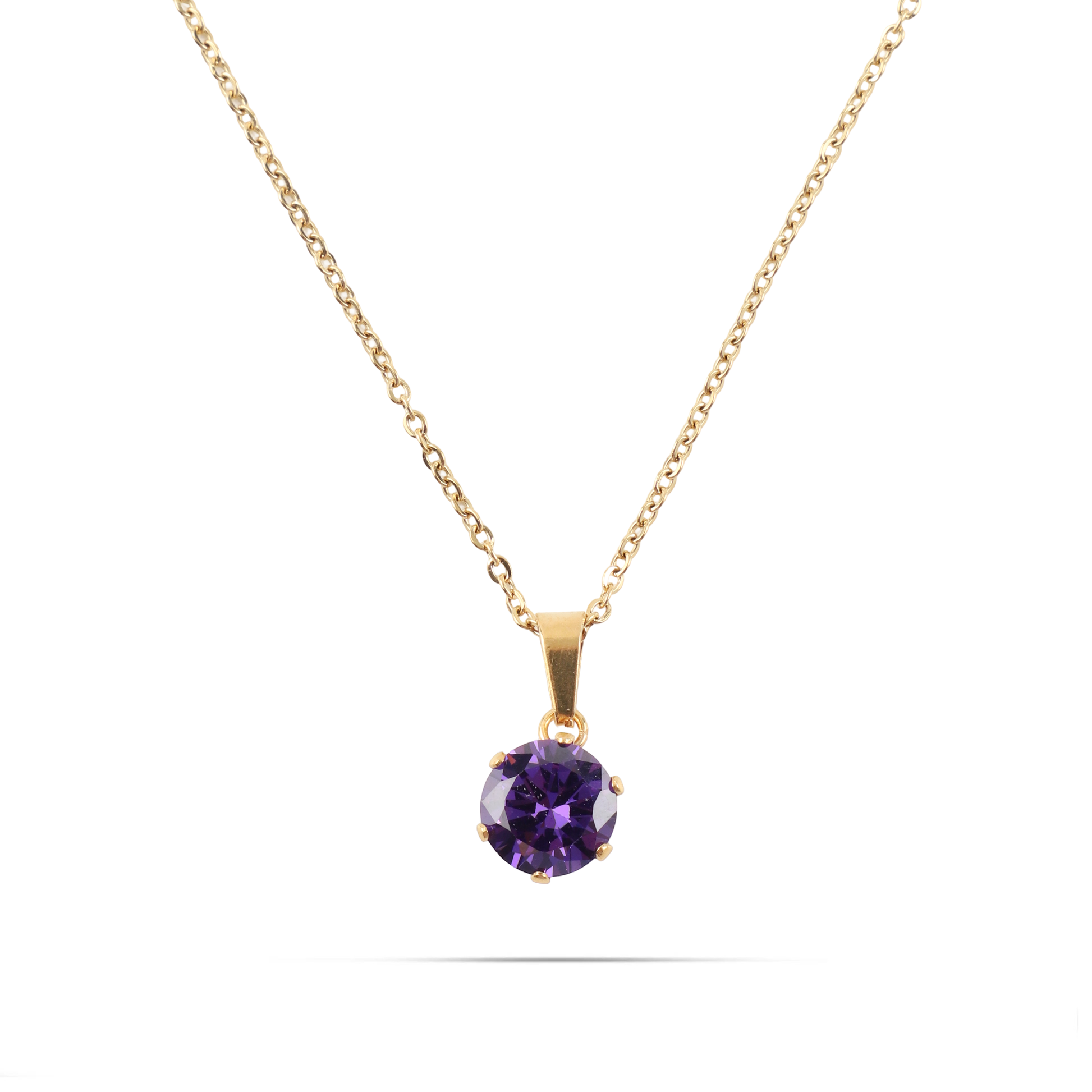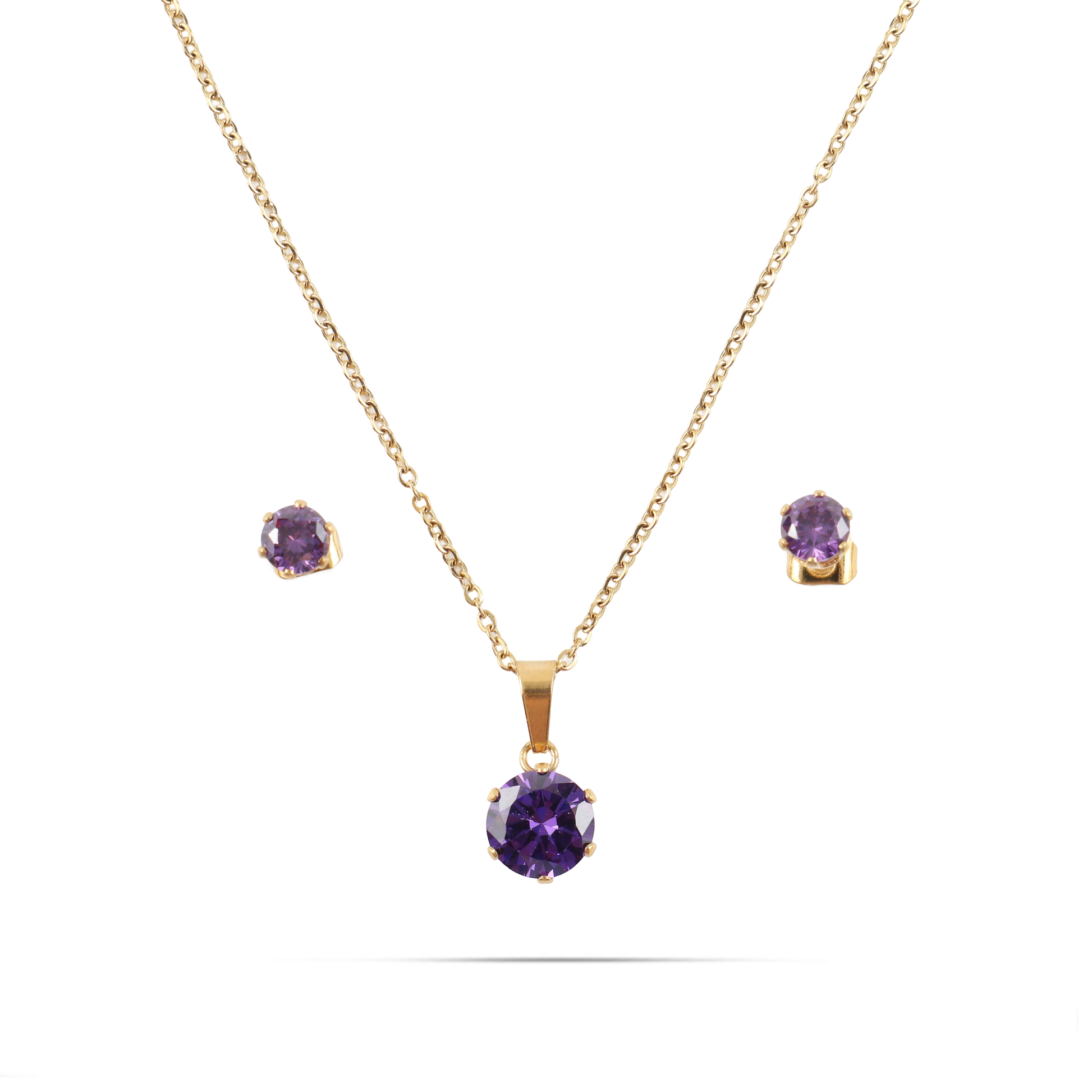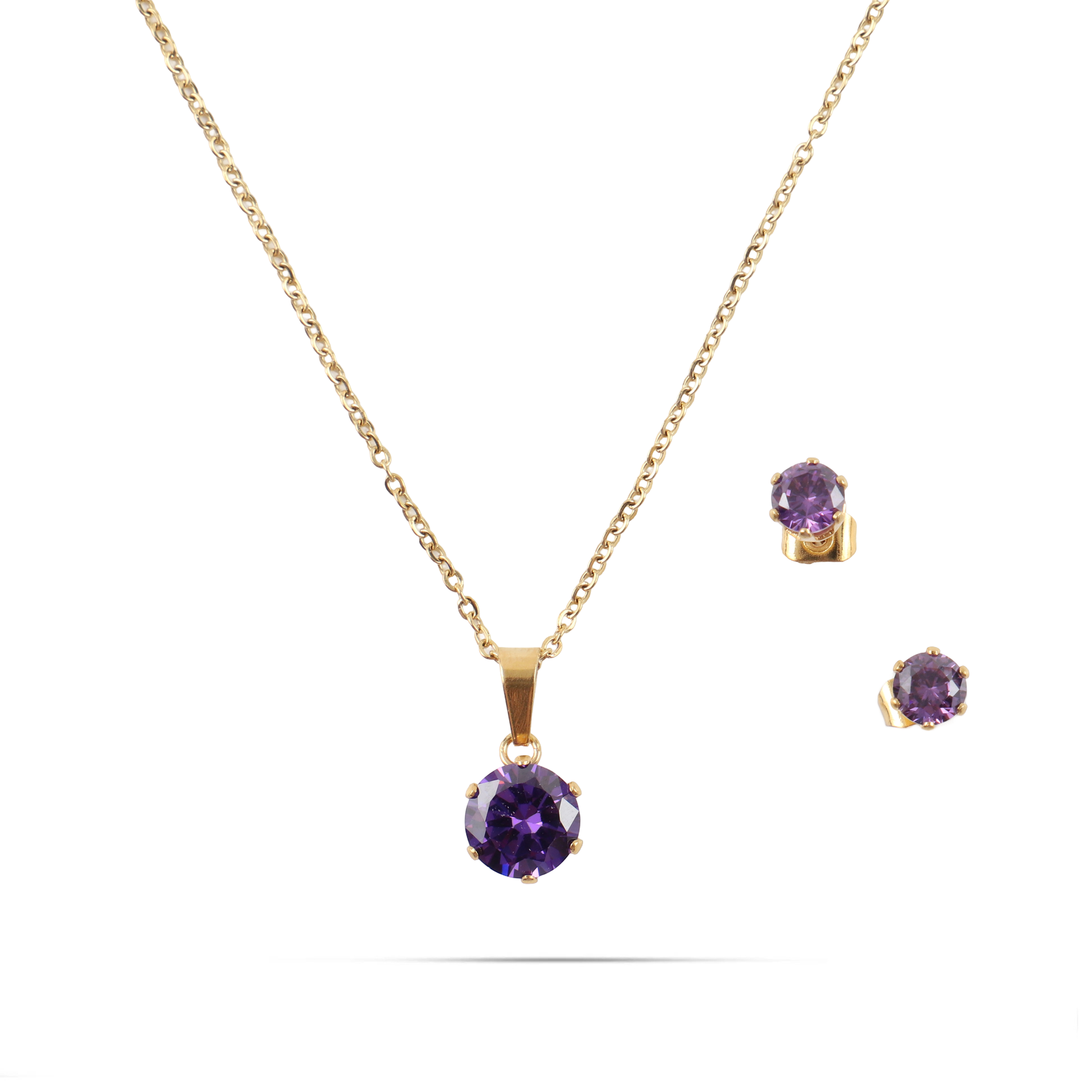 Σετ κολιέ και σκουλαρίκια από ανοξείδωτο ατσάλι σε χρυσό χρώμα. Ένα κομψό και λαμπερό σετ, διακοσμημένο με μωβ πέτρα Zircon που δημιουργεί έναν εκλεπτυσμένο συνδυασμό πολυτέλειας και θηλυκότητας. Η χρυσή απόχρωση αναδεικνύει τη ζεστασιά και τη φινέτσα του κοσμήματος, ιδανικό για σαγηνευτικές εμφανίσεις με διαχρονικό στυλ.
