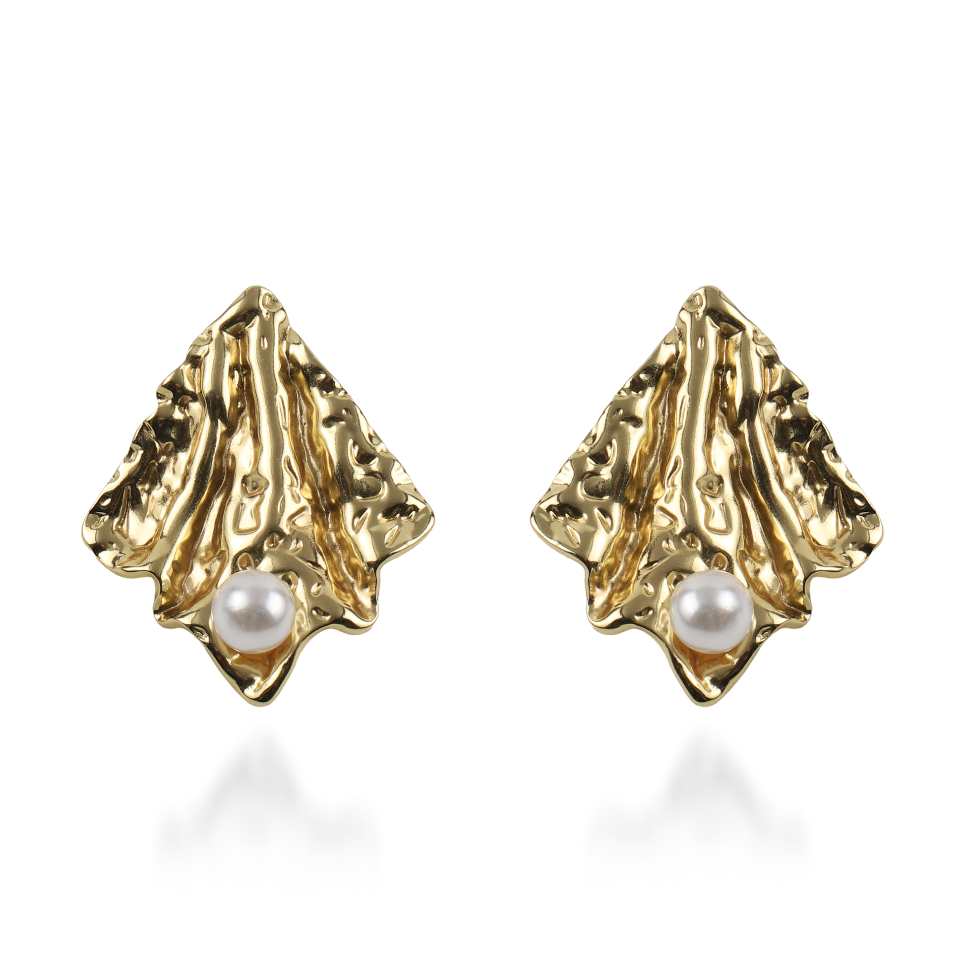 Τα σκουλαρίκια καρφωτά Mar and Mar Nereis σε χρυσό χρώμα αποτελούν ένα κόσμημα υψηλής αισθητικής, με τον οργανικό, σφυρήλατο σχεδιασμό τους να θυμίζει σπάνιο κοχύλι που αναδύεται από τον βυθό. Η ακανόνιστη, ανάγλυφη επιφάνειά τους δημιουργεί ένα εντυπωσιακό παιχνίδισμα με το φως, το οποίο ολοκληρώνεται με μια διακριτική πέρλα στη βάση, προσδίδοντας μια νότα κλασικής πολυτέλειας. Κατασκευασμένα από ανοξείδωτο ατσάλι για μέγιστη ανθεκτικότητα και αναλλοίωτη λάμψη, αποτελούν ένα «sculptural» statement αξεσουάρ που συνδυάζει τη μοντέρνα τέχνη με τη διαχρονική θηλυκότητα. ✨