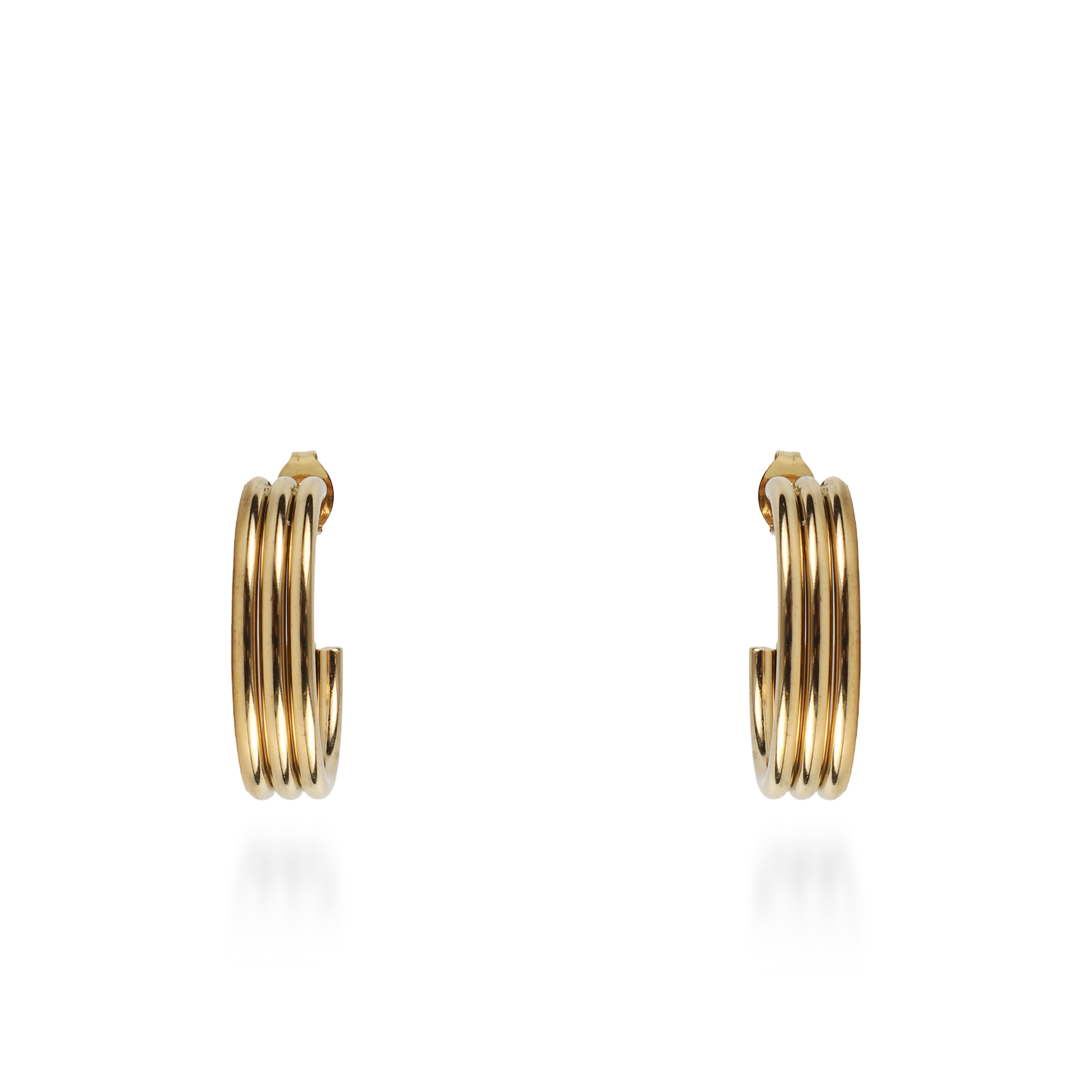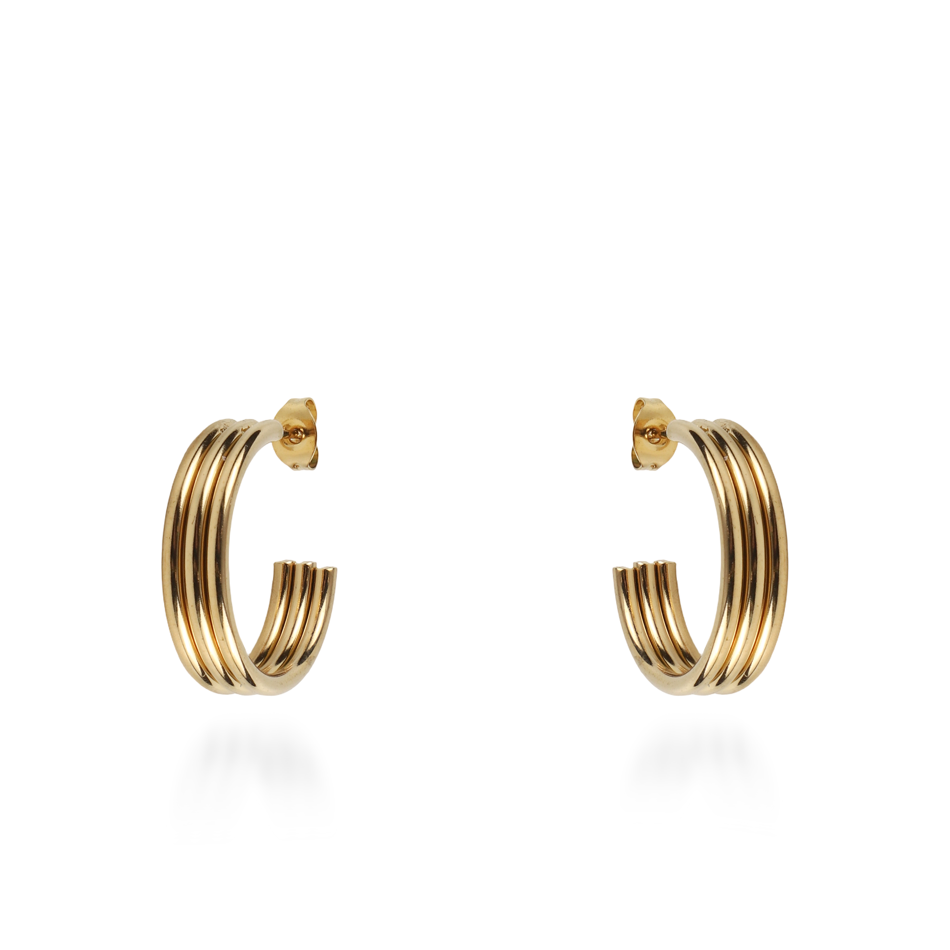 Σκουλαρίκια κρίκοι από ανοξείδωτο ατσάλι με εντυπωσιακό τριπλό σχέδιο που προσφέρουν ένα μοναδικό και εντυπωσιακό στυλ. Η κατασκευή από ανοξείδωτο ατσάλι προσδίδει αντοχή στο κόσμημα, εξασφαλίζοντας ότι θα διατηρήσει την εμφάνισή του για μεγάλο χρονικό διάστημα. Αυτά τα σκουλαρίκια είναι ένα κομψό και εντυπωσιακό κόσμημα που θα προσθέσει λάμψη και στυλ σε κάθε τους εμφάνιση.