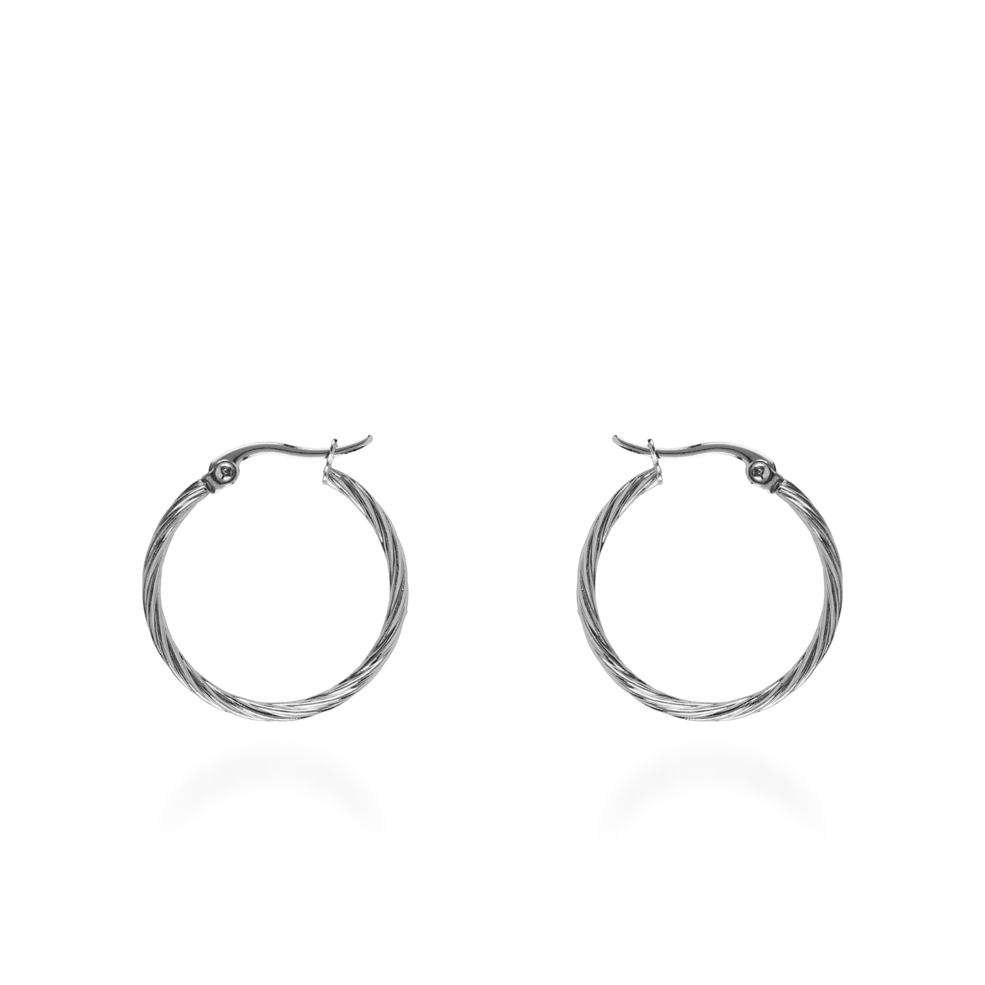 Τα σκουλαρίκια κρίκοι Mar and Mar Jayla σε ασημί χρώμα συνδυάζουν κομψότητα και μοντέρνο ύφος. Κατασκευασμένα από ανοξείδωτο ατσάλι, διαθέτουν διάμετρο 3 cm και στριφογυριστό σχέδιο που προσθέτει μια ιδιαίτερη υφή και λάμψη.