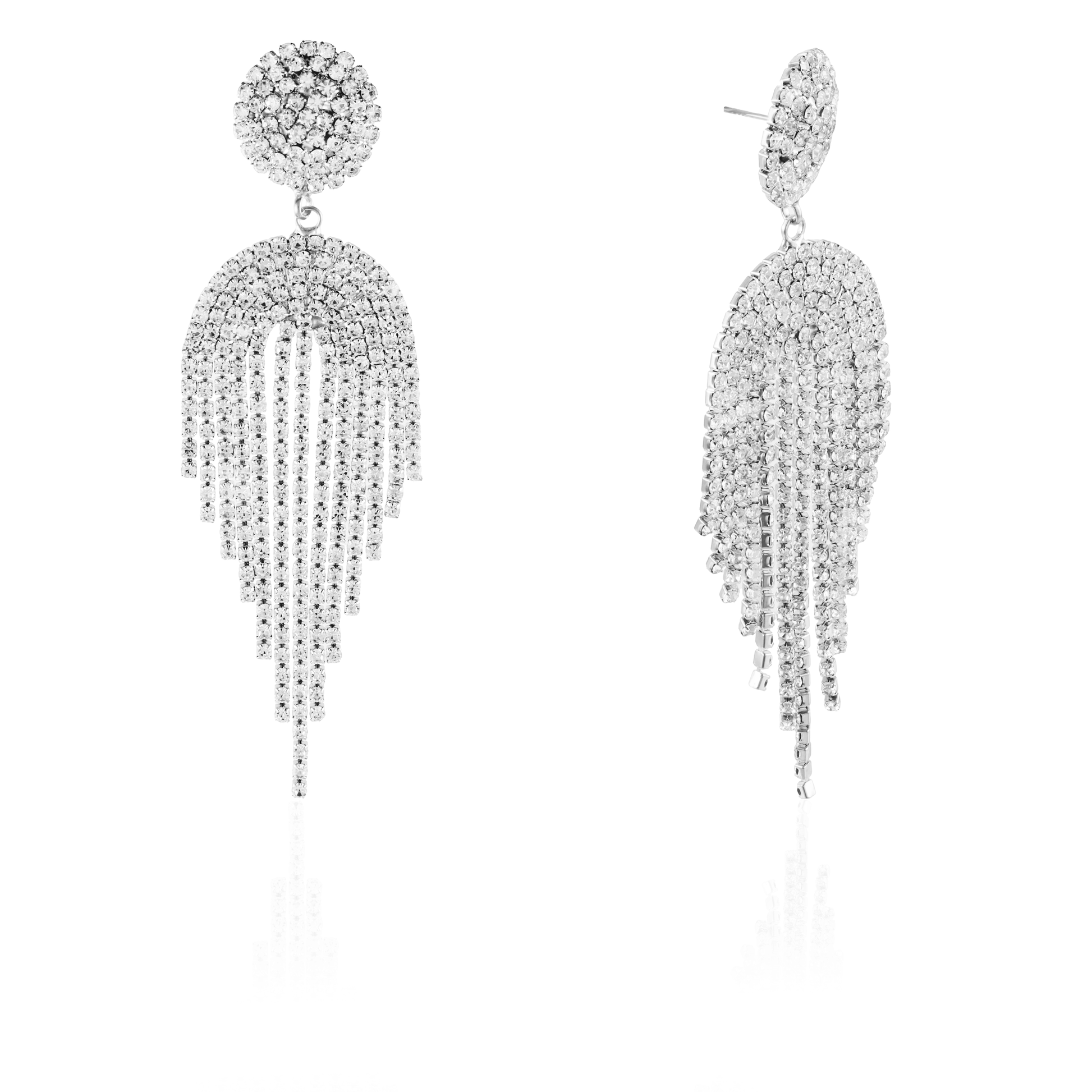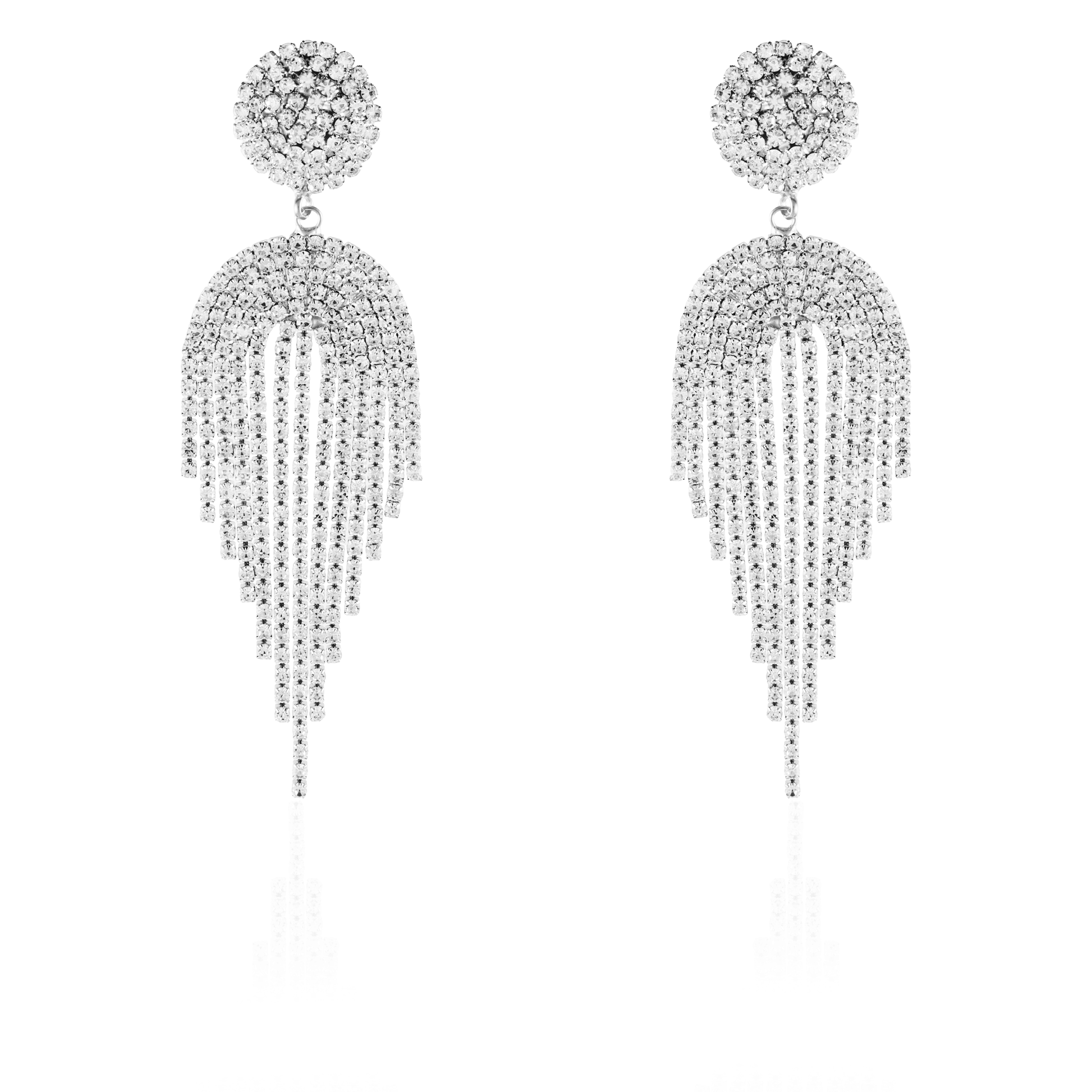 Σκουλαρίκια κρεμαστά από ορείχαλκο σε ασημί χρώμα, με εντυπωσιακό σχέδιο διακοσμημένο με λαμπερές πέτρες Zircon, μια κομψή και λαμπερή επιλογή για να αναδείξετε το στυλ σας. Αυτά τα σκουλαρίκια είναι ιδανικά για ειδικές περιστάσεις, αλλά και για να προσθέσουν μια μοναδική πινελιά λάμψης στην καθημερινή σας εμφάνιση. Ένα εκλεπτυσμένο κόσμημα που συνδυάζει φινέτσα και διαχρονική κομψότητα.