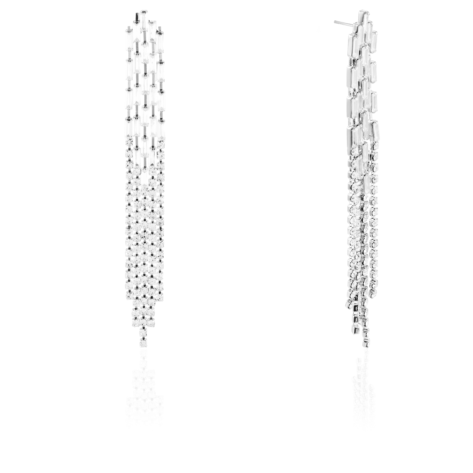 Σκουλαρίκια κρεμαστά από ορείχαλκο σε ασημί χρώμα, διακοσμημένα με λαμπερές πέτρες Zircon και Baguette Zircon, που συνδυάζουν εκθαμβωτική λάμψη με κομψότητα. Αυτά τα σκουλαρίκια αποτελούν μια εξαιρετική επιλογή για κάθε περίσταση, από καθημερινές εμφανίσεις έως επίσημα γεγονότα, προσθέτοντας φινέτσα και στυλ σε κάθε εμφάνιση. Ένα κόσμημα που ολοκληρώνει το ντύσιμό σας με διακριτική πολυτέλεια και μοντέρνα αισθητική.