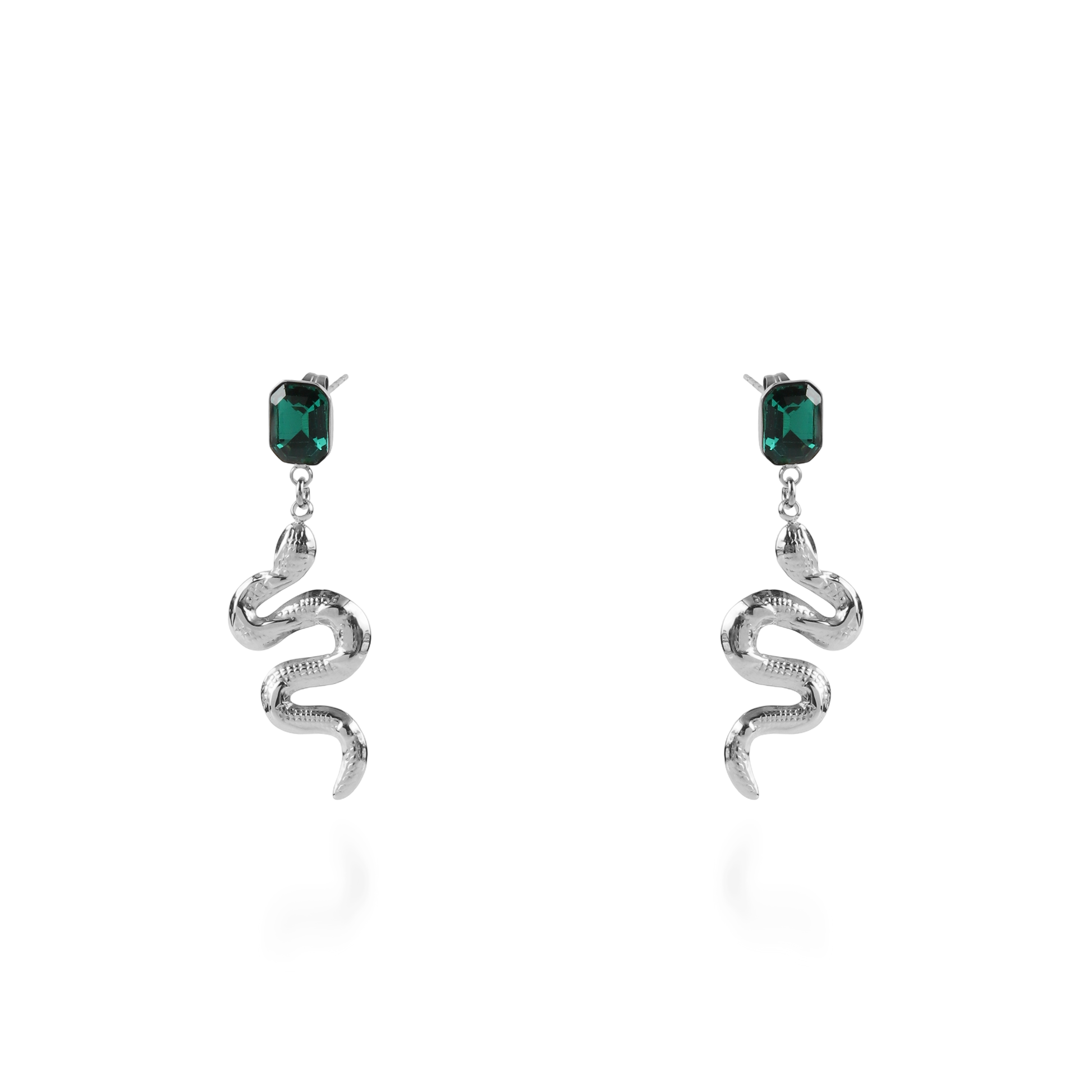 Σκουλαρίκια κρεμαστά από ανοξείδωτο ατσάλι σε ασημί χρώμα, διακοσμημένα με πέτρα Zircon και κρεμαστό φίδι που χαρίζουν ένα ιδιαίτερο και εντυπωσιακό στοιχείο στο στυλ σας. Η λαμπερή πέτρα Zircon προσθέτει φινέτσα, ενώ το κρεμαστό φίδι δίνει μια εκλεπτυσμένη και μοναδική αισθητική. Ένα ζευγάρι σκουλαρίκια που αναδεικνύει κάθε σας εμφάνιση με κομψότητα και δυναμισμό.