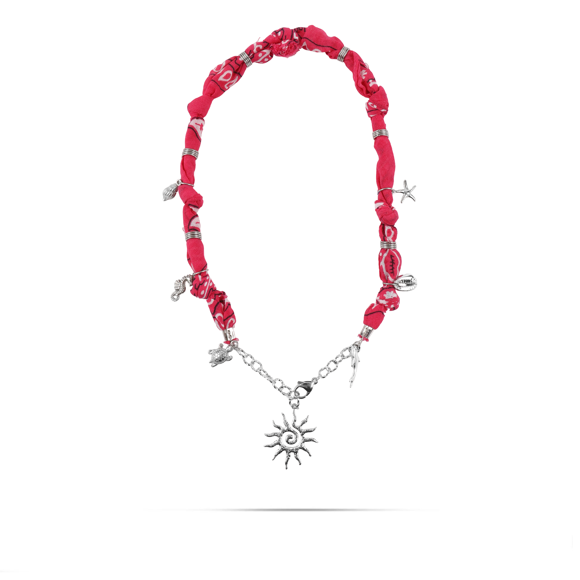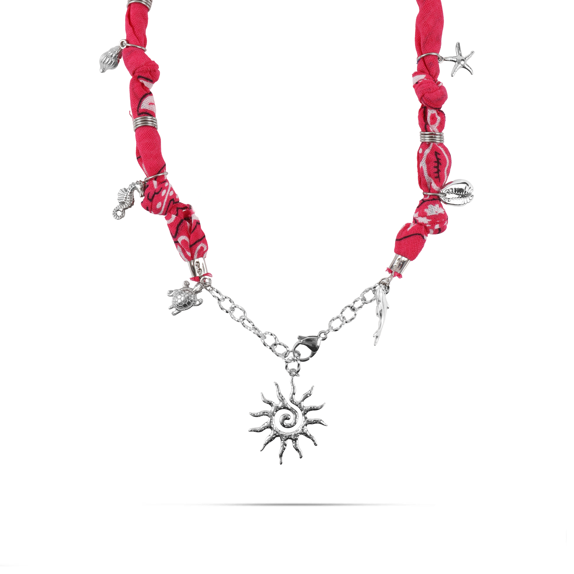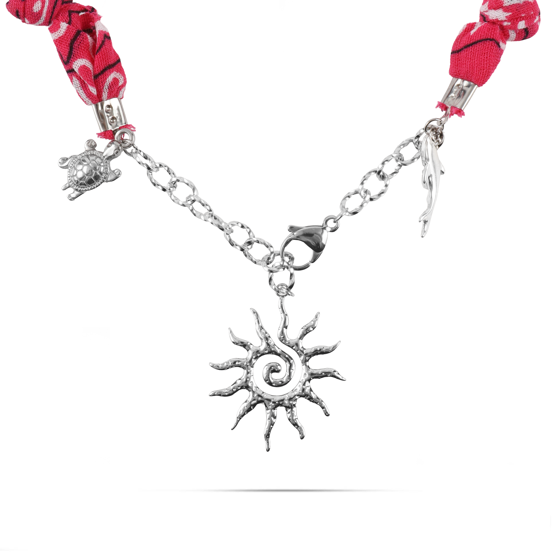 Χειροποίητο κολιέ από μπαντάνα και θαλασσινά στοιχεία Mar and Mar Isaya Sun (Magenta) Silver από ανοξείδωτο ατσάλι
